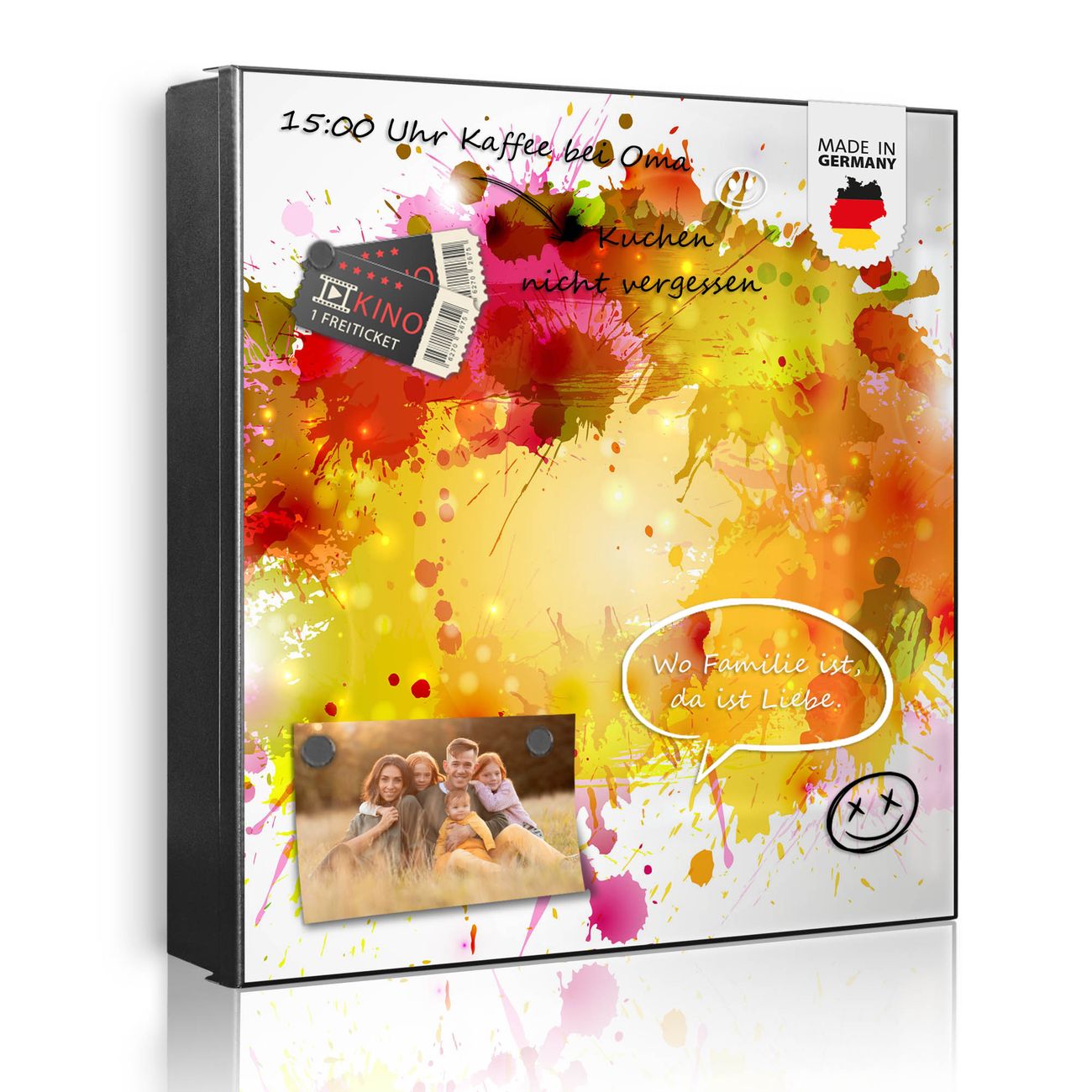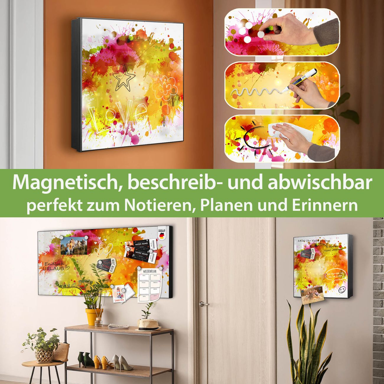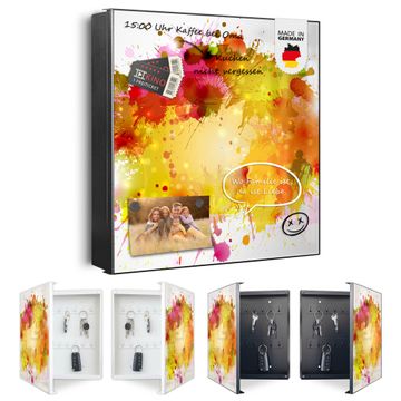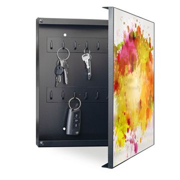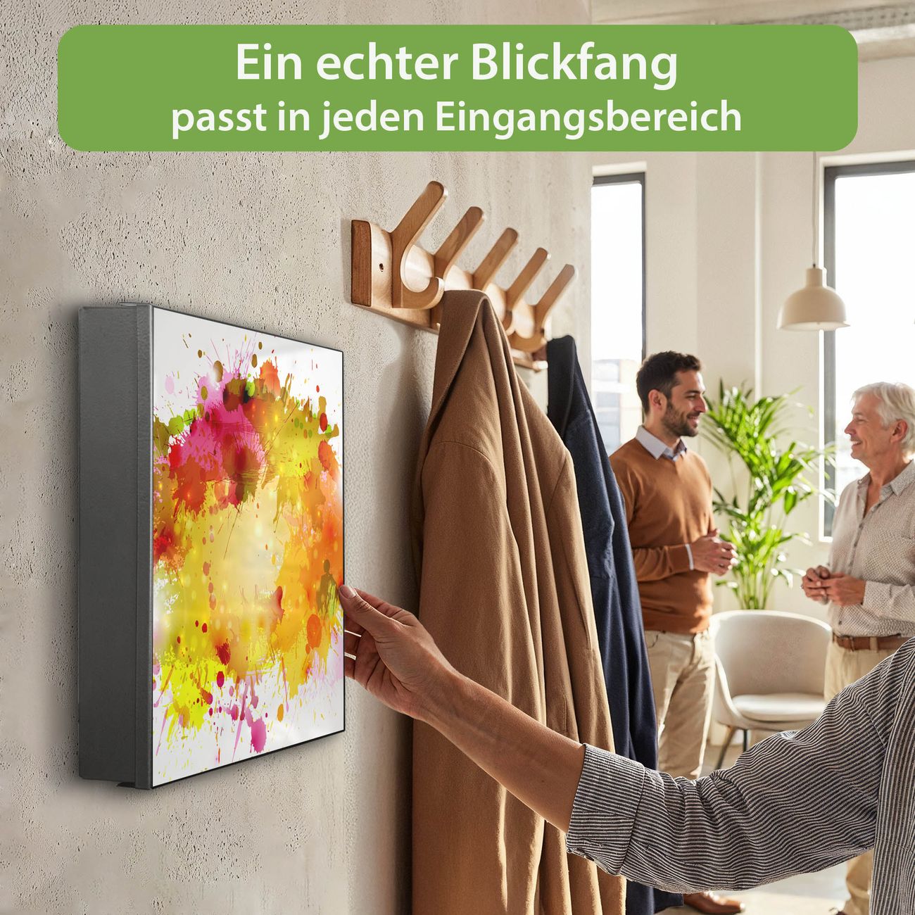 Bringe Ordnung und Eleganz in deinen Eingangsbereich mit dem banjado Schlüsselkasten Motiv Motiv Farbkleckse. Die moderne Schlüsselbox kombiniert funktionales Design mit hochwertiger Verarbeitung und wird so zu einem echten Hingucker in Flur, Büro oder Ferienwohnung. ✅ Stilvolle Schlüsselaufbewahrung mit Motiv Motiv Farbkleckse Der Design-Schlüsselkasten Motiv Motiv Farbkleckse bietet Platz für bis zu 32 Schlüssel, die auf 4 stabilen Reihen mit je 8 Haken übersichtlich verstaut werden. Mit seinen kompakten Maßen von 30 x 30 x 5 cm passt die Schlüsselbox perfekt auch in kleinere Räume. Der schwarz lackierte Stahlkorpus mit rechts angeschlagenem Türscharnier harmoniert mit gedruckten Folie auf der Front und fügt sich nahtlos in jedes Wohnambiente ein. Ob als Schlüsselorganizer für Zuhause oder als praktische Lösung für Büros, Praxen und Gewerbe, der banjado Schlüsselkasten sorgt für Ordnung und Übersicht. Dank der magnetischen, mit Kreidestiften beschreibbaren Folie auf der Front kannst du Notizen anheften oder Termine direkt auf der Oberfläche festhalten. Die Schlüsselbox Motiv Motiv Farbkleckse zur Wandmontage wird inklusive Befestigungsmaterial geliefert und ist schnell angebracht. So hast du deine Schlüssel jederzeit griffbereit und zugleich stilvoll verstaut. Mit diesem banjado Schlüsselkasten Motiv Motiv Farbkleckse kombinierst du praktische Aufbewahrung mit stilvollem Wohndesign. Ob privat oder geschäftlich, die Schlüsselbox sorgt für mehr Ordnung, Übersicht und ein wohnliches Ambiente.Vorteile im Überblick