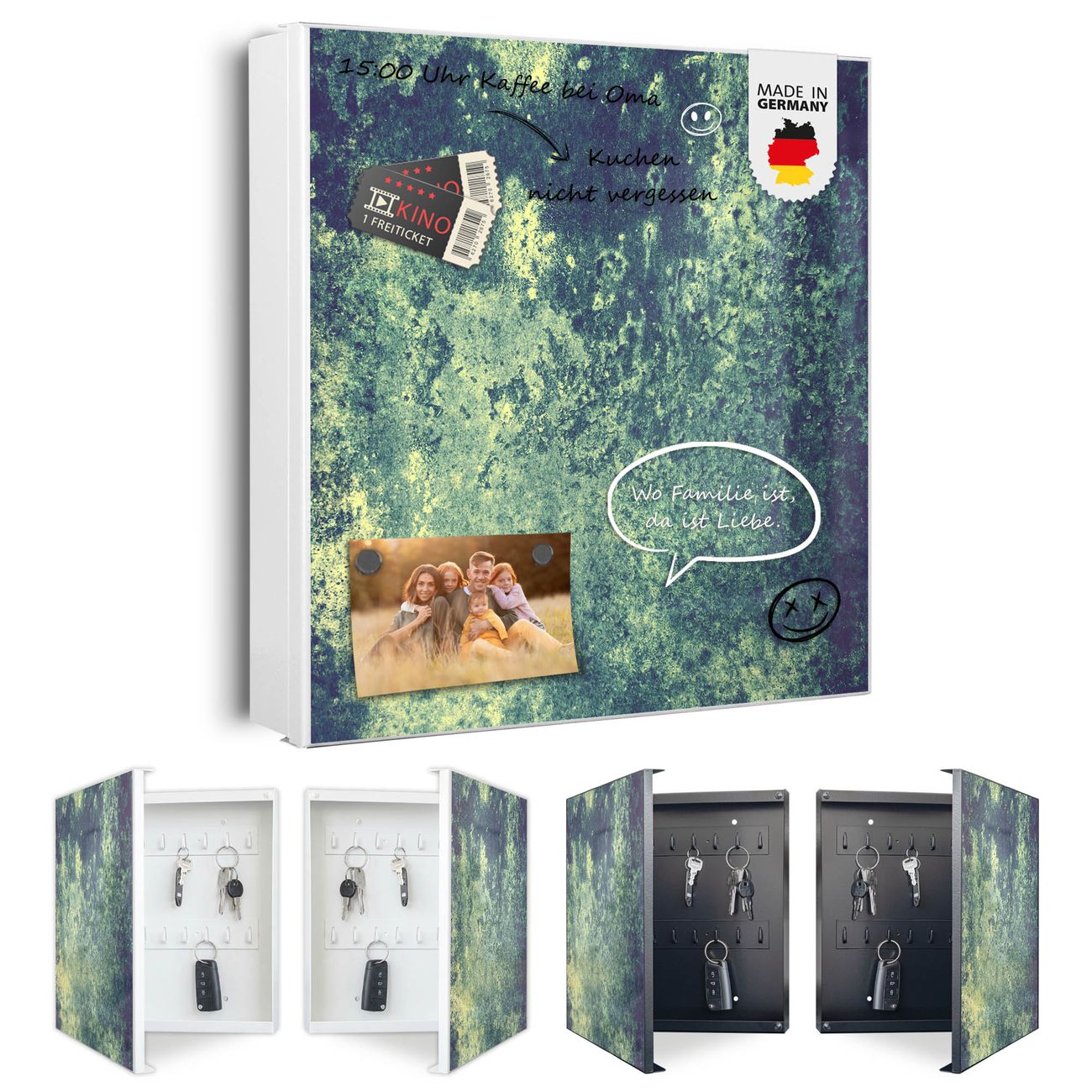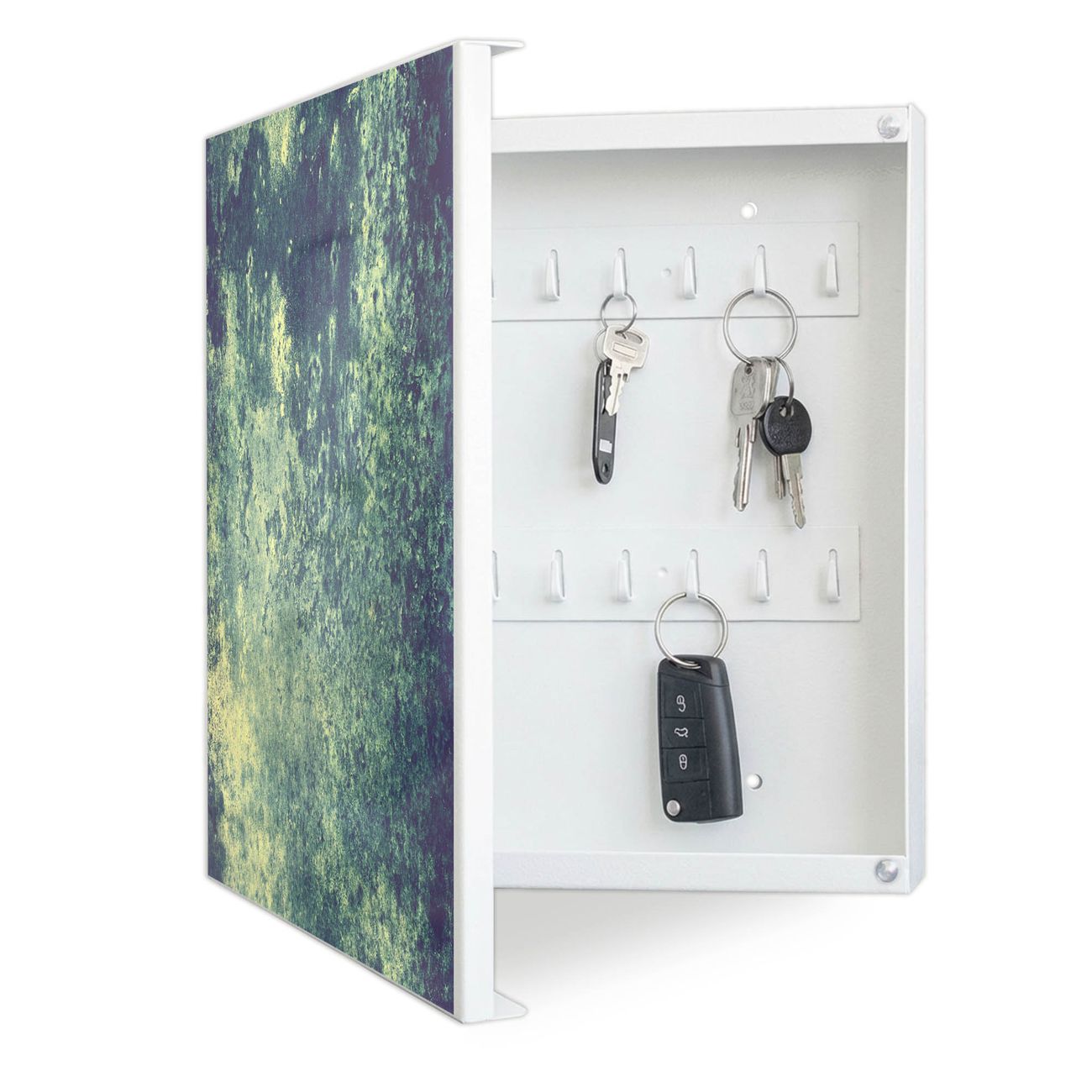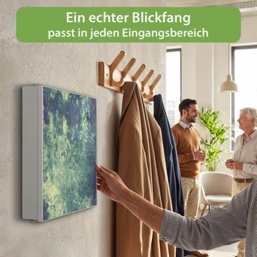 Bringe Ordnung und Eleganz in deinen Eingangsbereich mit dem banjado Schlüsselkasten Motiv Motiv Farbuniversum. Die moderne Schlüsselbox kombiniert funktionales Design mit hochwertiger Verarbeitung und wird so zu einem echten Hingucker in Flur, Büro oder Ferienwohnung. ✅ Stilvolle Schlüsselaufbewahrung mit Motiv Motiv Farbuniversum Der Design-Schlüsselkasten Motiv Motiv Farbuniversum bietet Platz für bis zu 32 Schlüssel, die auf 4 stabilen Reihen mit je 8 Haken übersichtlich verstaut werden. Mit seinen kompakten Maßen von 30 x 30 x 5 cm passt die Schlüsselbox perfekt auch in kleinere Räume. Der weiß lackierte Stahlkorpus mit links angeschlagenem Türscharnier harmoniert mit gedruckten Folie auf der Front und fügt sich nahtlos in jedes Wohnambiente ein. Ob als Schlüsselorganizer für Zuhause oder als praktische Lösung für Büros, Praxen und Gewerbe, der banjado Schlüsselkasten sorgt für Ordnung und Übersicht. Dank der magnetischen, mit Kreidestiften beschreibbaren Folie auf der Front kannst du Notizen anheften oder Termine direkt auf der Oberfläche festhalten. Die Schlüsselbox Motiv Motiv Farbuniversum zur Wandmontage wird inklusive Befestigungsmaterial geliefert und ist schnell angebracht. So hast du deine Schlüssel jederzeit griffbereit und zugleich stilvoll verstaut. Mit diesem banjado Schlüsselkasten Motiv Motiv Farbuniversum kombinierst du praktische Aufbewahrung mit stilvollem Wohndesign. Ob privat oder geschäftlich, die Schlüsselbox sorgt für mehr Ordnung, Übersicht und ein wohnliches Ambiente.Vorteile im Überblick
