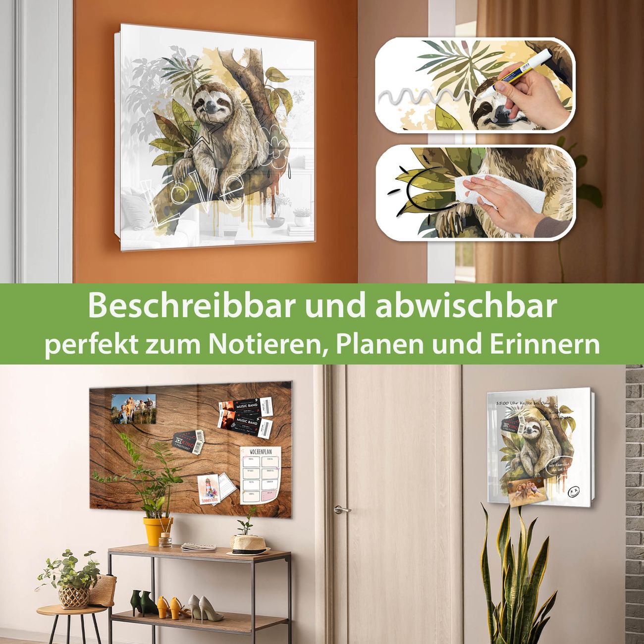 Bringe Ordnung und Eleganz in deinen Eingangsbereich mit dem banjado Schlüsselkasten Motiv Motiv Faultier im Baum. Die moderne Schlüsselbox kombiniert funktionales Design mit hochwertiger Verarbeitung und wird so zu einem echten Hingucker in Flur, Büro oder Ferienwohnung. ✅ Stilvolle Schlüsselaufbewahrung mit Glasfront im Motiv Motiv Faultier im Baum Der Design-Schlüsselkasten Motiv Motiv Faultier im Baum bietet Platz für bis zu 50 Schlüssel, die auf 5 stabilen Reihen mit je 10 Haken übersichtlich verstaut werden. Mit seinen kompakten Maßen von 30 x 30 x 5 cm passt die Schlüsselbox perfekt auch in kleinere Räume. Der weiß lackierte Stahlkorpus mit rechts angeschlagenem Türscharnier harmoniert mit der Glasfront und fügt sich nahtlos in jedes Wohnambiente ein. Ob als Schlüsselorganizer für Zuhause oder als praktische Lösung für Büros, Praxen und Gewerbe, der banjado Schlüsselkasten sorgt für Ordnung und Übersicht. Dank der magnetischen, mit Kreidestiften beschreibbaren Glasfront kannst du Notizen anheften oder Termine direkt auf der Oberfläche festhalten. Die Schlüsselbox Motiv Motiv Faultier im Baum zur Wandmontage wird inklusive Befestigungsmaterial geliefert und ist schnell angebracht. So hast du deine Schlüssel jederzeit griffbereit und zugleich stilvoll verstaut. Mit diesem banjado Schlüsselkasten Motiv Motiv Faultier im Baum kombinierst du praktische Aufbewahrung mit stilvollem Wohndesign. Ob privat oder geschäftlich, die Schlüsselbox sorgt für mehr Ordnung, Übersicht und ein wohnliches Ambiente.Vorteile im Überblick