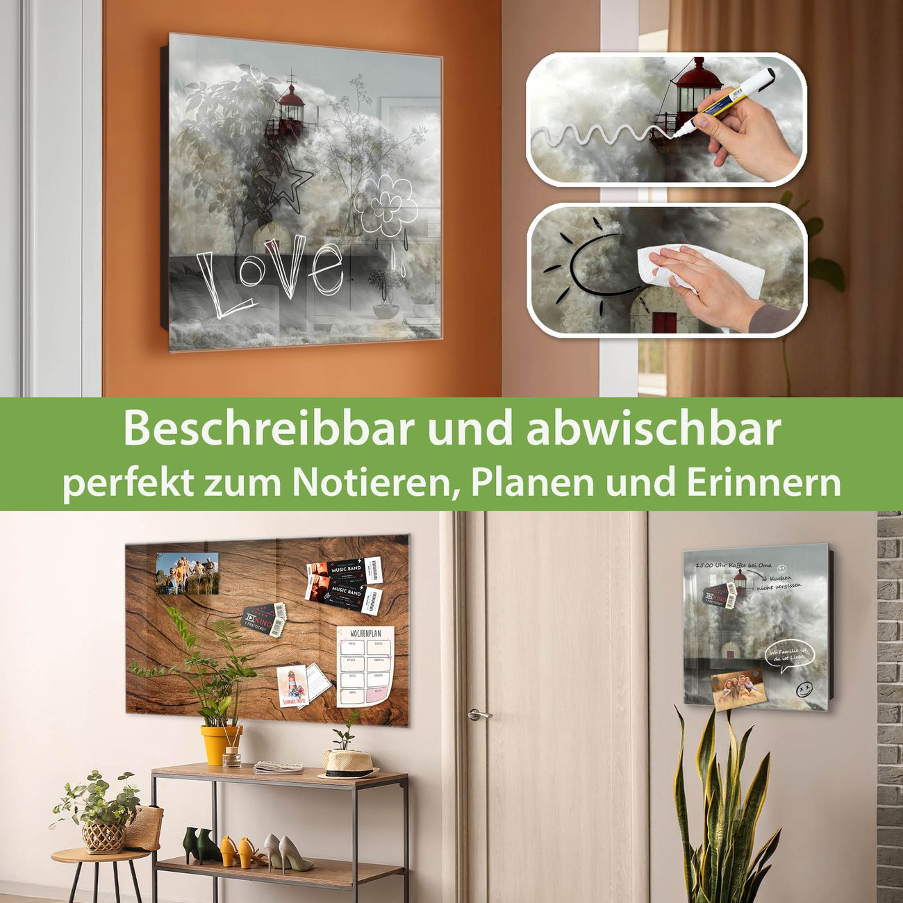 Bringe Ordnung und Eleganz in deinen Eingangsbereich mit dem banjado Schlüsselkasten Motiv Motiv Fels In Der Brandung. Die moderne Schlüsselbox kombiniert funktionales Design mit hochwertiger Verarbeitung und wird so zu einem echten Hingucker in Flur, Büro oder Ferienwohnung. ✅ Stilvolle Schlüsselaufbewahrung mit Glasfront im Motiv Motiv Fels In Der Brandung Der Design-Schlüsselkasten Motiv Motiv Fels In Der Brandung bietet Platz für bis zu 50 Schlüssel, die auf 5 stabilen Reihen mit je 10 Haken übersichtlich verstaut werden. Mit seinen kompakten Maßen von 30 x 30 x 5 cm passt die Schlüsselbox perfekt auch in kleinere Räume. Der schwarz lackierte Stahlkorpus mit rechts angeschlagenem Türscharnier harmoniert mit der Glasfront und fügt sich nahtlos in jedes Wohnambiente ein. Ob als Schlüsselorganizer für Zuhause oder als praktische Lösung für Büros, Praxen und Gewerbe, der banjado Schlüsselkasten sorgt für Ordnung und Übersicht. Dank der magnetischen, mit Kreidestiften beschreibbaren Glasfront kannst du Notizen anheften oder Termine direkt auf der Oberfläche festhalten. Die Schlüsselbox Motiv Motiv Fels In Der Brandung zur Wandmontage wird inklusive Befestigungsmaterial geliefert und ist schnell angebracht. So hast du deine Schlüssel jederzeit griffbereit und zugleich stilvoll verstaut. Mit diesem banjado Schlüsselkasten Motiv Motiv Fels In Der Brandung kombinierst du praktische Aufbewahrung mit stilvollem Wohndesign. Ob privat oder geschäftlich, die Schlüsselbox sorgt für mehr Ordnung, Übersicht und ein wohnliches Ambiente.Vorteile im Überblick