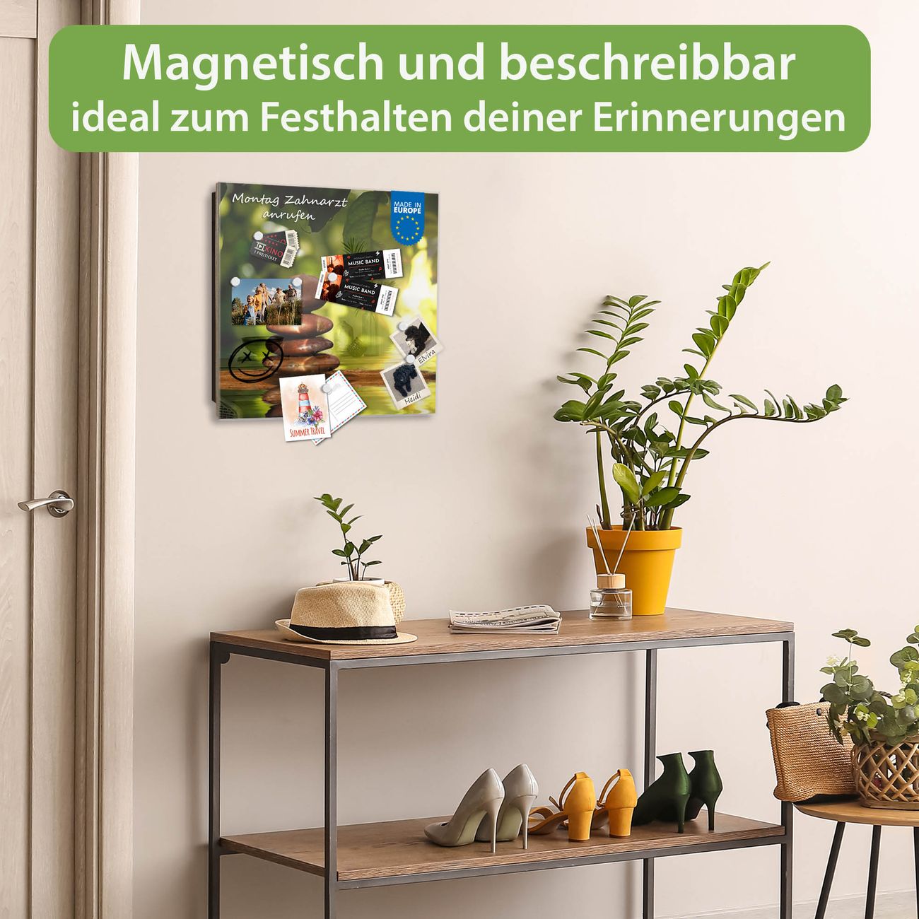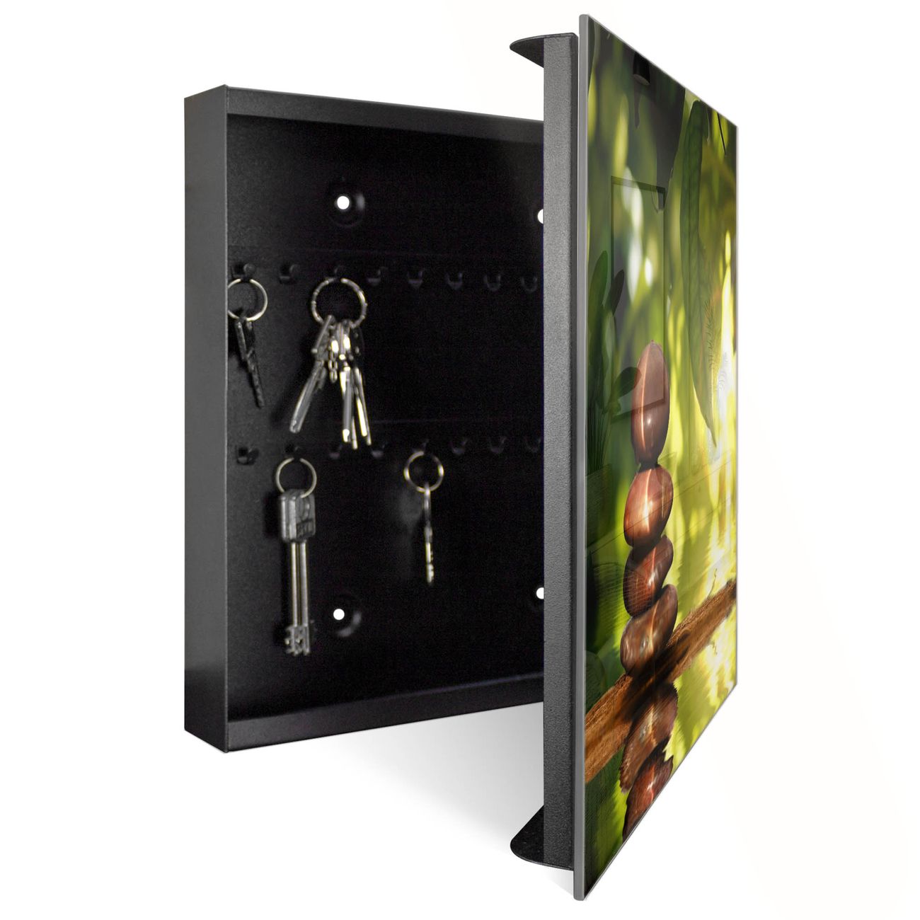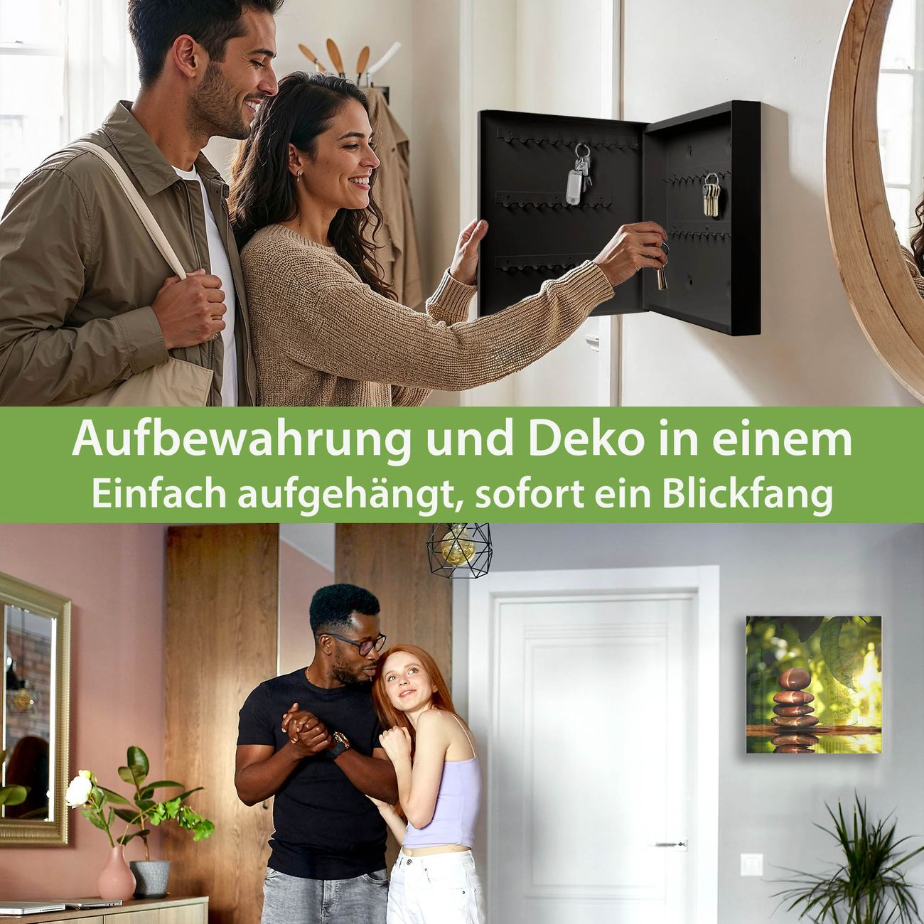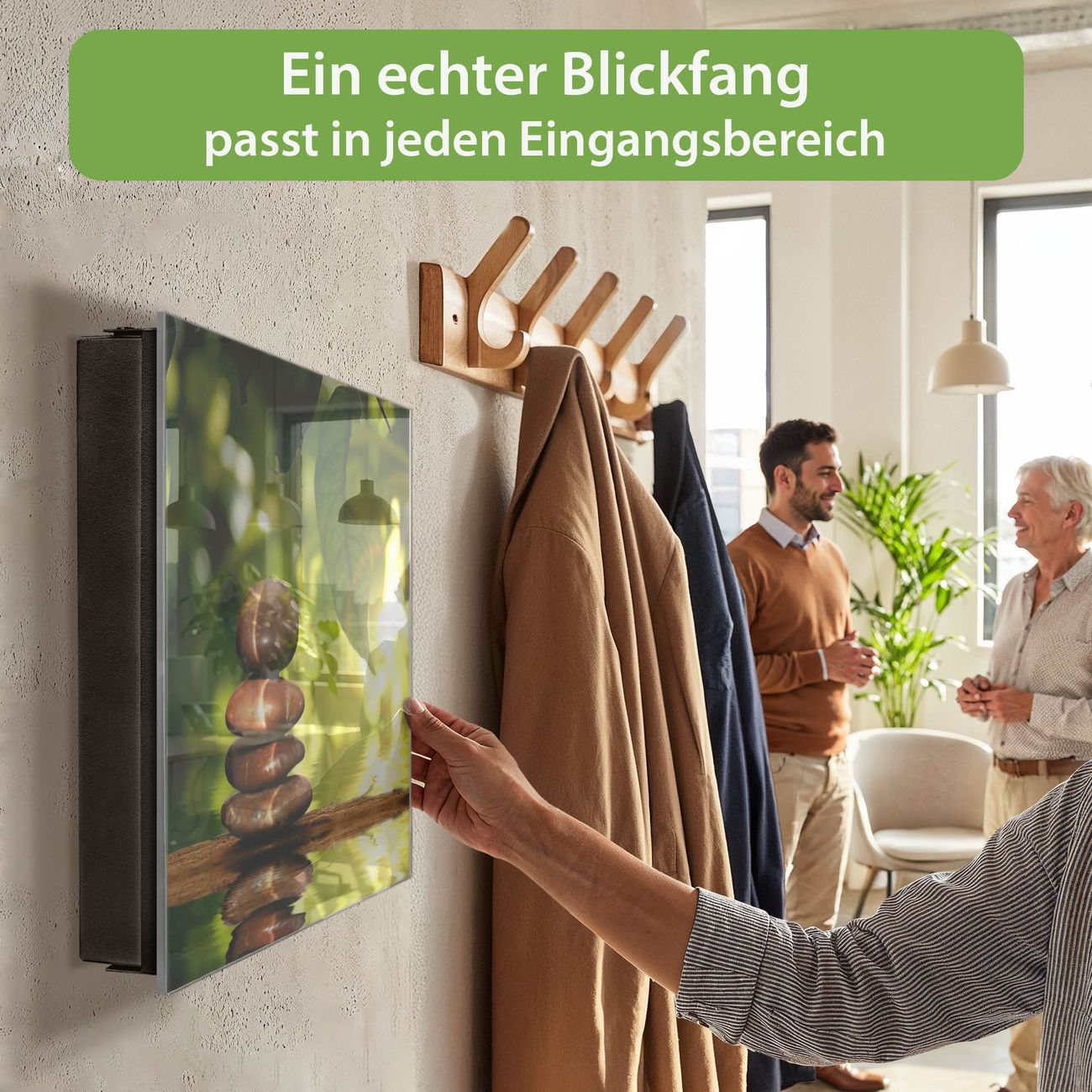 Bringe Ordnung und Eleganz in deinen Eingangsbereich mit dem banjado Schlüsselkasten Motiv Motiv Feng Shui. Die moderne Schlüsselbox kombiniert funktionales Design mit hochwertiger Verarbeitung und wird so zu einem echten Hingucker in Flur, Büro oder Ferienwohnung. ✅ Stilvolle Schlüsselaufbewahrung mit Glasfront im Motiv Motiv Feng Shui Der Design-Schlüsselkasten Motiv Motiv Feng Shui bietet Platz für bis zu 50 Schlüssel, die auf 5 stabilen Reihen mit je 10 Haken übersichtlich verstaut werden. Mit seinen kompakten Maßen von 30 x 30 x 5 cm passt die Schlüsselbox perfekt auch in kleinere Räume. Der schwarz lackierte Stahlkorpus mit rechts angeschlagenem Türscharnier harmoniert mit der Glasfront und fügt sich nahtlos in jedes Wohnambiente ein. Ob als Schlüsselorganizer für Zuhause oder als praktische Lösung für Büros, Praxen und Gewerbe, der banjado Schlüsselkasten sorgt für Ordnung und Übersicht. Dank der magnetischen, mit Kreidestiften beschreibbaren Glasfront kannst du Notizen anheften oder Termine direkt auf der Oberfläche festhalten. Die Schlüsselbox Motiv Motiv Feng Shui zur Wandmontage wird inklusive Befestigungsmaterial geliefert und ist schnell angebracht. So hast du deine Schlüssel jederzeit griffbereit und zugleich stilvoll verstaut. Mit diesem banjado Schlüsselkasten Motiv Motiv Feng Shui kombinierst du praktische Aufbewahrung mit stilvollem Wohndesign. Ob privat oder geschäftlich, die Schlüsselbox sorgt für mehr Ordnung, Übersicht und ein wohnliches Ambiente.Vorteile im Überblick