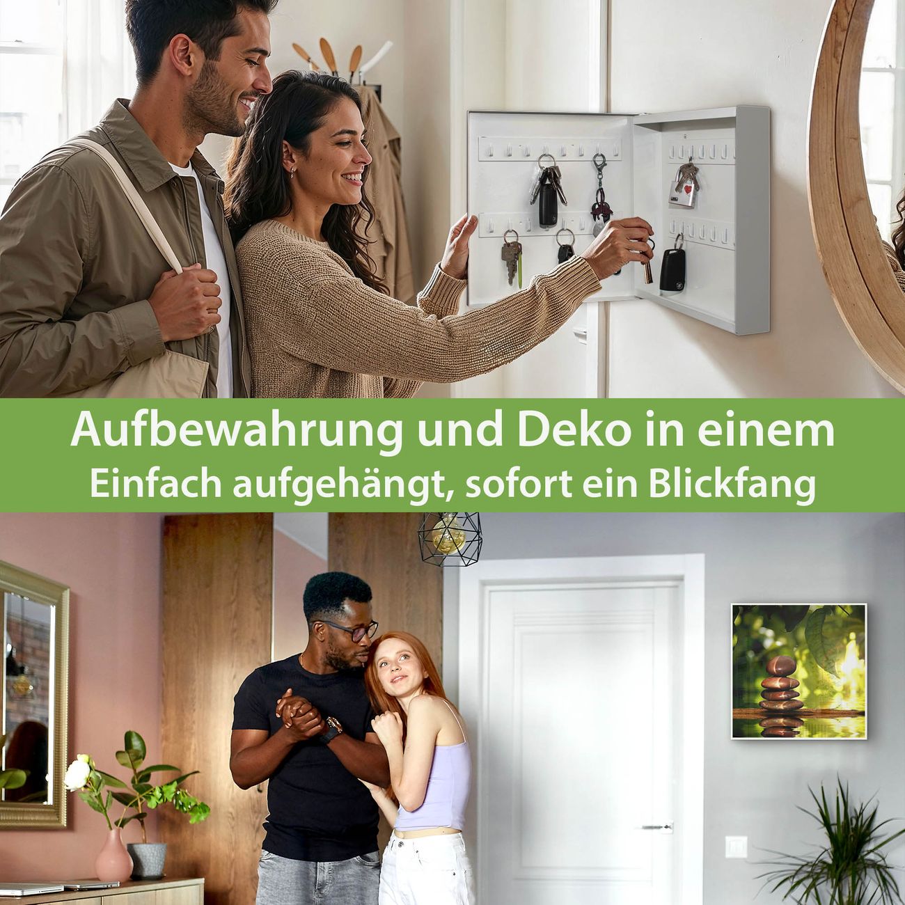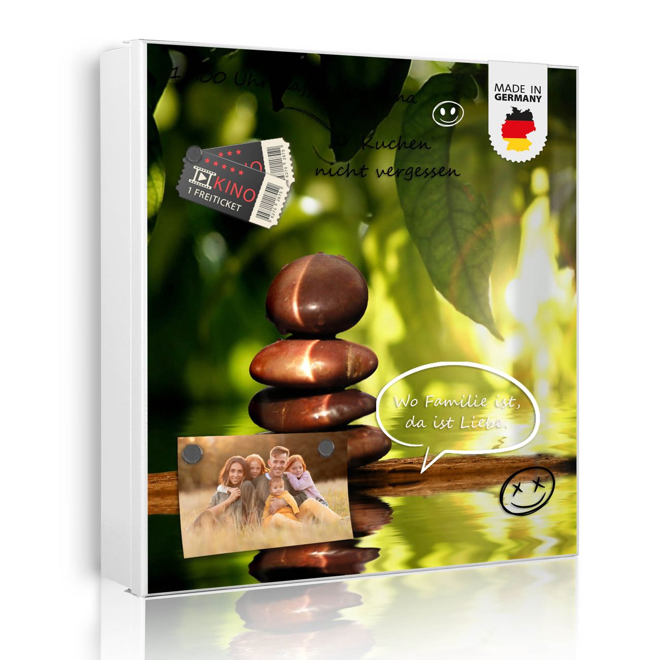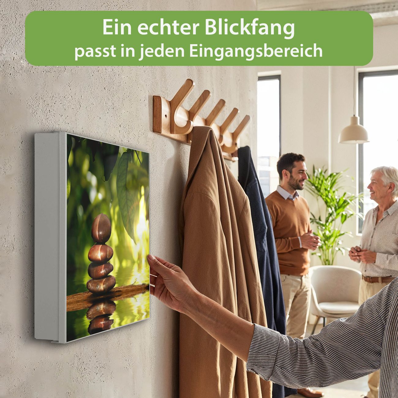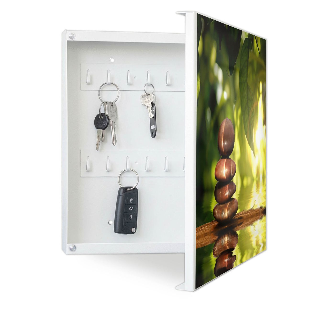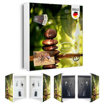 Bringe Ordnung und Eleganz in deinen Eingangsbereich mit dem banjado Schlüsselkasten Motiv Motiv Feng Shui. Die moderne Schlüsselbox kombiniert funktionales Design mit hochwertiger Verarbeitung und wird so zu einem echten Hingucker in Flur, Büro oder Ferienwohnung. ✅ Stilvolle Schlüsselaufbewahrung mit Motiv Motiv Feng Shui Der Design-Schlüsselkasten Motiv Motiv Feng Shui bietet Platz für bis zu 32 Schlüssel, die auf 4 stabilen Reihen mit je 8 Haken übersichtlich verstaut werden. Mit seinen kompakten Maßen von 30 x 30 x 5 cm passt die Schlüsselbox perfekt auch in kleinere Räume. Der weiß lackierte Stahlkorpus mit rechts angeschlagenem Türscharnier harmoniert mit gedruckten Folie auf der Front und fügt sich nahtlos in jedes Wohnambiente ein. Ob als Schlüsselorganizer für Zuhause oder als praktische Lösung für Büros, Praxen und Gewerbe, der banjado Schlüsselkasten sorgt für Ordnung und Übersicht. Dank der magnetischen, mit Kreidestiften beschreibbaren Folie auf der Front kannst du Notizen anheften oder Termine direkt auf der Oberfläche festhalten. Die Schlüsselbox Motiv Motiv Feng Shui zur Wandmontage wird inklusive Befestigungsmaterial geliefert und ist schnell angebracht. So hast du deine Schlüssel jederzeit griffbereit und zugleich stilvoll verstaut. Mit diesem banjado Schlüsselkasten Motiv Motiv Feng Shui kombinierst du praktische Aufbewahrung mit stilvollem Wohndesign. Ob privat oder geschäftlich, die Schlüsselbox sorgt für mehr Ordnung, Übersicht und ein wohnliches Ambiente.Vorteile im Überblick