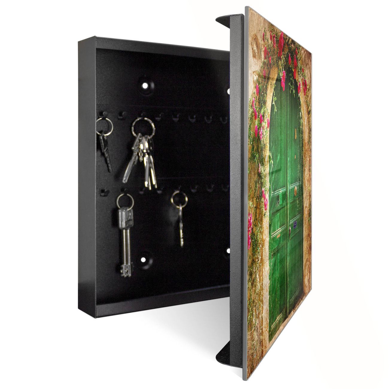 Bringe Ordnung und Eleganz in deinen Eingangsbereich mit dem banjado Schlüsselkasten Motiv Motiv Ferienhaus. Die moderne Schlüsselbox kombiniert funktionales Design mit hochwertiger Verarbeitung und wird so zu einem echten Hingucker in Flur, Büro oder Ferienwohnung. ✅ Stilvolle Schlüsselaufbewahrung mit Glasfront im Motiv Motiv Ferienhaus Der Design-Schlüsselkasten Motiv Motiv Ferienhaus bietet Platz für bis zu 50 Schlüssel, die auf 5 stabilen Reihen mit je 10 Haken übersichtlich verstaut werden. Mit seinen kompakten Maßen von 30 x 30 x 5 cm passt die Schlüsselbox perfekt auch in kleinere Räume. Der schwarz lackierte Stahlkorpus mit rechts angeschlagenem Türscharnier harmoniert mit der Glasfront und fügt sich nahtlos in jedes Wohnambiente ein. Ob als Schlüsselorganizer für Zuhause oder als praktische Lösung für Büros, Praxen und Gewerbe, der banjado Schlüsselkasten sorgt für Ordnung und Übersicht. Dank der magnetischen, mit Kreidestiften beschreibbaren Glasfront kannst du Notizen anheften oder Termine direkt auf der Oberfläche festhalten. Die Schlüsselbox Motiv Motiv Ferienhaus zur Wandmontage wird inklusive Befestigungsmaterial geliefert und ist schnell angebracht. So hast du deine Schlüssel jederzeit griffbereit und zugleich stilvoll verstaut. Mit diesem banjado Schlüsselkasten Motiv Motiv Ferienhaus kombinierst du praktische Aufbewahrung mit stilvollem Wohndesign. Ob privat oder geschäftlich, die Schlüsselbox sorgt für mehr Ordnung, Übersicht und ein wohnliches Ambiente.Vorteile im Überblick