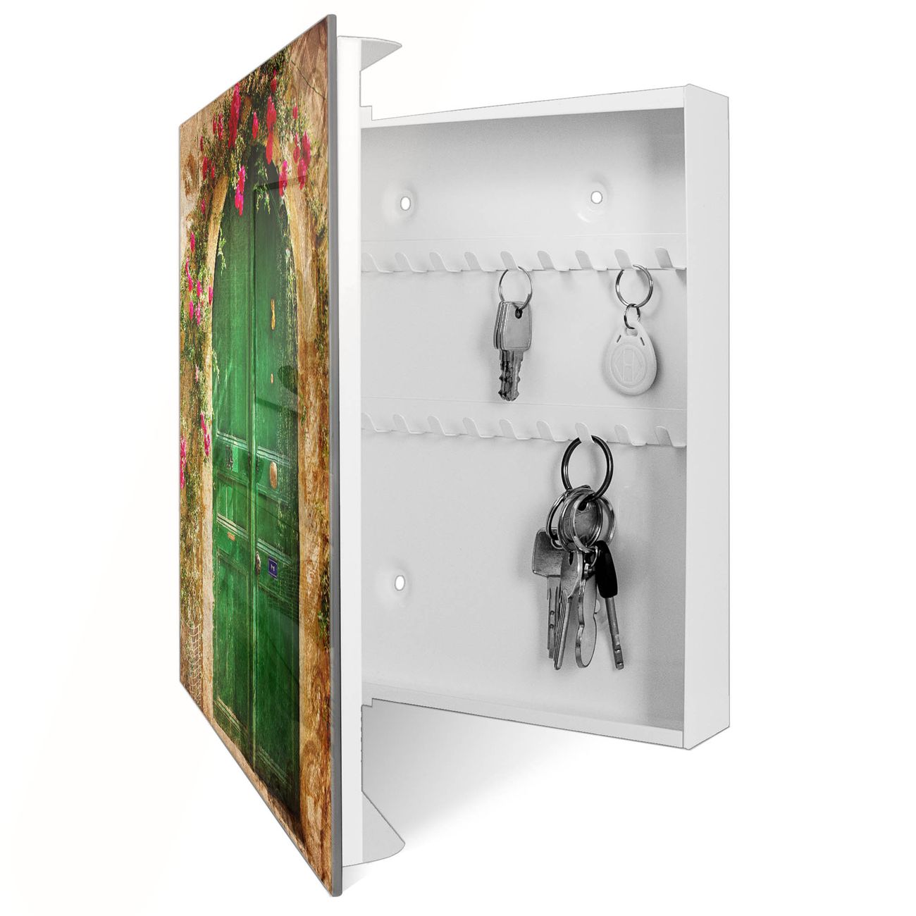 Bringe Ordnung und Eleganz in deinen Eingangsbereich mit dem banjado Schlüsselkasten Motiv Motiv Ferienhaus. Die moderne Schlüsselbox kombiniert funktionales Design mit hochwertiger Verarbeitung und wird so zu einem echten Hingucker in Flur, Büro oder Ferienwohnung. ✅ Stilvolle Schlüsselaufbewahrung mit Glasfront im Motiv Motiv Ferienhaus Der Design-Schlüsselkasten Motiv Motiv Ferienhaus bietet Platz für bis zu 50 Schlüssel, die auf 5 stabilen Reihen mit je 10 Haken übersichtlich verstaut werden. Mit seinen kompakten Maßen von 30 x 30 x 5 cm passt die Schlüsselbox perfekt auch in kleinere Räume. Der weiß lackierte Stahlkorpus mit rechts angeschlagenem Türscharnier harmoniert mit der Glasfront und fügt sich nahtlos in jedes Wohnambiente ein. Ob als Schlüsselorganizer für Zuhause oder als praktische Lösung für Büros, Praxen und Gewerbe, der banjado Schlüsselkasten sorgt für Ordnung und Übersicht. Dank der magnetischen, mit Kreidestiften beschreibbaren Glasfront kannst du Notizen anheften oder Termine direkt auf der Oberfläche festhalten. Die Schlüsselbox Motiv Motiv Ferienhaus zur Wandmontage wird inklusive Befestigungsmaterial geliefert und ist schnell angebracht. So hast du deine Schlüssel jederzeit griffbereit und zugleich stilvoll verstaut. Mit diesem banjado Schlüsselkasten Motiv Motiv Ferienhaus kombinierst du praktische Aufbewahrung mit stilvollem Wohndesign. Ob privat oder geschäftlich, die Schlüsselbox sorgt für mehr Ordnung, Übersicht und ein wohnliches Ambiente.Vorteile im Überblick