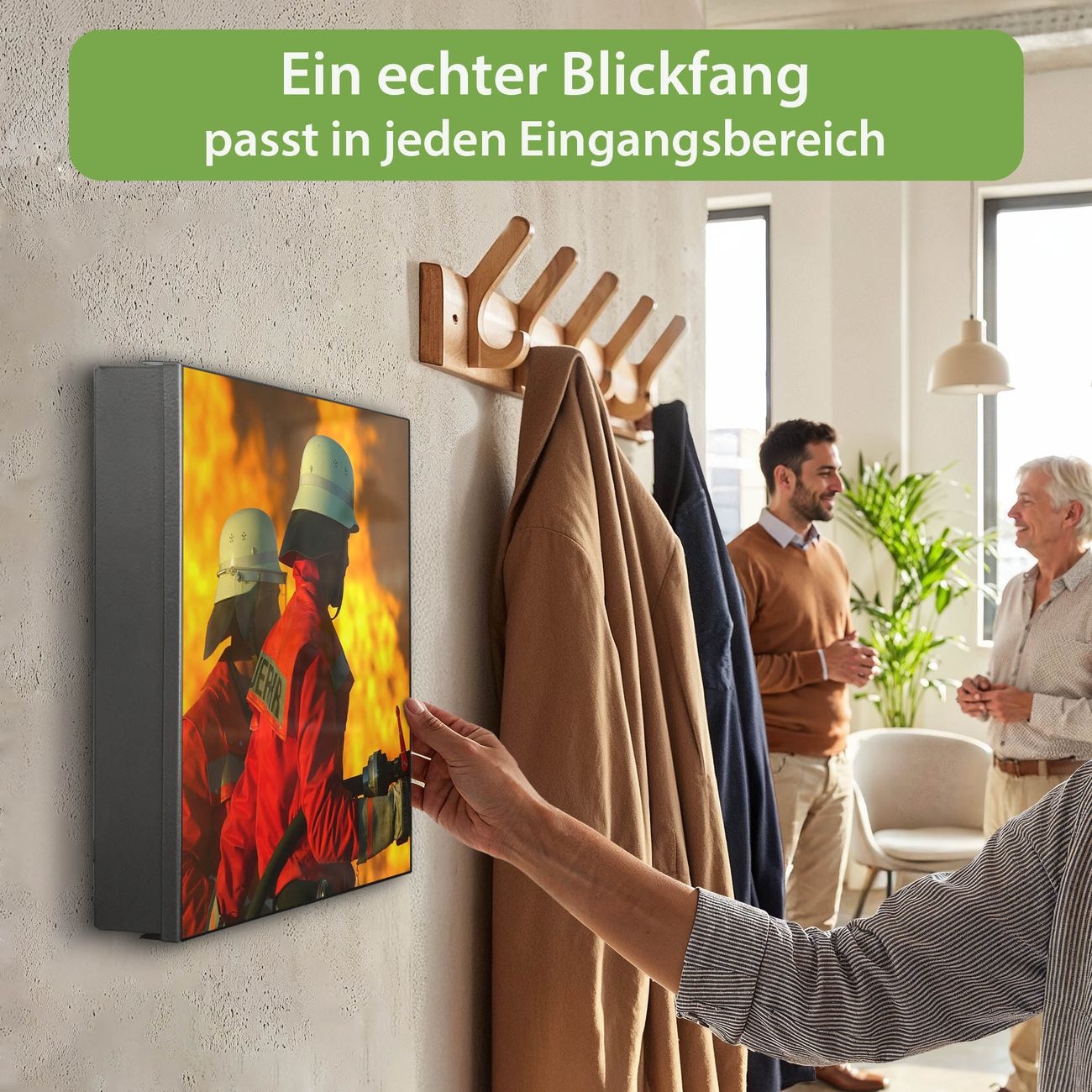 Bringe Ordnung und Eleganz in deinen Eingangsbereich mit dem banjado Schlüsselkasten Motiv Motiv Feuer. Die moderne Schlüsselbox kombiniert funktionales Design mit hochwertiger Verarbeitung und wird so zu einem echten Hingucker in Flur, Büro oder Ferienwohnung. ✅ Stilvolle Schlüsselaufbewahrung mit Motiv Motiv Feuer Der Design-Schlüsselkasten Motiv Motiv Feuer bietet Platz für bis zu 32 Schlüssel, die auf 4 stabilen Reihen mit je 8 Haken übersichtlich verstaut werden. Mit seinen kompakten Maßen von 30 x 30 x 5 cm passt die Schlüsselbox perfekt auch in kleinere Räume. Der schwarz lackierte Stahlkorpus mit links angeschlagenem Türscharnier harmoniert mit gedruckten Folie auf der Front und fügt sich nahtlos in jedes Wohnambiente ein. Ob als Schlüsselorganizer für Zuhause oder als praktische Lösung für Büros, Praxen und Gewerbe, der banjado Schlüsselkasten sorgt für Ordnung und Übersicht. Dank der magnetischen, mit Kreidestiften beschreibbaren Folie auf der Front kannst du Notizen anheften oder Termine direkt auf der Oberfläche festhalten. Die Schlüsselbox Motiv Motiv Feuer zur Wandmontage wird inklusive Befestigungsmaterial geliefert und ist schnell angebracht. So hast du deine Schlüssel jederzeit griffbereit und zugleich stilvoll verstaut. Mit diesem banjado Schlüsselkasten Motiv Motiv Feuer kombinierst du praktische Aufbewahrung mit stilvollem Wohndesign. Ob privat oder geschäftlich, die Schlüsselbox sorgt für mehr Ordnung, Übersicht und ein wohnliches Ambiente.Vorteile im Überblick