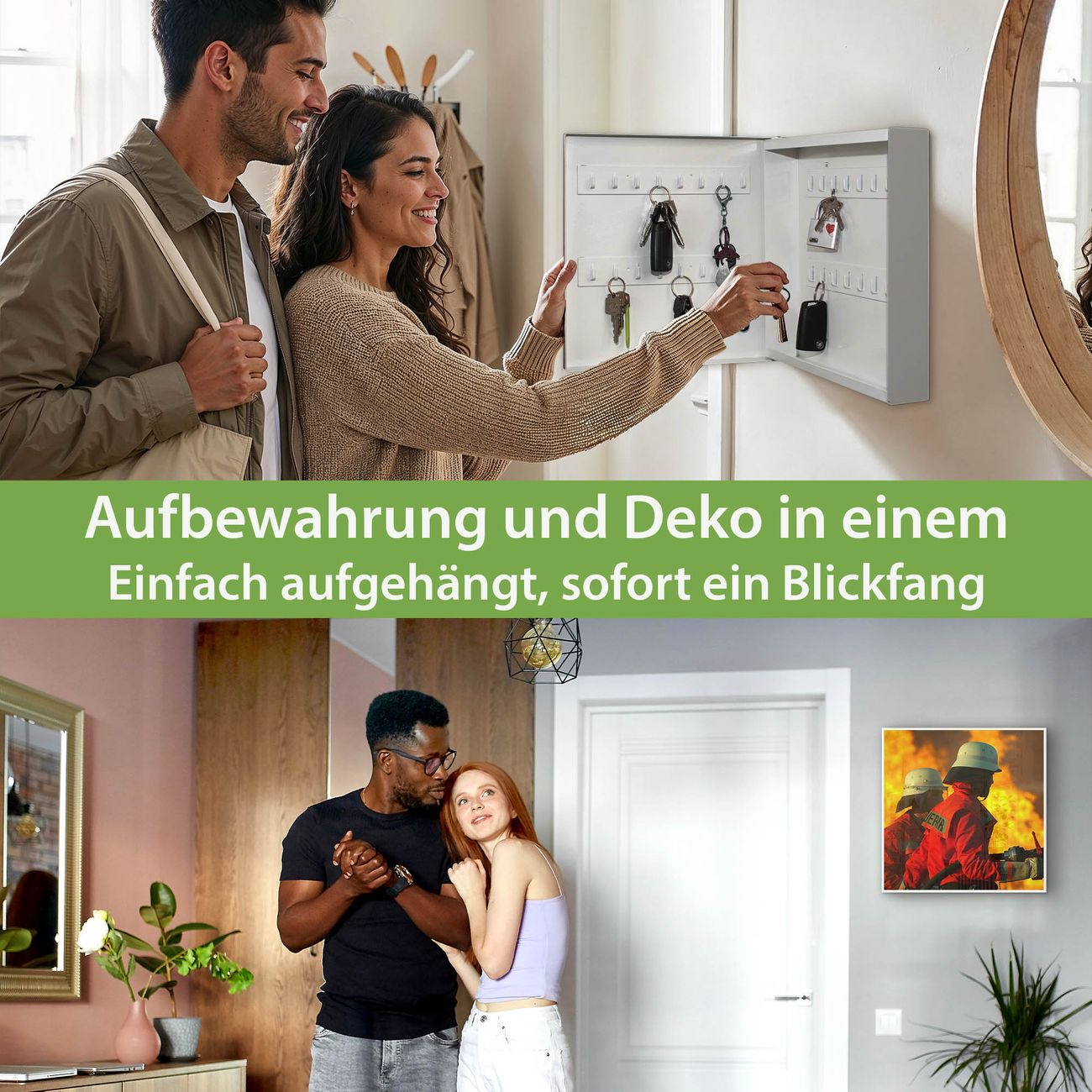 Bringe Ordnung und Eleganz in deinen Eingangsbereich mit dem banjado Schlüsselkasten Motiv Motiv Feuer. Die moderne Schlüsselbox kombiniert funktionales Design mit hochwertiger Verarbeitung und wird so zu einem echten Hingucker in Flur, Büro oder Ferienwohnung. ✅ Stilvolle Schlüsselaufbewahrung mit Motiv Motiv Feuer Der Design-Schlüsselkasten Motiv Motiv Feuer bietet Platz für bis zu 32 Schlüssel, die auf 4 stabilen Reihen mit je 8 Haken übersichtlich verstaut werden. Mit seinen kompakten Maßen von 30 x 30 x 5 cm passt die Schlüsselbox perfekt auch in kleinere Räume. Der weiß lackierte Stahlkorpus mit links angeschlagenem Türscharnier harmoniert mit gedruckten Folie auf der Front und fügt sich nahtlos in jedes Wohnambiente ein. Ob als Schlüsselorganizer für Zuhause oder als praktische Lösung für Büros, Praxen und Gewerbe, der banjado Schlüsselkasten sorgt für Ordnung und Übersicht. Dank der magnetischen, mit Kreidestiften beschreibbaren Folie auf der Front kannst du Notizen anheften oder Termine direkt auf der Oberfläche festhalten. Die Schlüsselbox Motiv Motiv Feuer zur Wandmontage wird inklusive Befestigungsmaterial geliefert und ist schnell angebracht. So hast du deine Schlüssel jederzeit griffbereit und zugleich stilvoll verstaut. Mit diesem banjado Schlüsselkasten Motiv Motiv Feuer kombinierst du praktische Aufbewahrung mit stilvollem Wohndesign. Ob privat oder geschäftlich, die Schlüsselbox sorgt für mehr Ordnung, Übersicht und ein wohnliches Ambiente.Vorteile im Überblick