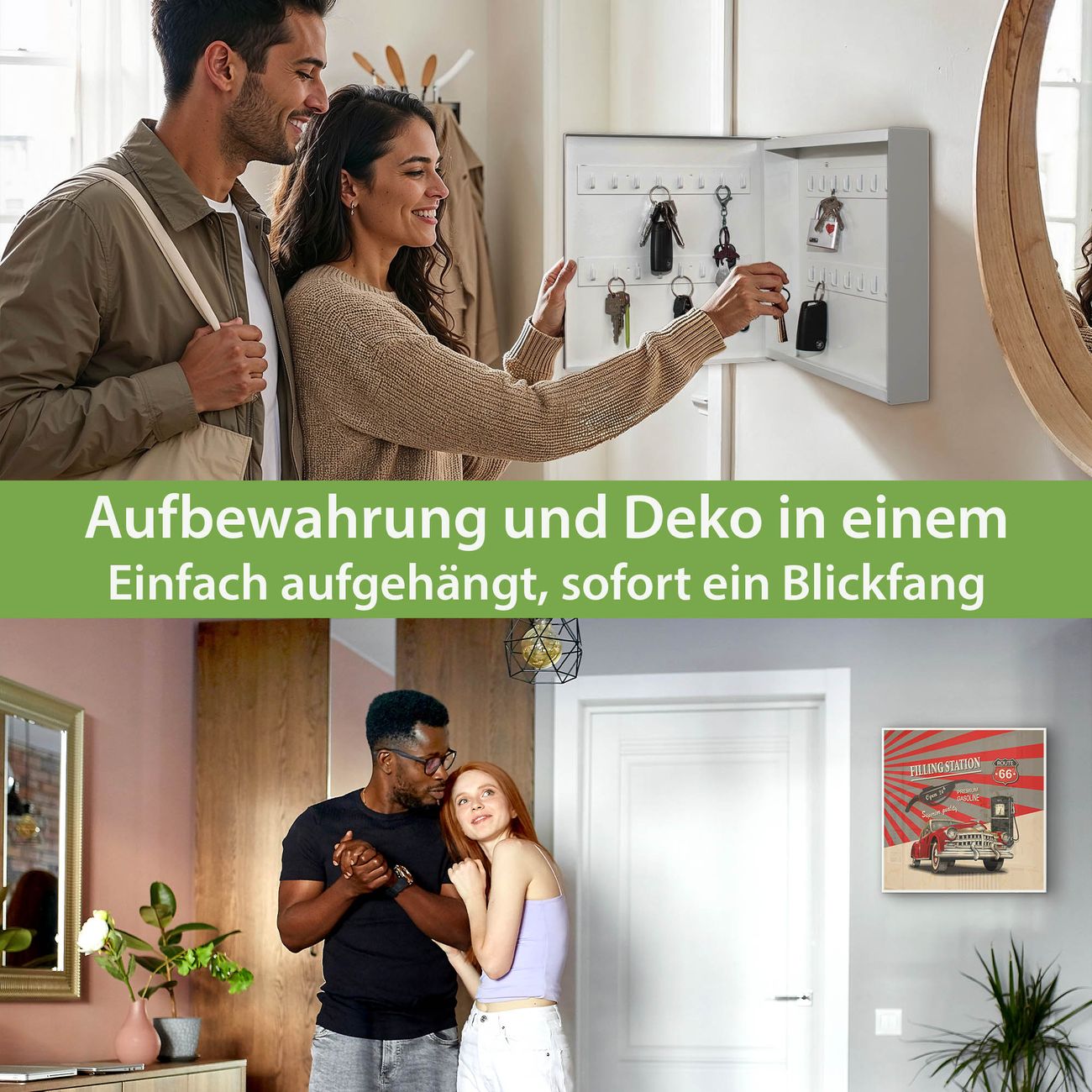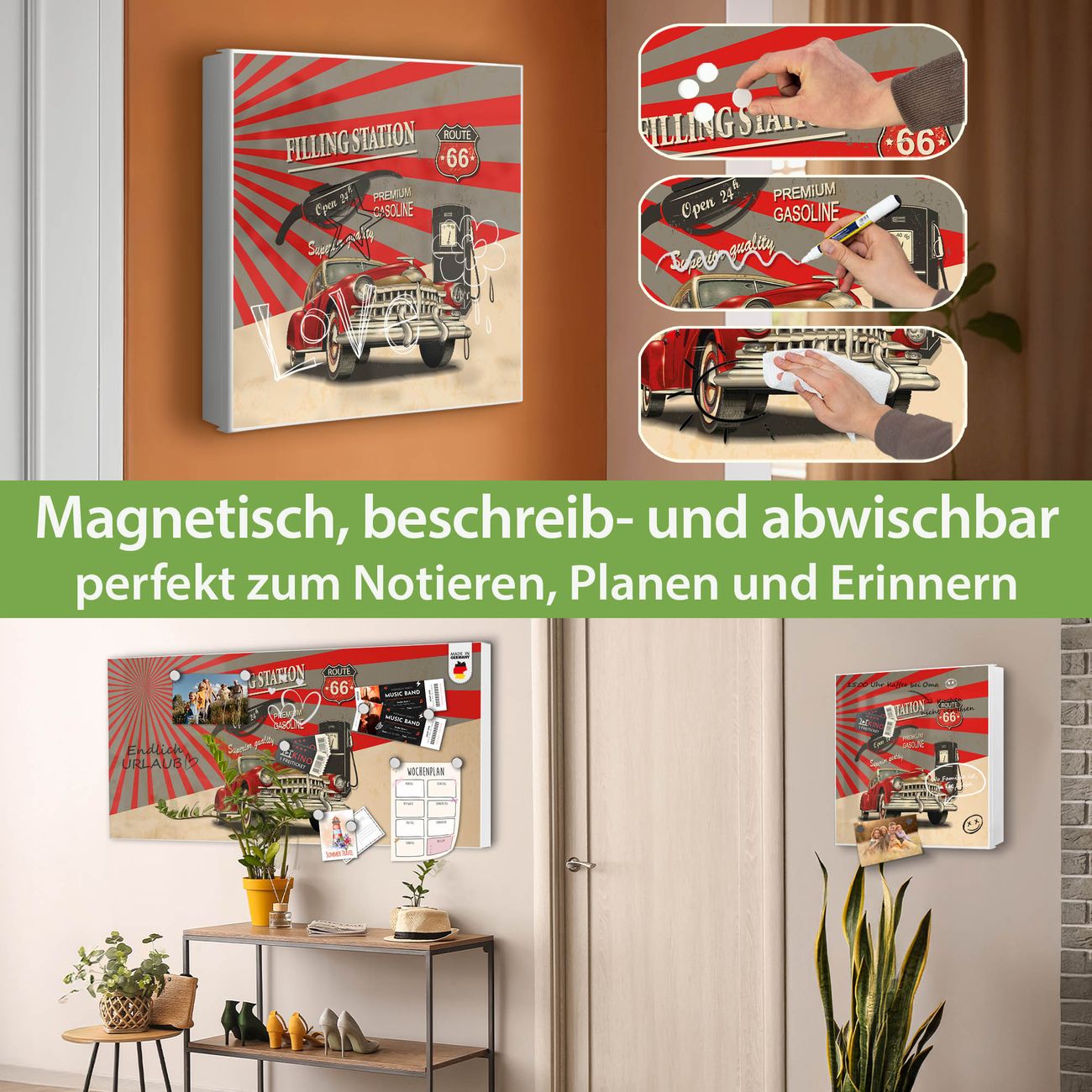 Bringe Ordnung und Eleganz in deinen Eingangsbereich mit dem banjado Schlüsselkasten Motiv Motiv Filling Station. Die moderne Schlüsselbox kombiniert funktionales Design mit hochwertiger Verarbeitung und wird so zu einem echten Hingucker in Flur, Büro oder Ferienwohnung. ✅ Stilvolle Schlüsselaufbewahrung mit Motiv Motiv Filling Station Der Design-Schlüsselkasten Motiv Motiv Filling Station bietet Platz für bis zu 32 Schlüssel, die auf 4 stabilen Reihen mit je 8 Haken übersichtlich verstaut werden. Mit seinen kompakten Maßen von 30 x 30 x 5 cm passt die Schlüsselbox perfekt auch in kleinere Räume. Der weiß lackierte Stahlkorpus mit rechts angeschlagenem Türscharnier harmoniert mit gedruckten Folie auf der Front und fügt sich nahtlos in jedes Wohnambiente ein. Ob als Schlüsselorganizer für Zuhause oder als praktische Lösung für Büros, Praxen und Gewerbe, der banjado Schlüsselkasten sorgt für Ordnung und Übersicht. Dank der magnetischen, mit Kreidestiften beschreibbaren Folie auf der Front kannst du Notizen anheften oder Termine direkt auf der Oberfläche festhalten. Die Schlüsselbox Motiv Motiv Filling Station zur Wandmontage wird inklusive Befestigungsmaterial geliefert und ist schnell angebracht. So hast du deine Schlüssel jederzeit griffbereit und zugleich stilvoll verstaut. Mit diesem banjado Schlüsselkasten Motiv Motiv Filling Station kombinierst du praktische Aufbewahrung mit stilvollem Wohndesign. Ob privat oder geschäftlich, die Schlüsselbox sorgt für mehr Ordnung, Übersicht und ein wohnliches Ambiente.Vorteile im Überblick