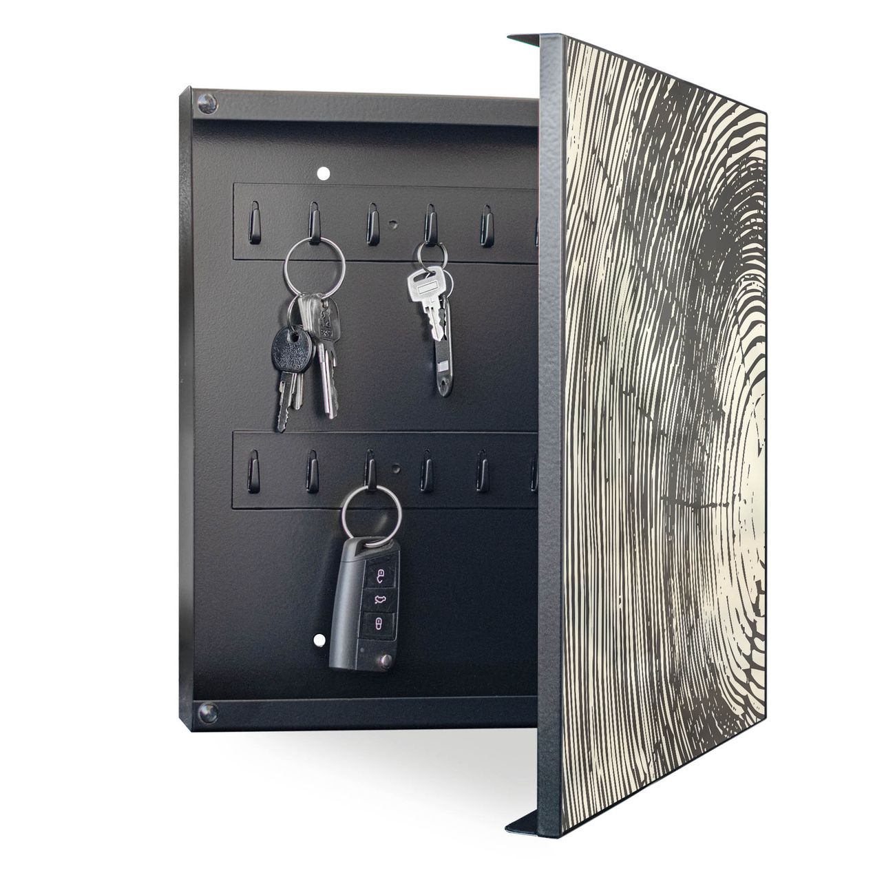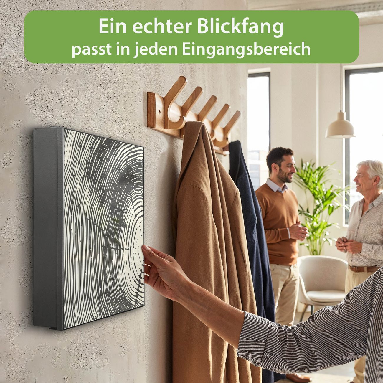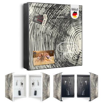 Bringe Ordnung und Eleganz in deinen Eingangsbereich mit dem banjado Schlüsselkasten Motiv Motiv Fingerabdruck. Die moderne Schlüsselbox kombiniert funktionales Design mit hochwertiger Verarbeitung und wird so zu einem echten Hingucker in Flur, Büro oder Ferienwohnung. ✅ Stilvolle Schlüsselaufbewahrung mit Motiv Motiv Fingerabdruck Der Design-Schlüsselkasten Motiv Motiv Fingerabdruck bietet Platz für bis zu 32 Schlüssel, die auf 4 stabilen Reihen mit je 8 Haken übersichtlich verstaut werden. Mit seinen kompakten Maßen von 30 x 30 x 5 cm passt die Schlüsselbox perfekt auch in kleinere Räume. Der schwarz lackierte Stahlkorpus mit rechts angeschlagenem Türscharnier harmoniert mit gedruckten Folie auf der Front und fügt sich nahtlos in jedes Wohnambiente ein. Ob als Schlüsselorganizer für Zuhause oder als praktische Lösung für Büros, Praxen und Gewerbe, der banjado Schlüsselkasten sorgt für Ordnung und Übersicht. Dank der magnetischen, mit Kreidestiften beschreibbaren Folie auf der Front kannst du Notizen anheften oder Termine direkt auf der Oberfläche festhalten. Die Schlüsselbox Motiv Motiv Fingerabdruck zur Wandmontage wird inklusive Befestigungsmaterial geliefert und ist schnell angebracht. So hast du deine Schlüssel jederzeit griffbereit und zugleich stilvoll verstaut. Mit diesem banjado Schlüsselkasten Motiv Motiv Fingerabdruck kombinierst du praktische Aufbewahrung mit stilvollem Wohndesign. Ob privat oder geschäftlich, die Schlüsselbox sorgt für mehr Ordnung, Übersicht und ein wohnliches Ambiente.Vorteile im Überblick