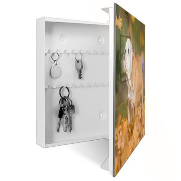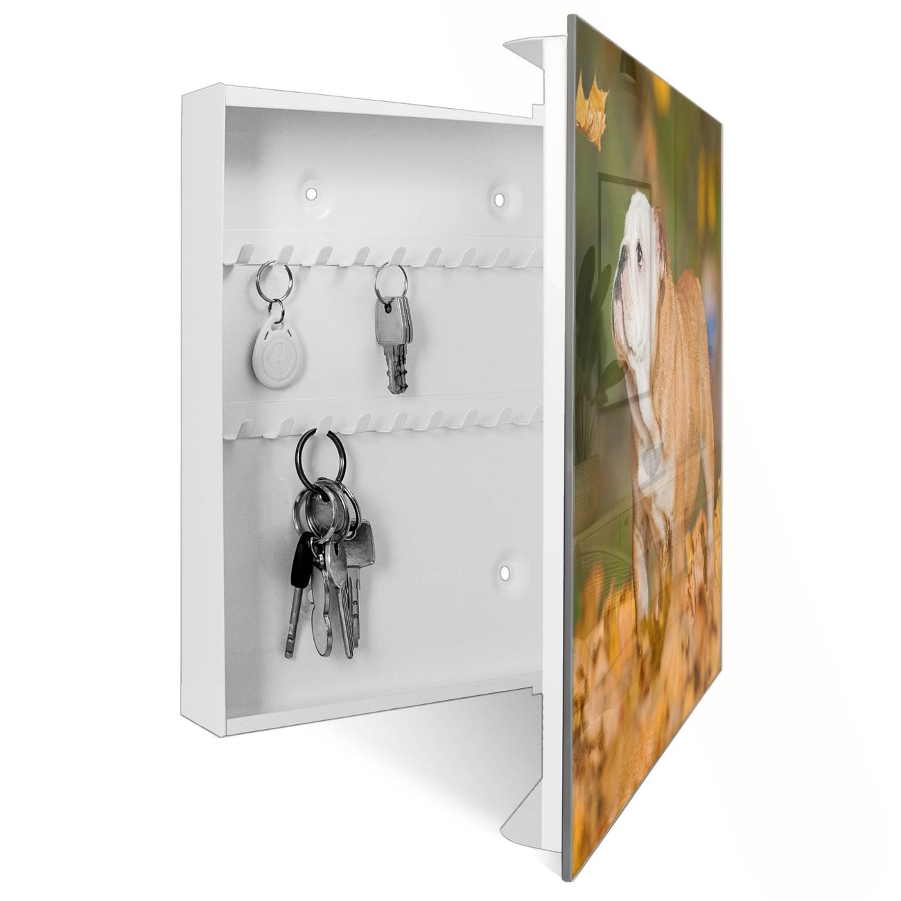 Bringe Ordnung und Eleganz in deinen Eingangsbereich mit dem banjado Schlüsselkasten Motiv Motiv Fiona. Die moderne Schlüsselbox kombiniert funktionales Design mit hochwertiger Verarbeitung und wird so zu einem echten Hingucker in Flur, Büro oder Ferienwohnung. ✅ Stilvolle Schlüsselaufbewahrung mit Glasfront im Motiv Motiv Fiona Der Design-Schlüsselkasten Motiv Motiv Fiona bietet Platz für bis zu 50 Schlüssel, die auf 5 stabilen Reihen mit je 10 Haken übersichtlich verstaut werden. Mit seinen kompakten Maßen von 30 x 30 x 5 cm passt die Schlüsselbox perfekt auch in kleinere Räume. Der weiß lackierte Stahlkorpus mit rechts angeschlagenem Türscharnier harmoniert mit der Glasfront und fügt sich nahtlos in jedes Wohnambiente ein. Ob als Schlüsselorganizer für Zuhause oder als praktische Lösung für Büros, Praxen und Gewerbe, der banjado Schlüsselkasten sorgt für Ordnung und Übersicht. Dank der magnetischen, mit Kreidestiften beschreibbaren Glasfront kannst du Notizen anheften oder Termine direkt auf der Oberfläche festhalten. Die Schlüsselbox Motiv Motiv Fiona zur Wandmontage wird inklusive Befestigungsmaterial geliefert und ist schnell angebracht. So hast du deine Schlüssel jederzeit griffbereit und zugleich stilvoll verstaut. Mit diesem banjado Schlüsselkasten Motiv Motiv Fiona kombinierst du praktische Aufbewahrung mit stilvollem Wohndesign. Ob privat oder geschäftlich, die Schlüsselbox sorgt für mehr Ordnung, Übersicht und ein wohnliches Ambiente.Vorteile im Überblick