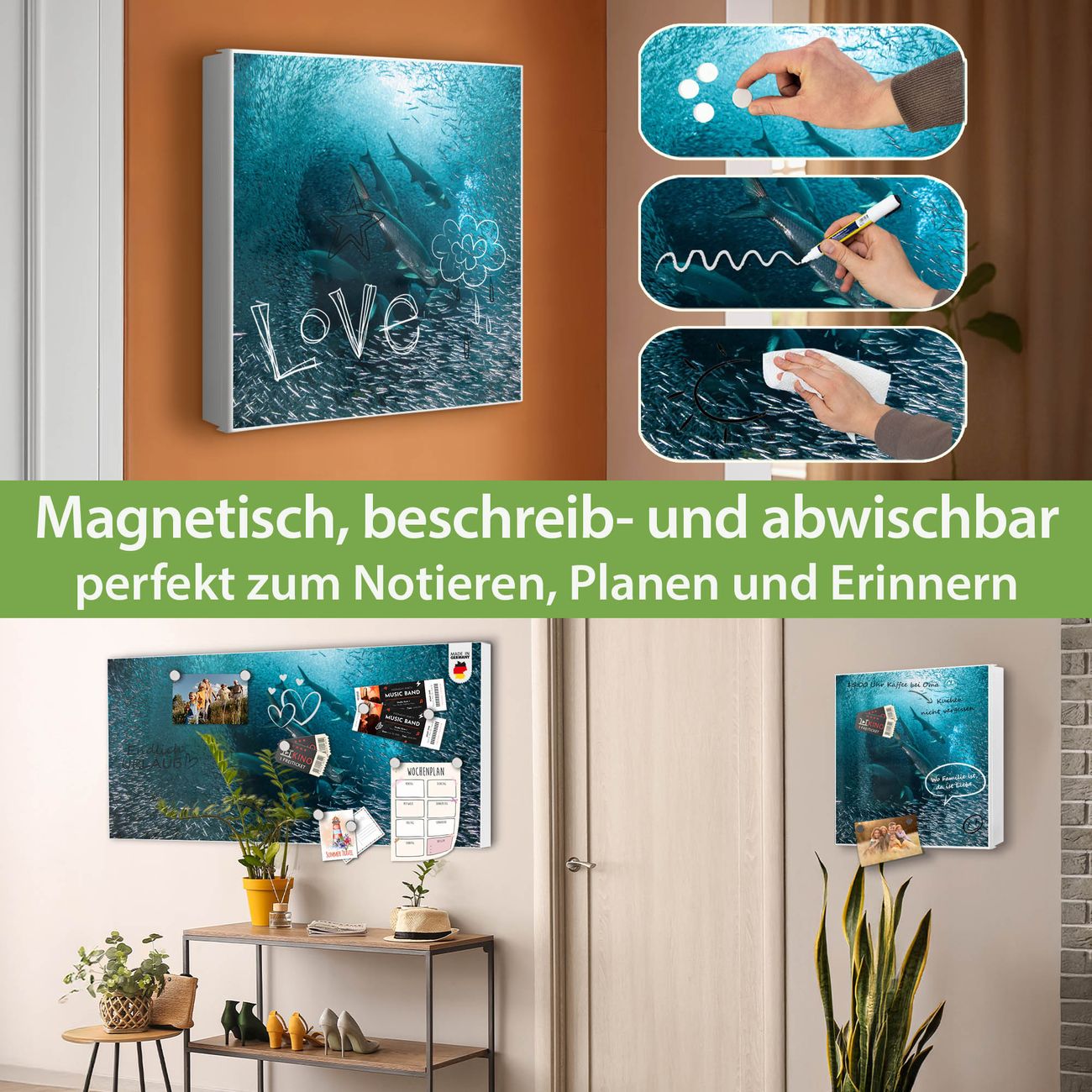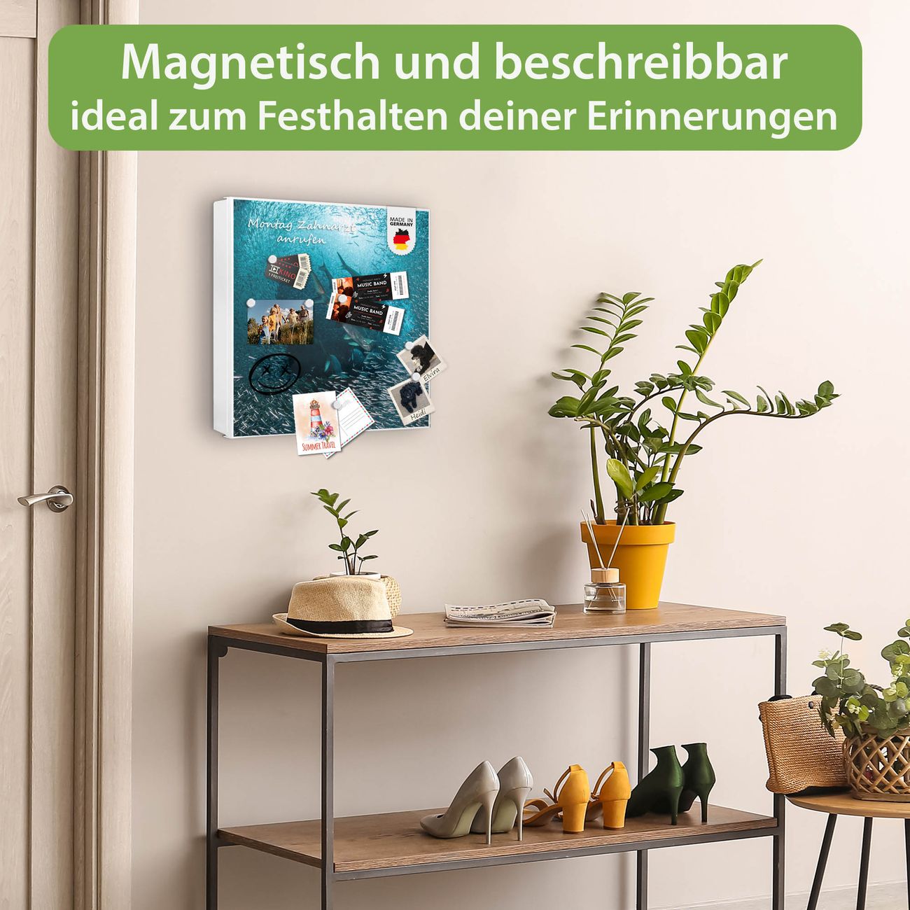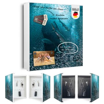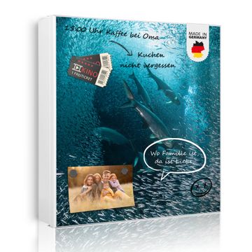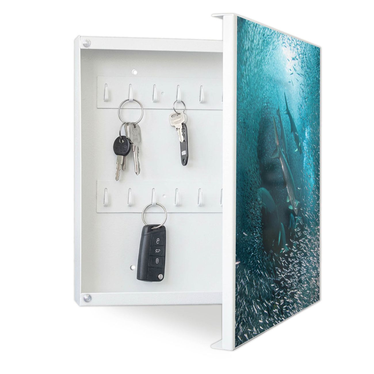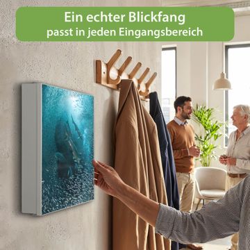 Bringe Ordnung und Eleganz in deinen Eingangsbereich mit dem banjado Schlüsselkasten Motiv Motiv Fische im Meer. Die moderne Schlüsselbox kombiniert funktionales Design mit hochwertiger Verarbeitung und wird so zu einem echten Hingucker in Flur, Büro oder Ferienwohnung. ✅ Stilvolle Schlüsselaufbewahrung mit Motiv Motiv Fische im Meer Der Design-Schlüsselkasten Motiv Motiv Fische im Meer bietet Platz für bis zu 32 Schlüssel, die auf 4 stabilen Reihen mit je 8 Haken übersichtlich verstaut werden. Mit seinen kompakten Maßen von 30 x 30 x 5 cm passt die Schlüsselbox perfekt auch in kleinere Räume. Der weiß lackierte Stahlkorpus mit rechts angeschlagenem Türscharnier harmoniert mit gedruckten Folie auf der Front und fügt sich nahtlos in jedes Wohnambiente ein. Ob als Schlüsselorganizer für Zuhause oder als praktische Lösung für Büros, Praxen und Gewerbe, der banjado Schlüsselkasten sorgt für Ordnung und Übersicht. Dank der magnetischen, mit Kreidestiften beschreibbaren Folie auf der Front kannst du Notizen anheften oder Termine direkt auf der Oberfläche festhalten. Die Schlüsselbox Motiv Motiv Fische im Meer zur Wandmontage wird inklusive Befestigungsmaterial geliefert und ist schnell angebracht. So hast du deine Schlüssel jederzeit griffbereit und zugleich stilvoll verstaut. Mit diesem banjado Schlüsselkasten Motiv Motiv Fische im Meer kombinierst du praktische Aufbewahrung mit stilvollem Wohndesign. Ob privat oder geschäftlich, die Schlüsselbox sorgt für mehr Ordnung, Übersicht und ein wohnliches Ambiente.Vorteile im Überblick