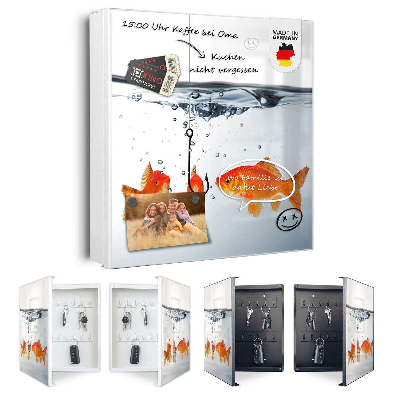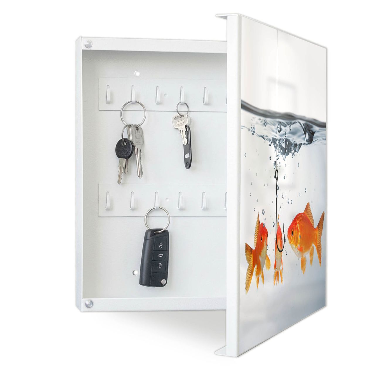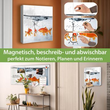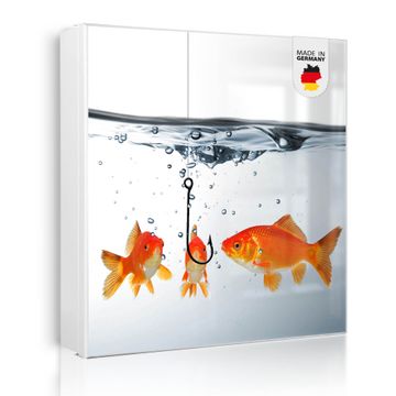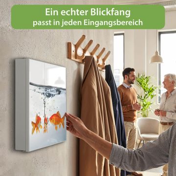 Bringe Ordnung und Eleganz in deinen Eingangsbereich mit dem banjado Schlüsselkasten Motiv Motiv Fische. Die moderne Schlüsselbox kombiniert funktionales Design mit hochwertiger Verarbeitung und wird so zu einem echten Hingucker in Flur, Büro oder Ferienwohnung. ✅ Stilvolle Schlüsselaufbewahrung mit Motiv Motiv Fische Der Design-Schlüsselkasten Motiv Motiv Fische bietet Platz für bis zu 32 Schlüssel, die auf 4 stabilen Reihen mit je 8 Haken übersichtlich verstaut werden. Mit seinen kompakten Maßen von 30 x 30 x 5 cm passt die Schlüsselbox perfekt auch in kleinere Räume. Der weiß lackierte Stahlkorpus mit rechts angeschlagenem Türscharnier harmoniert mit gedruckten Folie auf der Front und fügt sich nahtlos in jedes Wohnambiente ein. Ob als Schlüsselorganizer für Zuhause oder als praktische Lösung für Büros, Praxen und Gewerbe, der banjado Schlüsselkasten sorgt für Ordnung und Übersicht. Dank der magnetischen, mit Kreidestiften beschreibbaren Folie auf der Front kannst du Notizen anheften oder Termine direkt auf der Oberfläche festhalten. Die Schlüsselbox Motiv Motiv Fische zur Wandmontage wird inklusive Befestigungsmaterial geliefert und ist schnell angebracht. So hast du deine Schlüssel jederzeit griffbereit und zugleich stilvoll verstaut. Mit diesem banjado Schlüsselkasten Motiv Motiv Fische kombinierst du praktische Aufbewahrung mit stilvollem Wohndesign. Ob privat oder geschäftlich, die Schlüsselbox sorgt für mehr Ordnung, Übersicht und ein wohnliches Ambiente.Vorteile im Überblick