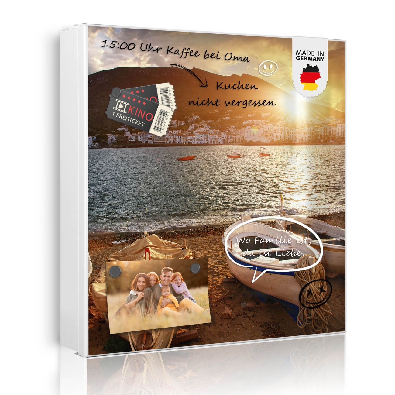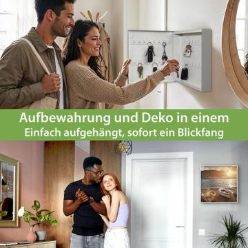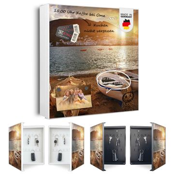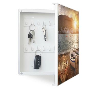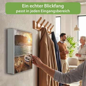 Bringe Ordnung und Eleganz in deinen Eingangsbereich mit dem banjado Schlüsselkasten Motiv Motiv Fischerboote. Die moderne Schlüsselbox kombiniert funktionales Design mit hochwertiger Verarbeitung und wird so zu einem echten Hingucker in Flur, Büro oder Ferienwohnung. ✅ Stilvolle Schlüsselaufbewahrung mit Motiv Motiv Fischerboote Der Design-Schlüsselkasten Motiv Motiv Fischerboote bietet Platz für bis zu 32 Schlüssel, die auf 4 stabilen Reihen mit je 8 Haken übersichtlich verstaut werden. Mit seinen kompakten Maßen von 30 x 30 x 5 cm passt die Schlüsselbox perfekt auch in kleinere Räume. Der weiß lackierte Stahlkorpus mit rechts angeschlagenem Türscharnier harmoniert mit gedruckten Folie auf der Front und fügt sich nahtlos in jedes Wohnambiente ein. Ob als Schlüsselorganizer für Zuhause oder als praktische Lösung für Büros, Praxen und Gewerbe, der banjado Schlüsselkasten sorgt für Ordnung und Übersicht. Dank der magnetischen, mit Kreidestiften beschreibbaren Folie auf der Front kannst du Notizen anheften oder Termine direkt auf der Oberfläche festhalten. Die Schlüsselbox Motiv Motiv Fischerboote zur Wandmontage wird inklusive Befestigungsmaterial geliefert und ist schnell angebracht. So hast du deine Schlüssel jederzeit griffbereit und zugleich stilvoll verstaut. Mit diesem banjado Schlüsselkasten Motiv Motiv Fischerboote kombinierst du praktische Aufbewahrung mit stilvollem Wohndesign. Ob privat oder geschäftlich, die Schlüsselbox sorgt für mehr Ordnung, Übersicht und ein wohnliches Ambiente.Vorteile im Überblick
