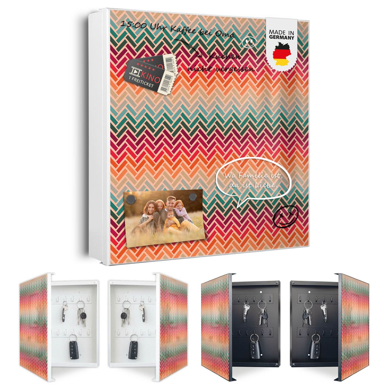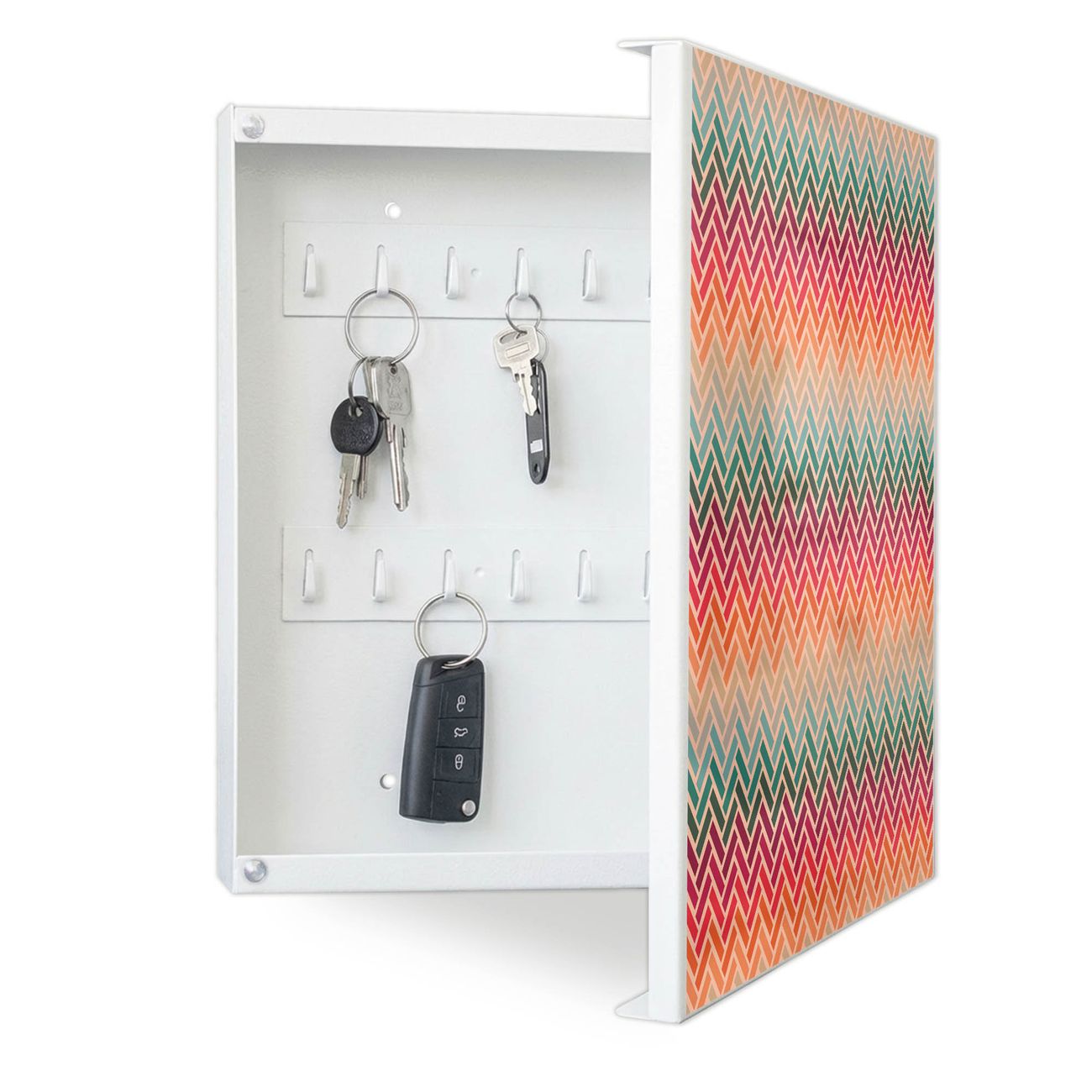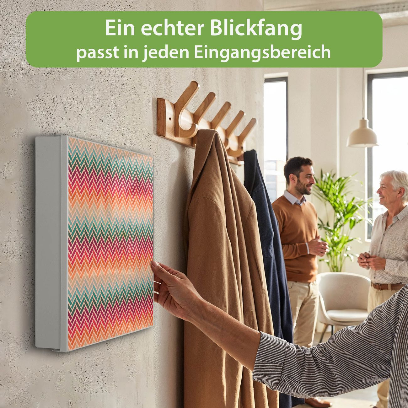 Bringe Ordnung und Eleganz in deinen Eingangsbereich mit dem banjado Schlüsselkasten Motiv Motiv Fischgräten. Die moderne Schlüsselbox kombiniert funktionales Design mit hochwertiger Verarbeitung und wird so zu einem echten Hingucker in Flur, Büro oder Ferienwohnung. ✅ Stilvolle Schlüsselaufbewahrung mit Motiv Motiv Fischgräten Der Design-Schlüsselkasten Motiv Motiv Fischgräten bietet Platz für bis zu 32 Schlüssel, die auf 4 stabilen Reihen mit je 8 Haken übersichtlich verstaut werden. Mit seinen kompakten Maßen von 30 x 30 x 5 cm passt die Schlüsselbox perfekt auch in kleinere Räume. Der weiß lackierte Stahlkorpus mit rechts angeschlagenem Türscharnier harmoniert mit gedruckten Folie auf der Front und fügt sich nahtlos in jedes Wohnambiente ein. Ob als Schlüsselorganizer für Zuhause oder als praktische Lösung für Büros, Praxen und Gewerbe, der banjado Schlüsselkasten sorgt für Ordnung und Übersicht. Dank der magnetischen, mit Kreidestiften beschreibbaren Folie auf der Front kannst du Notizen anheften oder Termine direkt auf der Oberfläche festhalten. Die Schlüsselbox Motiv Motiv Fischgräten zur Wandmontage wird inklusive Befestigungsmaterial geliefert und ist schnell angebracht. So hast du deine Schlüssel jederzeit griffbereit und zugleich stilvoll verstaut. Mit diesem banjado Schlüsselkasten Motiv Motiv Fischgräten kombinierst du praktische Aufbewahrung mit stilvollem Wohndesign. Ob privat oder geschäftlich, die Schlüsselbox sorgt für mehr Ordnung, Übersicht und ein wohnliches Ambiente.Vorteile im Überblick