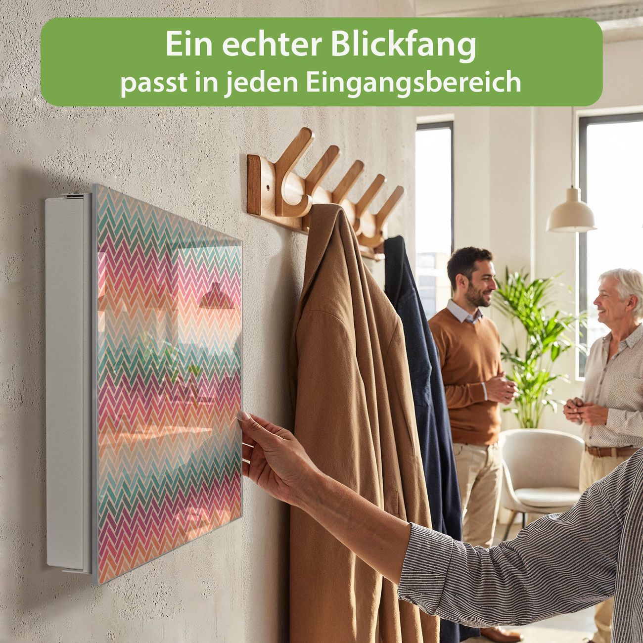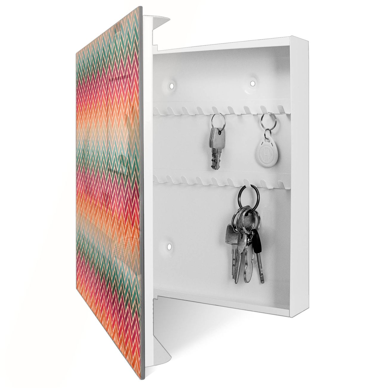 Bringe Ordnung und Eleganz in deinen Eingangsbereich mit dem banjado Schlüsselkasten Motiv Motiv Fischgräten. Die moderne Schlüsselbox kombiniert funktionales Design mit hochwertiger Verarbeitung und wird so zu einem echten Hingucker in Flur, Büro oder Ferienwohnung. ✅ Stilvolle Schlüsselaufbewahrung mit Glasfront im Motiv Motiv Fischgräten Der Design-Schlüsselkasten Motiv Motiv Fischgräten bietet Platz für bis zu 50 Schlüssel, die auf 5 stabilen Reihen mit je 10 Haken übersichtlich verstaut werden. Mit seinen kompakten Maßen von 30 x 30 x 5 cm passt die Schlüsselbox perfekt auch in kleinere Räume. Der weiß lackierte Stahlkorpus mit rechts angeschlagenem Türscharnier harmoniert mit der Glasfront und fügt sich nahtlos in jedes Wohnambiente ein. Ob als Schlüsselorganizer für Zuhause oder als praktische Lösung für Büros, Praxen und Gewerbe, der banjado Schlüsselkasten sorgt für Ordnung und Übersicht. Dank der magnetischen, mit Kreidestiften beschreibbaren Glasfront kannst du Notizen anheften oder Termine direkt auf der Oberfläche festhalten. Die Schlüsselbox Motiv Motiv Fischgräten zur Wandmontage wird inklusive Befestigungsmaterial geliefert und ist schnell angebracht. So hast du deine Schlüssel jederzeit griffbereit und zugleich stilvoll verstaut. Mit diesem banjado Schlüsselkasten Motiv Motiv Fischgräten kombinierst du praktische Aufbewahrung mit stilvollem Wohndesign. Ob privat oder geschäftlich, die Schlüsselbox sorgt für mehr Ordnung, Übersicht und ein wohnliches Ambiente.Vorteile im Überblick