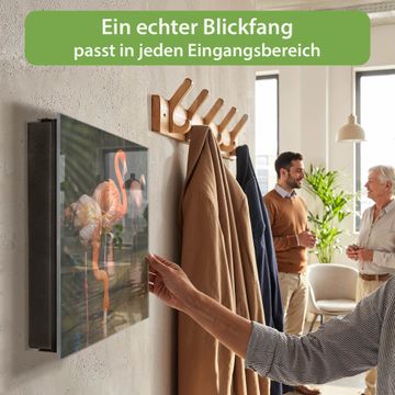Bringe Ordnung und Eleganz in deinen Eingangsbereich mit dem banjado Schlüsselkasten Motiv Motiv Flamingo. Die moderne Schlüsselbox kombiniert funktionales Design mit hochwertiger Verarbeitung und wird so zu einem echten Hingucker in Flur, Büro oder Ferienwohnung. ✅ Stilvolle Schlüsselaufbewahrung mit Glasfront im Motiv Motiv Flamingo Der Design-Schlüsselkasten Motiv Motiv Flamingo bietet Platz für bis zu 50 Schlüssel, die auf 5 stabilen Reihen mit je 10 Haken übersichtlich verstaut werden. Mit seinen kompakten Maßen von 30 x 30 x 5 cm passt die Schlüsselbox perfekt auch in kleinere Räume. Der schwarz lackierte Stahlkorpus mit rechts angeschlagenem Türscharnier harmoniert mit der Glasfront und fügt sich nahtlos in jedes Wohnambiente ein. Ob als Schlüsselorganizer für Zuhause oder als praktische Lösung für Büros, Praxen und Gewerbe, der banjado Schlüsselkasten sorgt für Ordnung und Übersicht. Dank der magnetischen, mit Kreidestiften beschreibbaren Glasfront kannst du Notizen anheften oder Termine direkt auf der Oberfläche festhalten. Die Schlüsselbox Motiv Motiv Flamingo zur Wandmontage wird inklusive Befestigungsmaterial geliefert und ist schnell angebracht. So hast du deine Schlüssel jederzeit griffbereit und zugleich stilvoll verstaut. Mit diesem banjado Schlüsselkasten Motiv Motiv Flamingo kombinierst du praktische Aufbewahrung mit stilvollem Wohndesign. Ob privat oder geschäftlich, die Schlüsselbox sorgt für mehr Ordnung, Übersicht und ein wohnliches Ambiente.Vorteile im Überblick