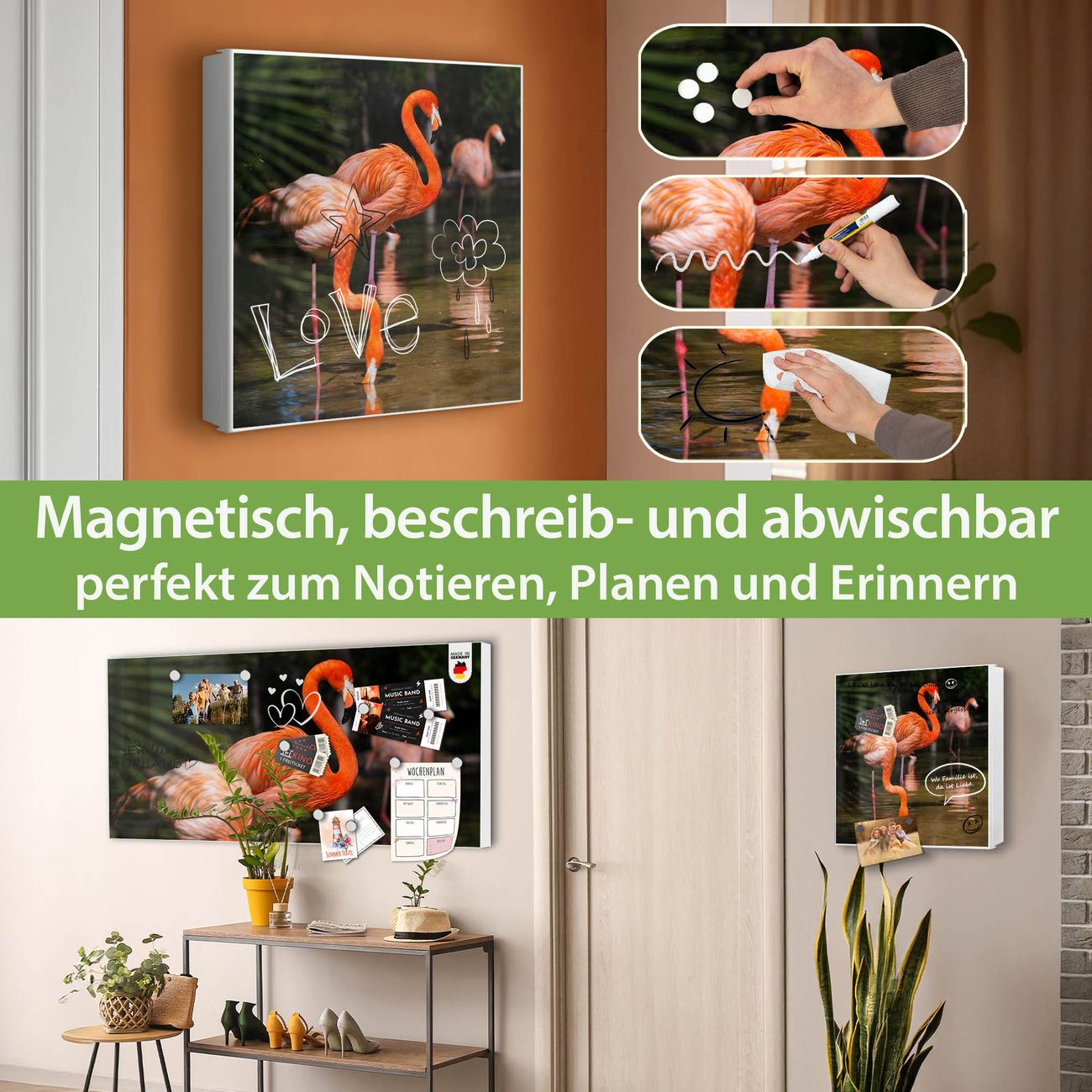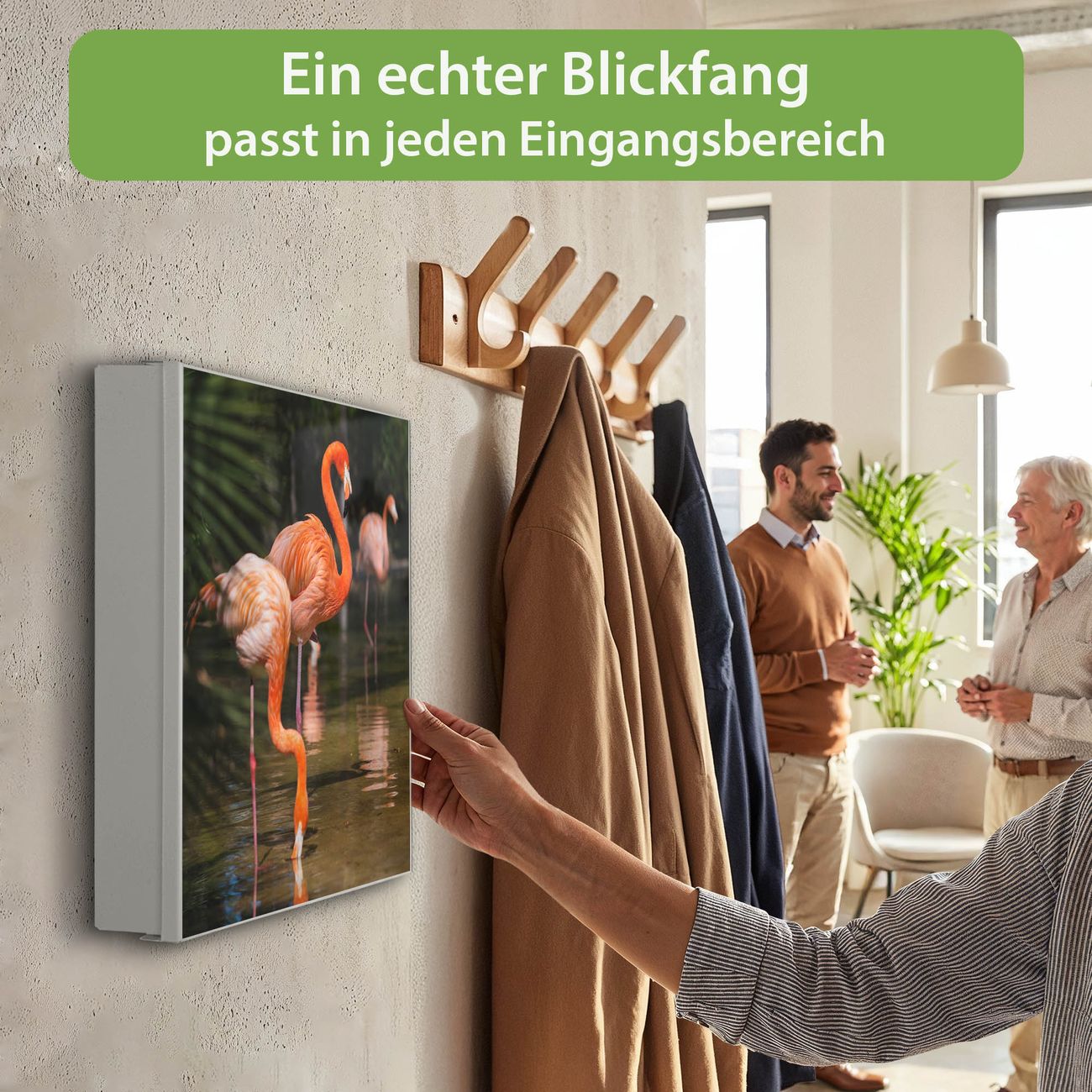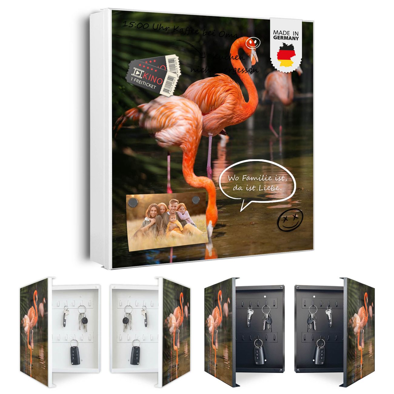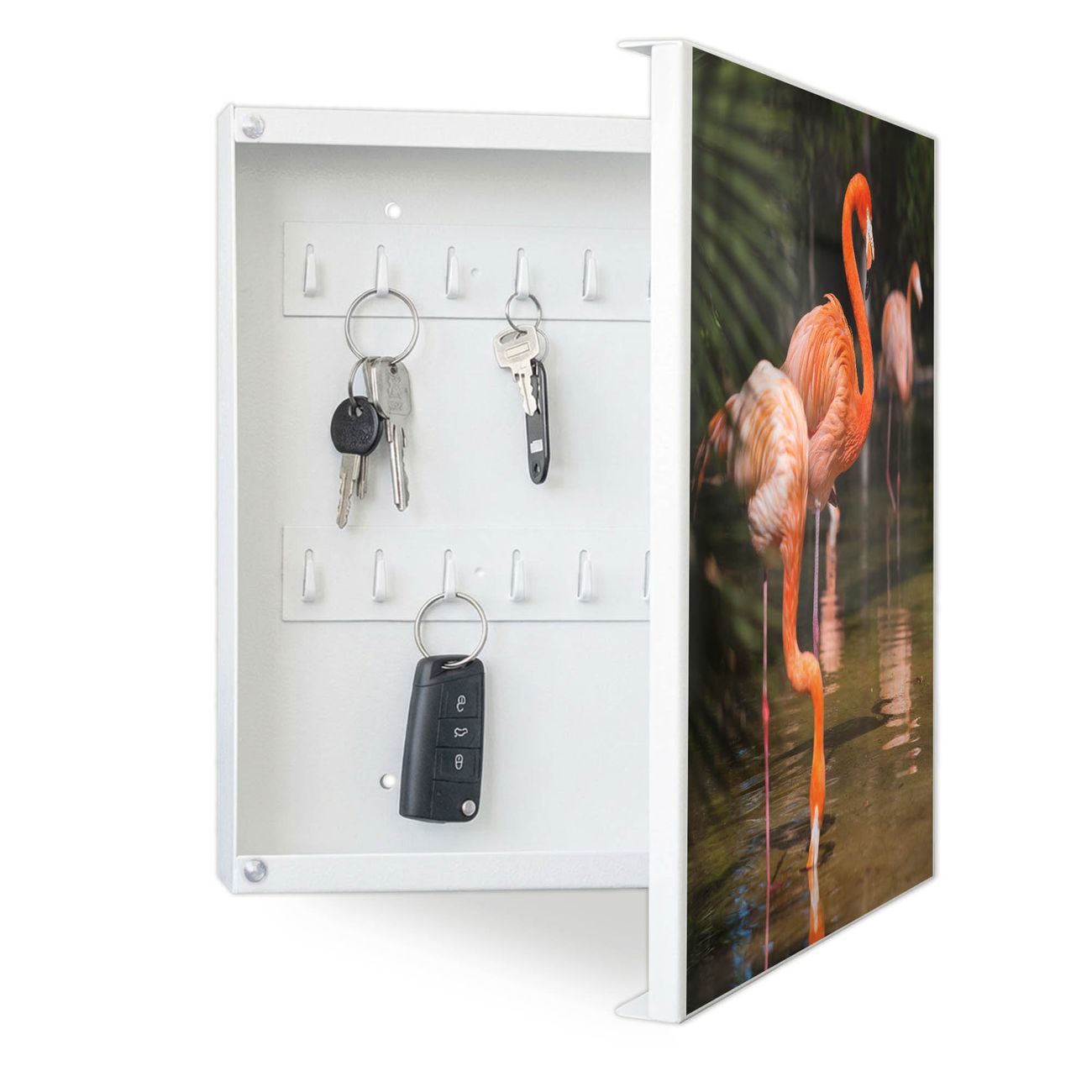 Bringe Ordnung und Eleganz in deinen Eingangsbereich mit dem banjado Schlüsselkasten Motiv Motiv Flamingo. Die moderne Schlüsselbox kombiniert funktionales Design mit hochwertiger Verarbeitung und wird so zu einem echten Hingucker in Flur, Büro oder Ferienwohnung. ✅ Stilvolle Schlüsselaufbewahrung mit Motiv Motiv Flamingo Der Design-Schlüsselkasten Motiv Motiv Flamingo bietet Platz für bis zu 32 Schlüssel, die auf 4 stabilen Reihen mit je 8 Haken übersichtlich verstaut werden. Mit seinen kompakten Maßen von 30 x 30 x 5 cm passt die Schlüsselbox perfekt auch in kleinere Räume. Der weiß lackierte Stahlkorpus mit rechts angeschlagenem Türscharnier harmoniert mit gedruckten Folie auf der Front und fügt sich nahtlos in jedes Wohnambiente ein. Ob als Schlüsselorganizer für Zuhause oder als praktische Lösung für Büros, Praxen und Gewerbe, der banjado Schlüsselkasten sorgt für Ordnung und Übersicht. Dank der magnetischen, mit Kreidestiften beschreibbaren Folie auf der Front kannst du Notizen anheften oder Termine direkt auf der Oberfläche festhalten. Die Schlüsselbox Motiv Motiv Flamingo zur Wandmontage wird inklusive Befestigungsmaterial geliefert und ist schnell angebracht. So hast du deine Schlüssel jederzeit griffbereit und zugleich stilvoll verstaut. Mit diesem banjado Schlüsselkasten Motiv Motiv Flamingo kombinierst du praktische Aufbewahrung mit stilvollem Wohndesign. Ob privat oder geschäftlich, die Schlüsselbox sorgt für mehr Ordnung, Übersicht und ein wohnliches Ambiente.Vorteile im Überblick