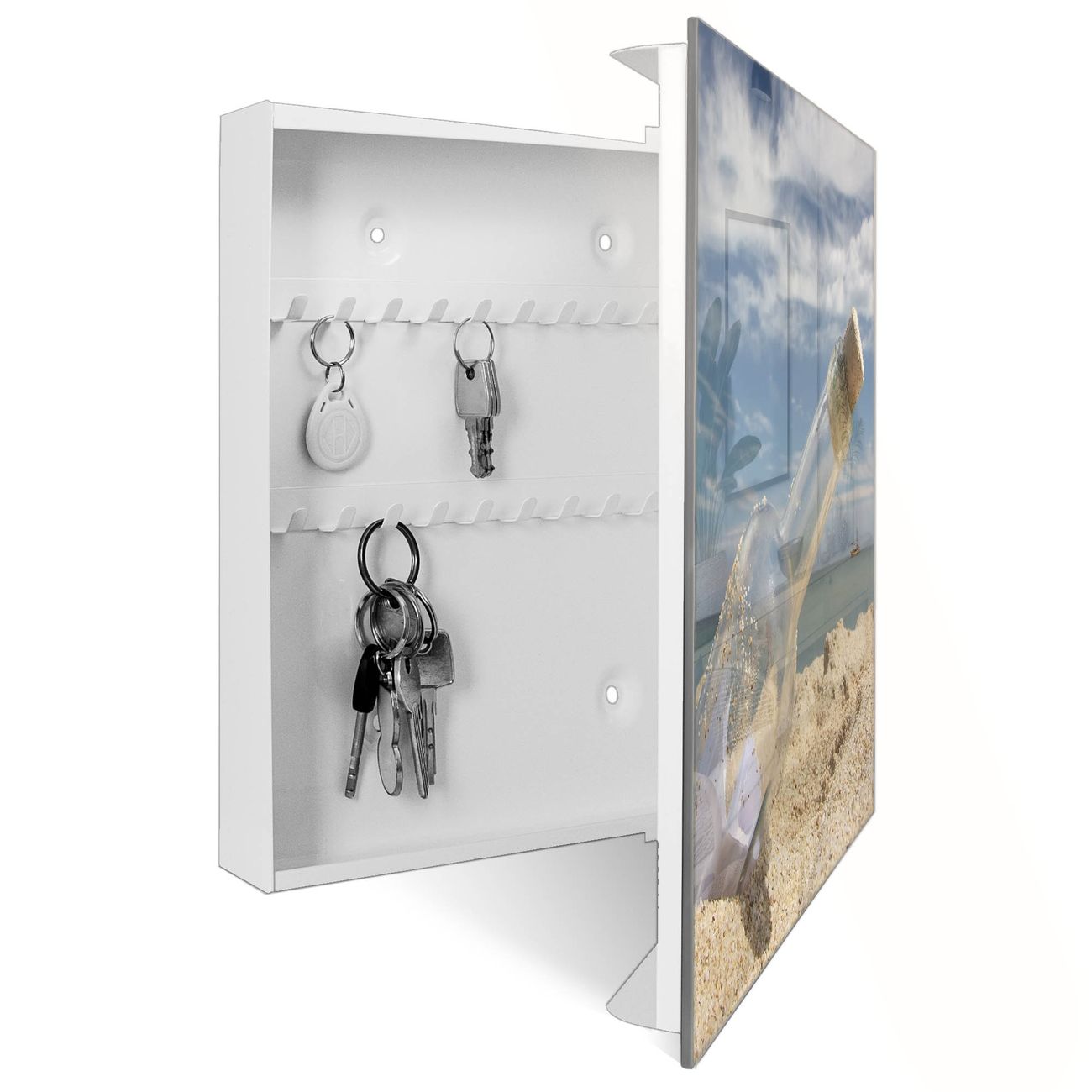 Bringe Ordnung und Eleganz in deinen Eingangsbereich mit dem banjado Schlüsselkasten Motiv Motiv Flaschenpost. Die moderne Schlüsselbox kombiniert funktionales Design mit hochwertiger Verarbeitung und wird so zu einem echten Hingucker in Flur, Büro oder Ferienwohnung. ✅ Stilvolle Schlüsselaufbewahrung mit Glasfront im Motiv Motiv Flaschenpost Der Design-Schlüsselkasten Motiv Motiv Flaschenpost bietet Platz für bis zu 50 Schlüssel, die auf 5 stabilen Reihen mit je 10 Haken übersichtlich verstaut werden. Mit seinen kompakten Maßen von 30 x 30 x 5 cm passt die Schlüsselbox perfekt auch in kleinere Räume. Der weiß lackierte Stahlkorpus mit rechts angeschlagenem Türscharnier harmoniert mit der Glasfront und fügt sich nahtlos in jedes Wohnambiente ein. Ob als Schlüsselorganizer für Zuhause oder als praktische Lösung für Büros, Praxen und Gewerbe, der banjado Schlüsselkasten sorgt für Ordnung und Übersicht. Dank der magnetischen, mit Kreidestiften beschreibbaren Glasfront kannst du Notizen anheften oder Termine direkt auf der Oberfläche festhalten. Die Schlüsselbox Motiv Motiv Flaschenpost zur Wandmontage wird inklusive Befestigungsmaterial geliefert und ist schnell angebracht. So hast du deine Schlüssel jederzeit griffbereit und zugleich stilvoll verstaut. Mit diesem banjado Schlüsselkasten Motiv Motiv Flaschenpost kombinierst du praktische Aufbewahrung mit stilvollem Wohndesign. Ob privat oder geschäftlich, die Schlüsselbox sorgt für mehr Ordnung, Übersicht und ein wohnliches Ambiente.Vorteile im Überblick