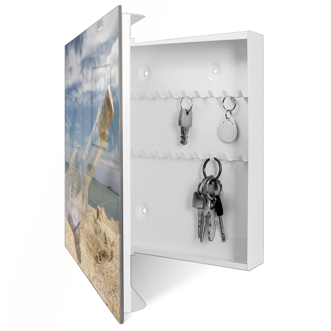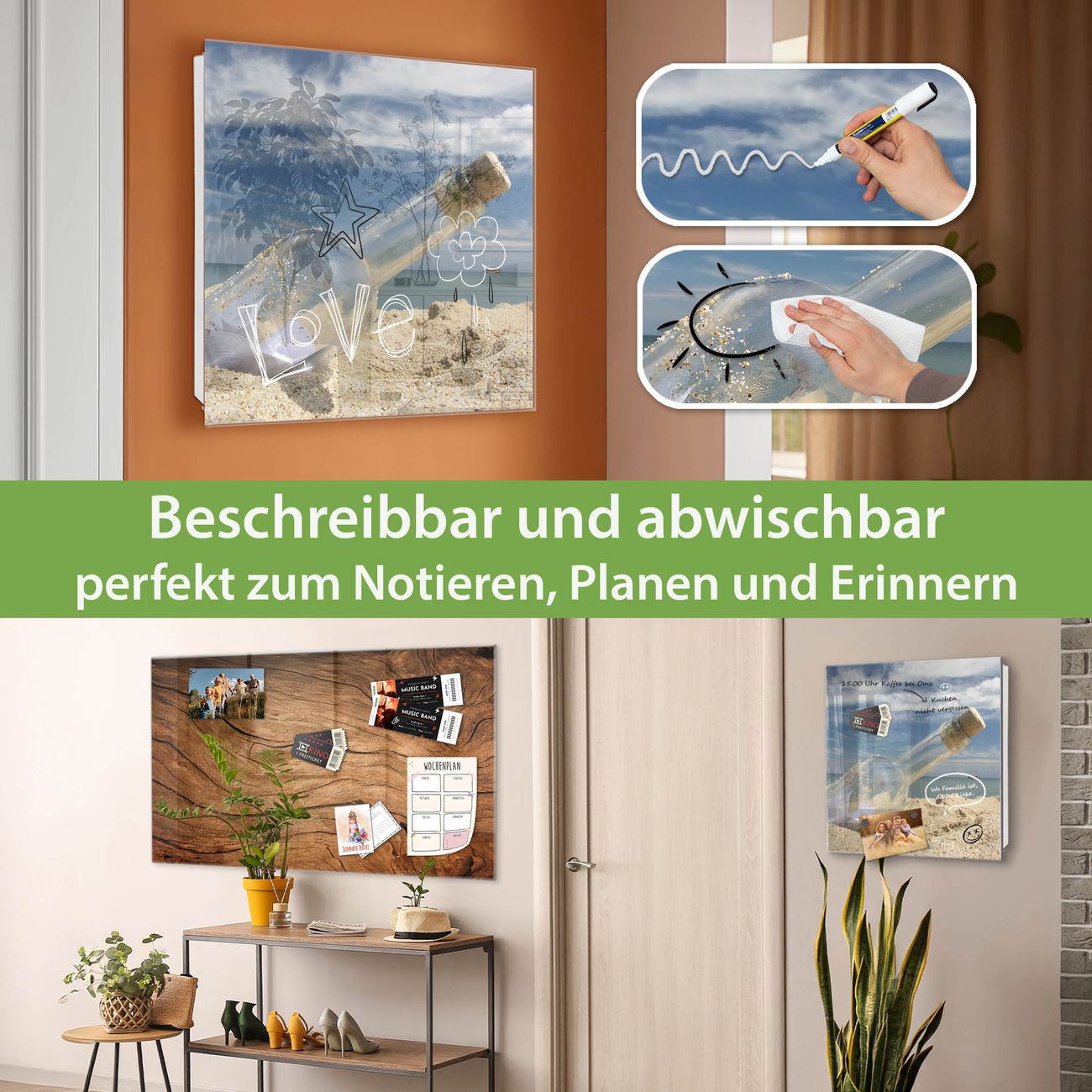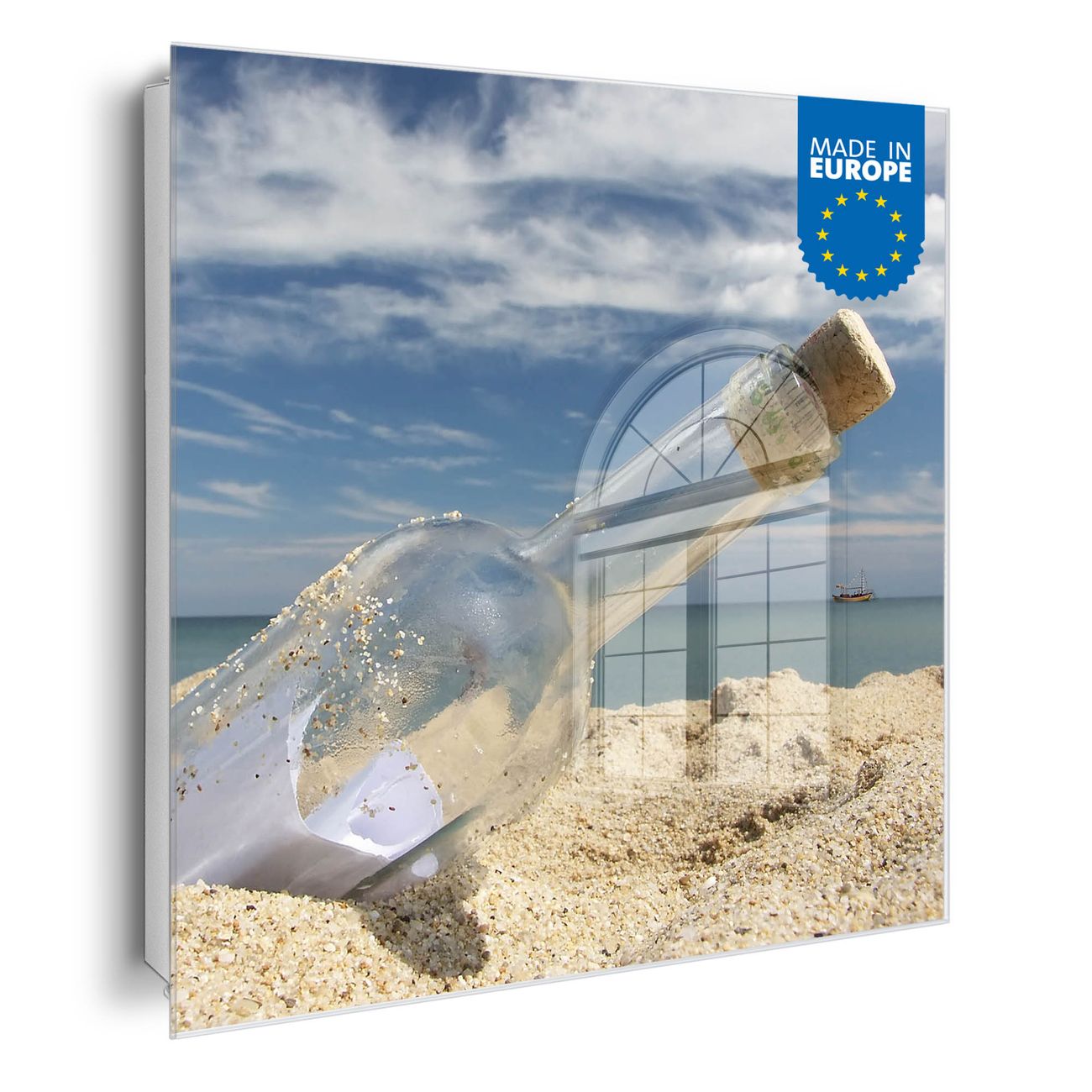Bringe Ordnung und Eleganz in deinen Eingangsbereich mit dem banjado Schlüsselkasten Motiv Motiv Flaschenpost. Die moderne Schlüsselbox kombiniert funktionales Design mit hochwertiger Verarbeitung und wird so zu einem echten Hingucker in Flur, Büro oder Ferienwohnung. ✅ Stilvolle Schlüsselaufbewahrung mit Glasfront im Motiv Motiv Flaschenpost Der Design-Schlüsselkasten Motiv Motiv Flaschenpost bietet Platz für bis zu 50 Schlüssel, die auf 5 stabilen Reihen mit je 10 Haken übersichtlich verstaut werden. Mit seinen kompakten Maßen von 30 x 30 x 5 cm passt die Schlüsselbox perfekt auch in kleinere Räume. Der weiß lackierte Stahlkorpus mit rechts angeschlagenem Türscharnier harmoniert mit der Glasfront und fügt sich nahtlos in jedes Wohnambiente ein. Ob als Schlüsselorganizer für Zuhause oder als praktische Lösung für Büros, Praxen und Gewerbe, der banjado Schlüsselkasten sorgt für Ordnung und Übersicht. Dank der magnetischen, mit Kreidestiften beschreibbaren Glasfront kannst du Notizen anheften oder Termine direkt auf der Oberfläche festhalten. Die Schlüsselbox Motiv Motiv Flaschenpost zur Wandmontage wird inklusive Befestigungsmaterial geliefert und ist schnell angebracht. So hast du deine Schlüssel jederzeit griffbereit und zugleich stilvoll verstaut. Mit diesem banjado Schlüsselkasten Motiv Motiv Flaschenpost kombinierst du praktische Aufbewahrung mit stilvollem Wohndesign. Ob privat oder geschäftlich, die Schlüsselbox sorgt für mehr Ordnung, Übersicht und ein wohnliches Ambiente.Vorteile im Überblick