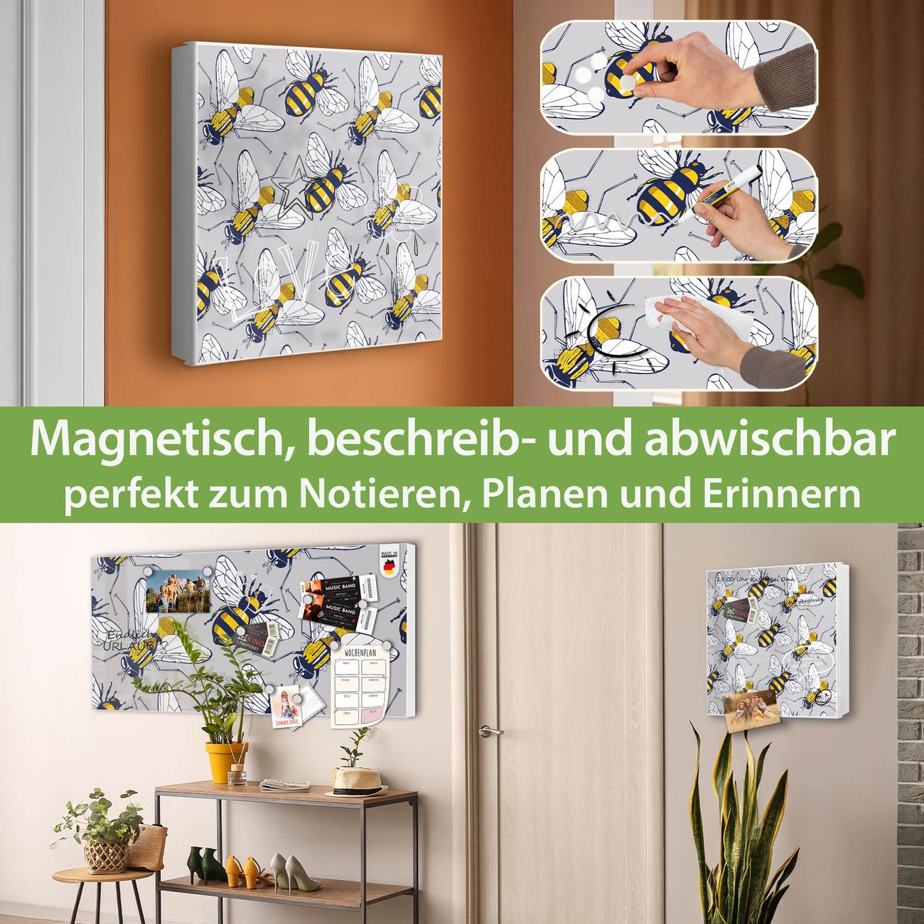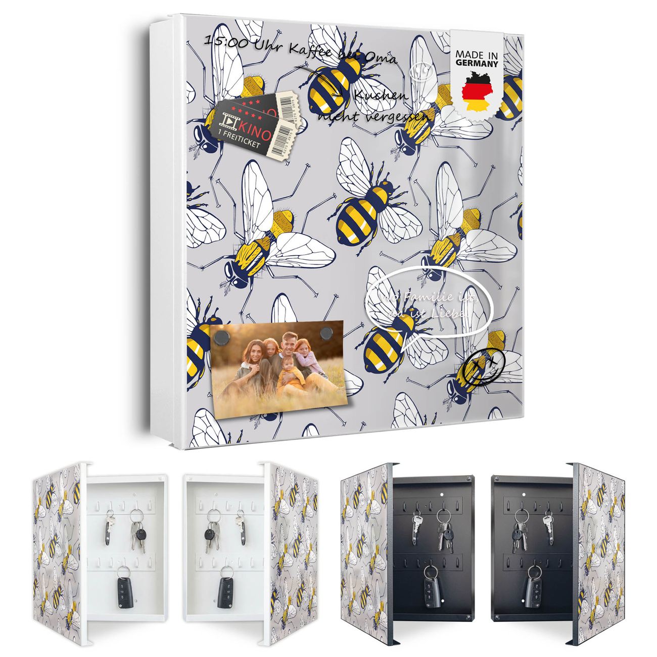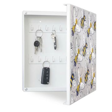 Bringe Ordnung und Eleganz in deinen Eingangsbereich mit dem banjado Schlüsselkasten Motiv Motiv Fliegen und Bienen. Die moderne Schlüsselbox kombiniert funktionales Design mit hochwertiger Verarbeitung und wird so zu einem echten Hingucker in Flur, Büro oder Ferienwohnung. ✅ Stilvolle Schlüsselaufbewahrung mit Motiv Motiv Fliegen und Bienen Der Design-Schlüsselkasten Motiv Motiv Fliegen und Bienen bietet Platz für bis zu 32 Schlüssel, die auf 4 stabilen Reihen mit je 8 Haken übersichtlich verstaut werden. Mit seinen kompakten Maßen von 30 x 30 x 5 cm passt die Schlüsselbox perfekt auch in kleinere Räume. Der weiß lackierte Stahlkorpus mit rechts angeschlagenem Türscharnier harmoniert mit gedruckten Folie auf der Front und fügt sich nahtlos in jedes Wohnambiente ein. Ob als Schlüsselorganizer für Zuhause oder als praktische Lösung für Büros, Praxen und Gewerbe, der banjado Schlüsselkasten sorgt für Ordnung und Übersicht. Dank der magnetischen, mit Kreidestiften beschreibbaren Folie auf der Front kannst du Notizen anheften oder Termine direkt auf der Oberfläche festhalten. Die Schlüsselbox Motiv Motiv Fliegen und Bienen zur Wandmontage wird inklusive Befestigungsmaterial geliefert und ist schnell angebracht. So hast du deine Schlüssel jederzeit griffbereit und zugleich stilvoll verstaut. Mit diesem banjado Schlüsselkasten Motiv Motiv Fliegen und Bienen kombinierst du praktische Aufbewahrung mit stilvollem Wohndesign. Ob privat oder geschäftlich, die Schlüsselbox sorgt für mehr Ordnung, Übersicht und ein wohnliches Ambiente.Vorteile im Überblick