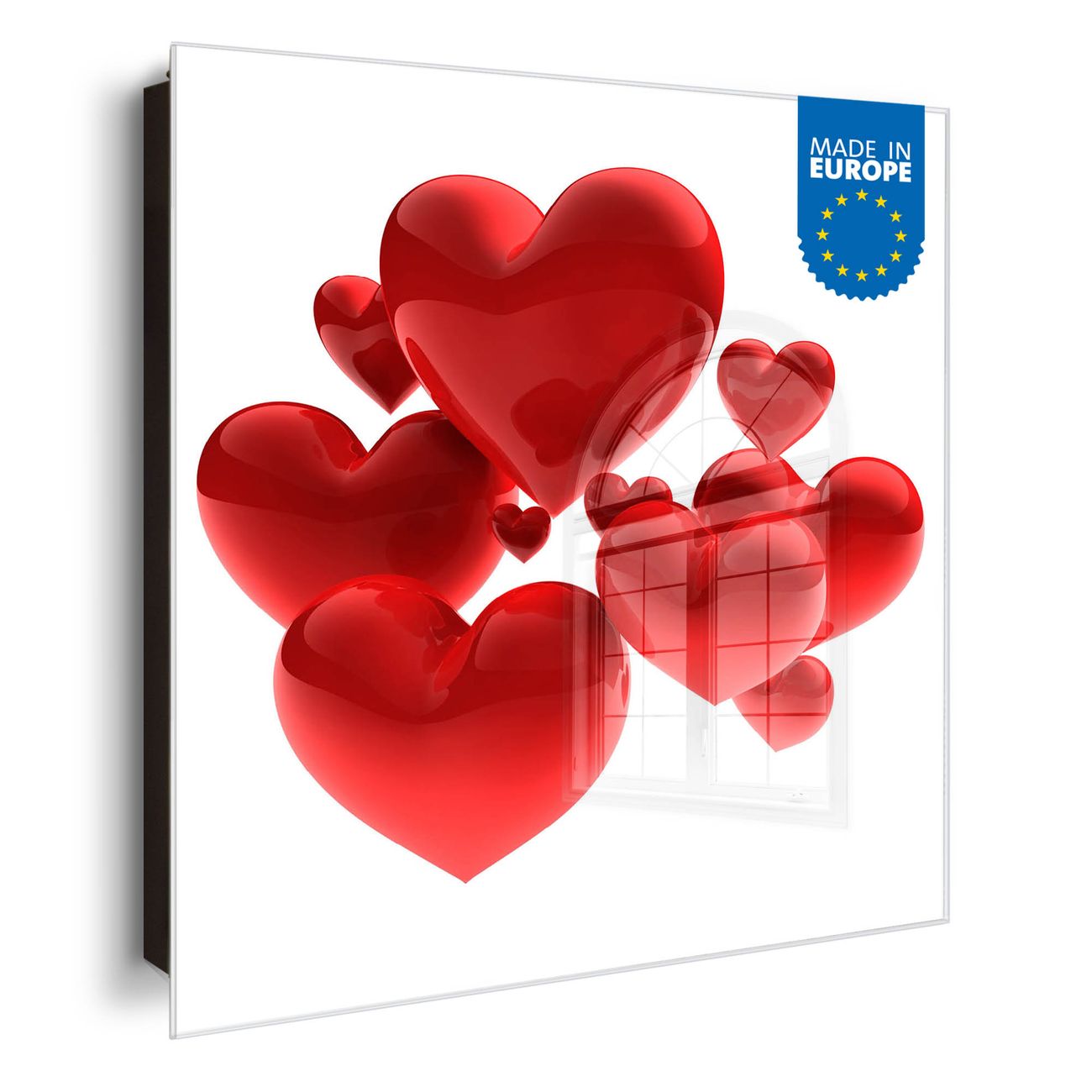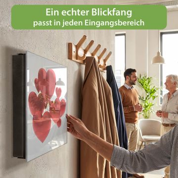 Bringe Ordnung und Eleganz in deinen Eingangsbereich mit dem banjado Schlüsselkasten Motiv Motiv Fliegende Herzen. Die moderne Schlüsselbox kombiniert funktionales Design mit hochwertiger Verarbeitung und wird so zu einem echten Hingucker in Flur, Büro oder Ferienwohnung. ✅ Stilvolle Schlüsselaufbewahrung mit Glasfront im Motiv Motiv Fliegende Herzen Der Design-Schlüsselkasten Motiv Motiv Fliegende Herzen bietet Platz für bis zu 50 Schlüssel, die auf 5 stabilen Reihen mit je 10 Haken übersichtlich verstaut werden. Mit seinen kompakten Maßen von 30 x 30 x 5 cm passt die Schlüsselbox perfekt auch in kleinere Räume. Der schwarz lackierte Stahlkorpus mit rechts angeschlagenem Türscharnier harmoniert mit der Glasfront und fügt sich nahtlos in jedes Wohnambiente ein. Ob als Schlüsselorganizer für Zuhause oder als praktische Lösung für Büros, Praxen und Gewerbe, der banjado Schlüsselkasten sorgt für Ordnung und Übersicht. Dank der magnetischen, mit Kreidestiften beschreibbaren Glasfront kannst du Notizen anheften oder Termine direkt auf der Oberfläche festhalten. Die Schlüsselbox Motiv Motiv Fliegende Herzen zur Wandmontage wird inklusive Befestigungsmaterial geliefert und ist schnell angebracht. So hast du deine Schlüssel jederzeit griffbereit und zugleich stilvoll verstaut. Mit diesem banjado Schlüsselkasten Motiv Motiv Fliegende Herzen kombinierst du praktische Aufbewahrung mit stilvollem Wohndesign. Ob privat oder geschäftlich, die Schlüsselbox sorgt für mehr Ordnung, Übersicht und ein wohnliches Ambiente.Vorteile im Überblick