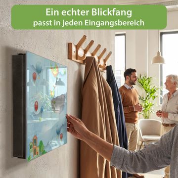 Bringe Ordnung und Eleganz in deinen Eingangsbereich mit dem banjado Schlüsselkasten Motiv Motiv fliegender Regenschirm. Die moderne Schlüsselbox kombiniert funktionales Design mit hochwertiger Verarbeitung und wird so zu einem echten Hingucker in Flur, Büro oder Ferienwohnung. ✅ Stilvolle Schlüsselaufbewahrung mit Glasfront im Motiv Motiv fliegender Regenschirm Der Design-Schlüsselkasten Motiv Motiv fliegender Regenschirm bietet Platz für bis zu 50 Schlüssel, die auf 5 stabilen Reihen mit je 10 Haken übersichtlich verstaut werden. Mit seinen kompakten Maßen von 30 x 30 x 5 cm passt die Schlüsselbox perfekt auch in kleinere Räume. Der schwarz lackierte Stahlkorpus mit rechts angeschlagenem Türscharnier harmoniert mit der Glasfront und fügt sich nahtlos in jedes Wohnambiente ein. Ob als Schlüsselorganizer für Zuhause oder als praktische Lösung für Büros, Praxen und Gewerbe, der banjado Schlüsselkasten sorgt für Ordnung und Übersicht. Dank der magnetischen, mit Kreidestiften beschreibbaren Glasfront kannst du Notizen anheften oder Termine direkt auf der Oberfläche festhalten. Die Schlüsselbox Motiv Motiv fliegender Regenschirm zur Wandmontage wird inklusive Befestigungsmaterial geliefert und ist schnell angebracht. So hast du deine Schlüssel jederzeit griffbereit und zugleich stilvoll verstaut. Mit diesem banjado Schlüsselkasten Motiv Motiv fliegender Regenschirm kombinierst du praktische Aufbewahrung mit stilvollem Wohndesign. Ob privat oder geschäftlich, die Schlüsselbox sorgt für mehr Ordnung, Übersicht und ein wohnliches Ambiente.Vorteile im Überblick