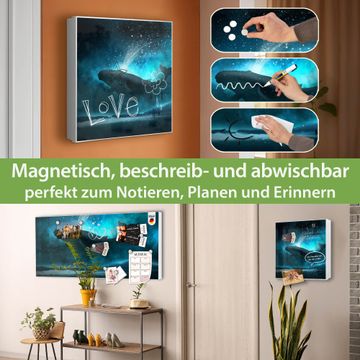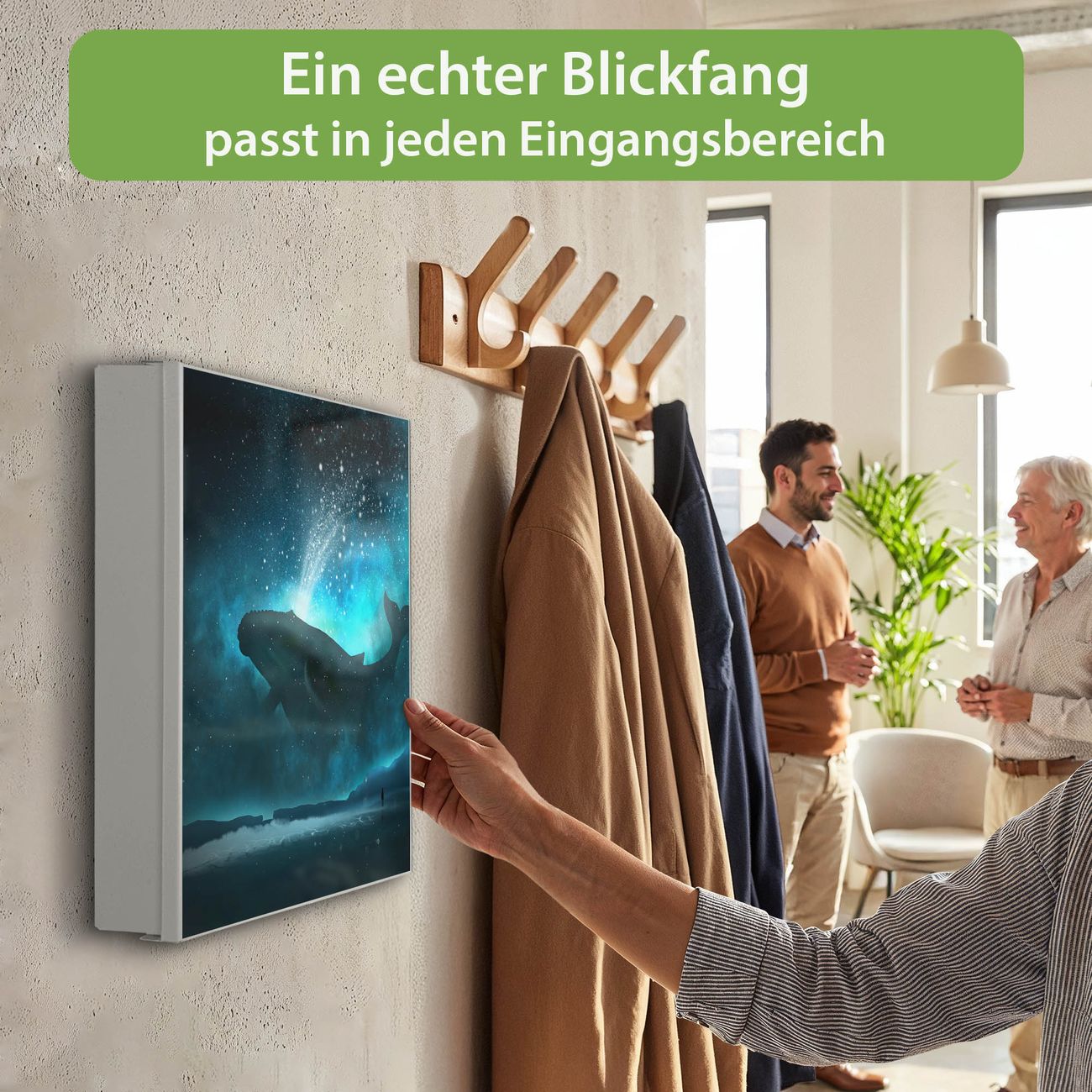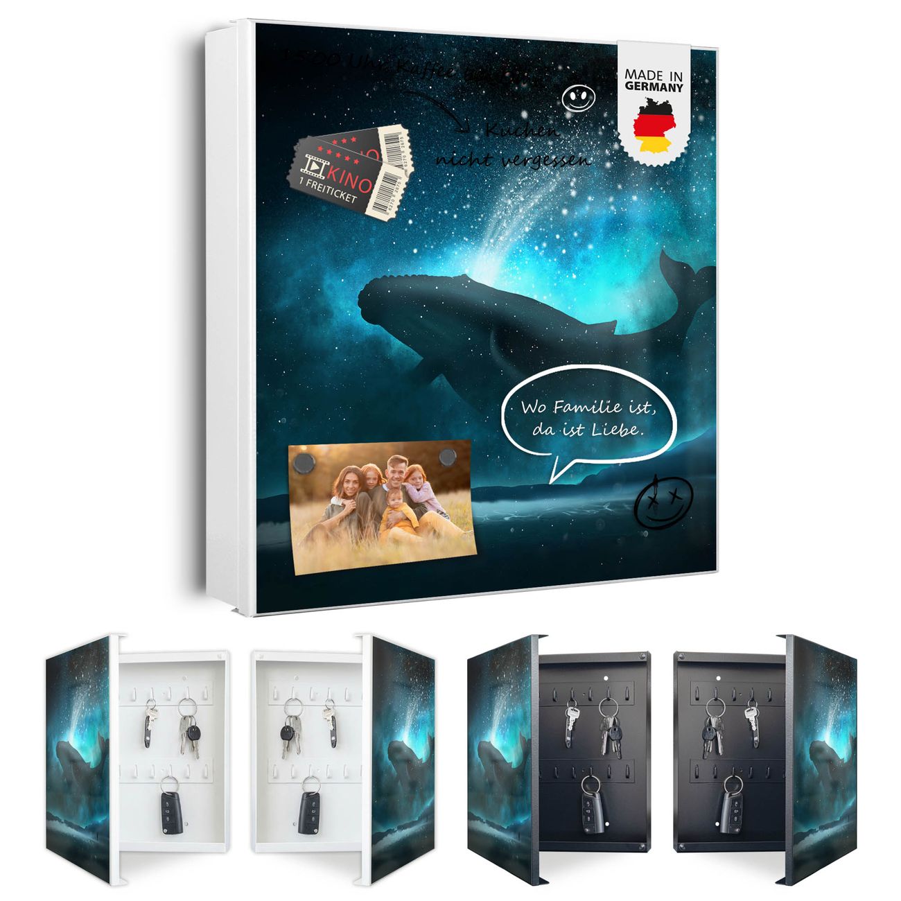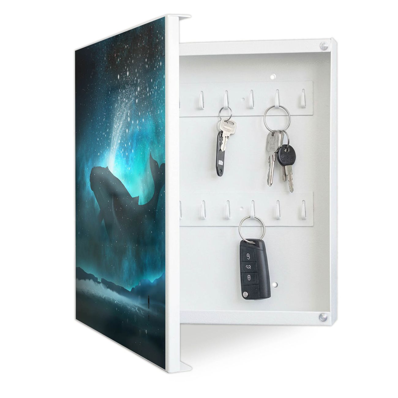 Bringe Ordnung und Eleganz in deinen Eingangsbereich mit dem banjado Schlüsselkasten Motiv Motiv fliegender Wal. Die moderne Schlüsselbox kombiniert funktionales Design mit hochwertiger Verarbeitung und wird so zu einem echten Hingucker in Flur, Büro oder Ferienwohnung. ✅ Stilvolle Schlüsselaufbewahrung mit Motiv Motiv fliegender Wal Der Design-Schlüsselkasten Motiv Motiv fliegender Wal bietet Platz für bis zu 32 Schlüssel, die auf 4 stabilen Reihen mit je 8 Haken übersichtlich verstaut werden. Mit seinen kompakten Maßen von 30 x 30 x 5 cm passt die Schlüsselbox perfekt auch in kleinere Räume. Der weiß lackierte Stahlkorpus mit links angeschlagenem Türscharnier harmoniert mit gedruckten Folie auf der Front und fügt sich nahtlos in jedes Wohnambiente ein. Ob als Schlüsselorganizer für Zuhause oder als praktische Lösung für Büros, Praxen und Gewerbe, der banjado Schlüsselkasten sorgt für Ordnung und Übersicht. Dank der magnetischen, mit Kreidestiften beschreibbaren Folie auf der Front kannst du Notizen anheften oder Termine direkt auf der Oberfläche festhalten. Die Schlüsselbox Motiv Motiv fliegender Wal zur Wandmontage wird inklusive Befestigungsmaterial geliefert und ist schnell angebracht. So hast du deine Schlüssel jederzeit griffbereit und zugleich stilvoll verstaut. Mit diesem banjado Schlüsselkasten Motiv Motiv fliegender Wal kombinierst du praktische Aufbewahrung mit stilvollem Wohndesign. Ob privat oder geschäftlich, die Schlüsselbox sorgt für mehr Ordnung, Übersicht und ein wohnliches Ambiente.Vorteile im Überblick