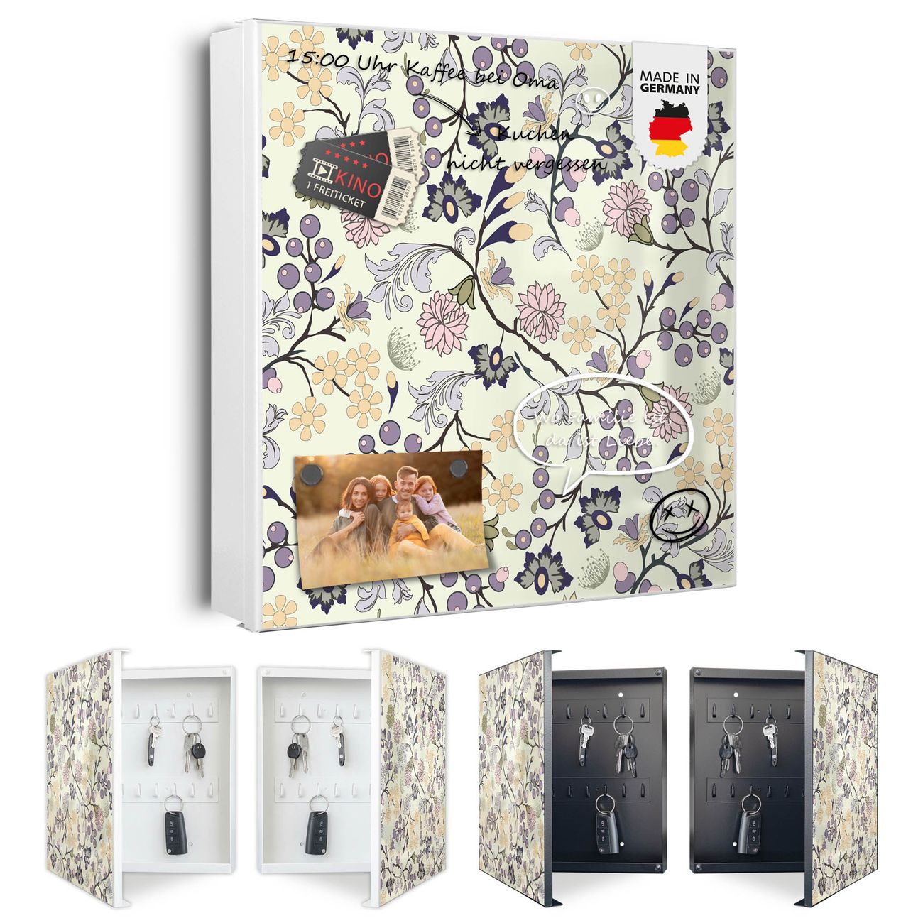 Bringe Ordnung und Eleganz in deinen Eingangsbereich mit dem banjado Schlüsselkasten Motiv Motiv Florale Tapete. Die moderne Schlüsselbox kombiniert funktionales Design mit hochwertiger Verarbeitung und wird so zu einem echten Hingucker in Flur, Büro oder Ferienwohnung. ✅ Stilvolle Schlüsselaufbewahrung mit Motiv Motiv Florale Tapete Der Design-Schlüsselkasten Motiv Motiv Florale Tapete bietet Platz für bis zu 32 Schlüssel, die auf 4 stabilen Reihen mit je 8 Haken übersichtlich verstaut werden. Mit seinen kompakten Maßen von 30 x 30 x 5 cm passt die Schlüsselbox perfekt auch in kleinere Räume. Der weiß lackierte Stahlkorpus mit links angeschlagenem Türscharnier harmoniert mit gedruckten Folie auf der Front und fügt sich nahtlos in jedes Wohnambiente ein. Ob als Schlüsselorganizer für Zuhause oder als praktische Lösung für Büros, Praxen und Gewerbe, der banjado Schlüsselkasten sorgt für Ordnung und Übersicht. Dank der magnetischen, mit Kreidestiften beschreibbaren Folie auf der Front kannst du Notizen anheften oder Termine direkt auf der Oberfläche festhalten. Die Schlüsselbox Motiv Motiv Florale Tapete zur Wandmontage wird inklusive Befestigungsmaterial geliefert und ist schnell angebracht. So hast du deine Schlüssel jederzeit griffbereit und zugleich stilvoll verstaut. Mit diesem banjado Schlüsselkasten Motiv Motiv Florale Tapete kombinierst du praktische Aufbewahrung mit stilvollem Wohndesign. Ob privat oder geschäftlich, die Schlüsselbox sorgt für mehr Ordnung, Übersicht und ein wohnliches Ambiente.Vorteile im Überblick