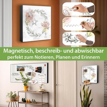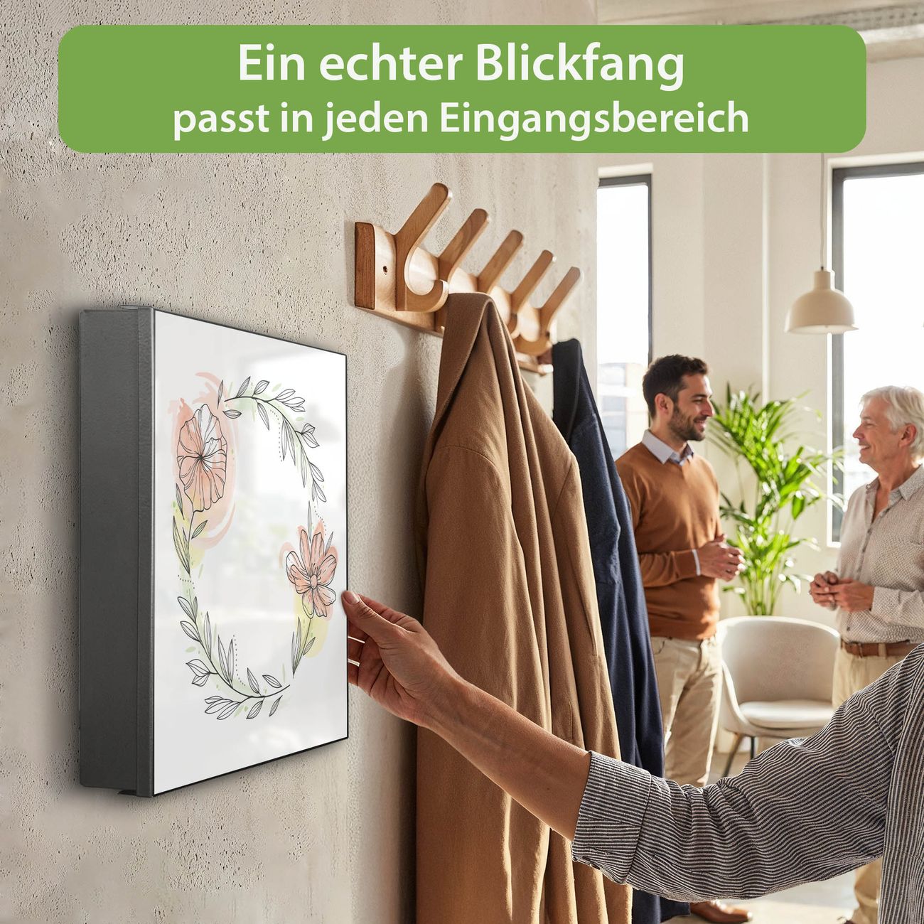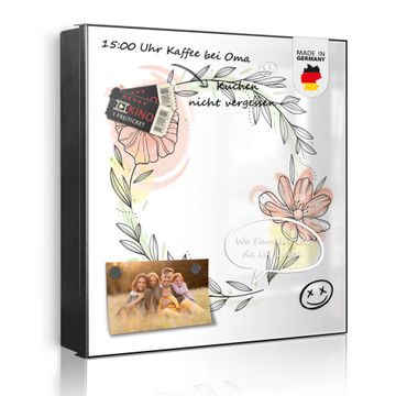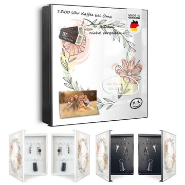 Bringe Ordnung und Eleganz in deinen Eingangsbereich mit dem banjado Schlüsselkasten Motiv Motiv Floraler Blütenkranz. Die moderne Schlüsselbox kombiniert funktionales Design mit hochwertiger Verarbeitung und wird so zu einem echten Hingucker in Flur, Büro oder Ferienwohnung. ✅ Stilvolle Schlüsselaufbewahrung mit Motiv Motiv Floraler Blütenkranz Der Design-Schlüsselkasten Motiv Motiv Floraler Blütenkranz bietet Platz für bis zu 32 Schlüssel, die auf 4 stabilen Reihen mit je 8 Haken übersichtlich verstaut werden. Mit seinen kompakten Maßen von 30 x 30 x 5 cm passt die Schlüsselbox perfekt auch in kleinere Räume. Der schwarz lackierte Stahlkorpus mit links angeschlagenem Türscharnier harmoniert mit gedruckten Folie auf der Front und fügt sich nahtlos in jedes Wohnambiente ein. Ob als Schlüsselorganizer für Zuhause oder als praktische Lösung für Büros, Praxen und Gewerbe, der banjado Schlüsselkasten sorgt für Ordnung und Übersicht. Dank der magnetischen, mit Kreidestiften beschreibbaren Folie auf der Front kannst du Notizen anheften oder Termine direkt auf der Oberfläche festhalten. Die Schlüsselbox Motiv Motiv Floraler Blütenkranz zur Wandmontage wird inklusive Befestigungsmaterial geliefert und ist schnell angebracht. So hast du deine Schlüssel jederzeit griffbereit und zugleich stilvoll verstaut. Mit diesem banjado Schlüsselkasten Motiv Motiv Floraler Blütenkranz kombinierst du praktische Aufbewahrung mit stilvollem Wohndesign. Ob privat oder geschäftlich, die Schlüsselbox sorgt für mehr Ordnung, Übersicht und ein wohnliches Ambiente.Vorteile im Überblick