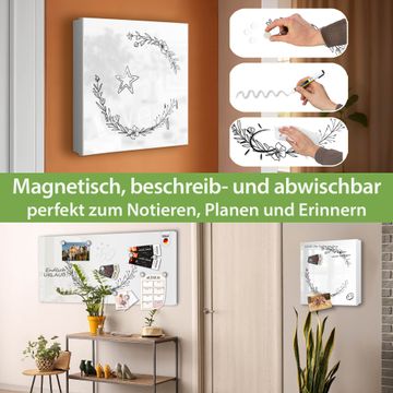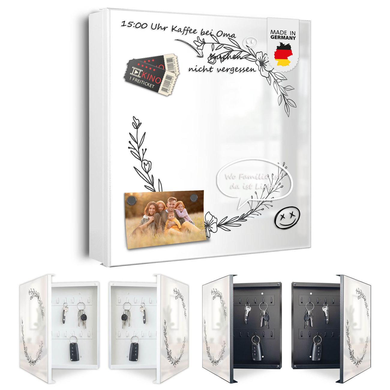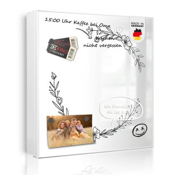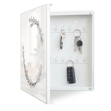 Bringe Ordnung und Eleganz in deinen Eingangsbereich mit dem banjado Schlüsselkasten Motiv Motiv Floraler Linienkranz. Die moderne Schlüsselbox kombiniert funktionales Design mit hochwertiger Verarbeitung und wird so zu einem echten Hingucker in Flur, Büro oder Ferienwohnung. ✅ Stilvolle Schlüsselaufbewahrung mit Motiv Motiv Floraler Linienkranz Der Design-Schlüsselkasten Motiv Motiv Floraler Linienkranz bietet Platz für bis zu 32 Schlüssel, die auf 4 stabilen Reihen mit je 8 Haken übersichtlich verstaut werden. Mit seinen kompakten Maßen von 30 x 30 x 5 cm passt die Schlüsselbox perfekt auch in kleinere Räume. Der weiß lackierte Stahlkorpus mit links angeschlagenem Türscharnier harmoniert mit gedruckten Folie auf der Front und fügt sich nahtlos in jedes Wohnambiente ein. Ob als Schlüsselorganizer für Zuhause oder als praktische Lösung für Büros, Praxen und Gewerbe, der banjado Schlüsselkasten sorgt für Ordnung und Übersicht. Dank der magnetischen, mit Kreidestiften beschreibbaren Folie auf der Front kannst du Notizen anheften oder Termine direkt auf der Oberfläche festhalten. Die Schlüsselbox Motiv Motiv Floraler Linienkranz zur Wandmontage wird inklusive Befestigungsmaterial geliefert und ist schnell angebracht. So hast du deine Schlüssel jederzeit griffbereit und zugleich stilvoll verstaut. Mit diesem banjado Schlüsselkasten Motiv Motiv Floraler Linienkranz kombinierst du praktische Aufbewahrung mit stilvollem Wohndesign. Ob privat oder geschäftlich, die Schlüsselbox sorgt für mehr Ordnung, Übersicht und ein wohnliches Ambiente.Vorteile im Überblick