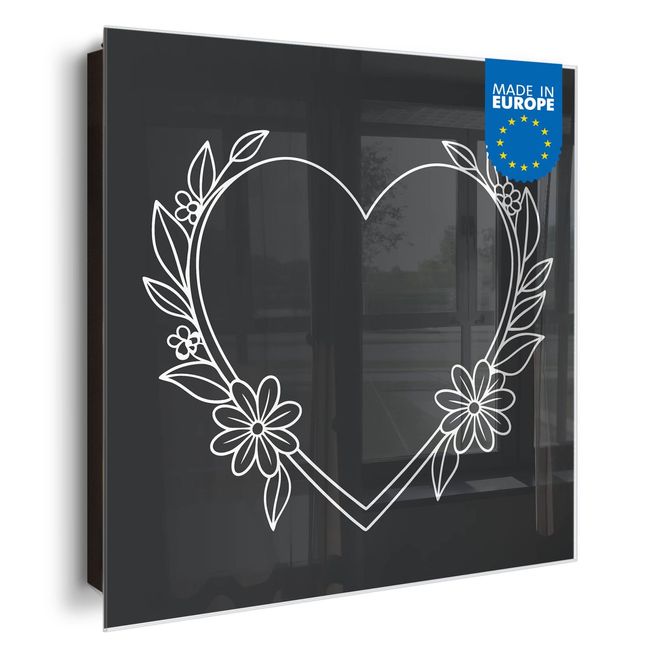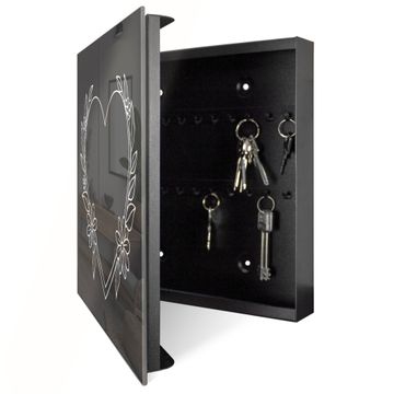 Bringe Ordnung und Eleganz in deinen Eingangsbereich mit dem banjado Schlüsselkasten Motiv Motiv Florales Herzdesign. Die moderne Schlüsselbox kombiniert funktionales Design mit hochwertiger Verarbeitung und wird so zu einem echten Hingucker in Flur, Büro oder Ferienwohnung. ✅ Stilvolle Schlüsselaufbewahrung mit Glasfront im Motiv Motiv Florales Herzdesign Der Design-Schlüsselkasten Motiv Motiv Florales Herzdesign bietet Platz für bis zu 50 Schlüssel, die auf 5 stabilen Reihen mit je 10 Haken übersichtlich verstaut werden. Mit seinen kompakten Maßen von 30 x 30 x 5 cm passt die Schlüsselbox perfekt auch in kleinere Räume. Der schwarz lackierte Stahlkorpus mit rechts angeschlagenem Türscharnier harmoniert mit der Glasfront und fügt sich nahtlos in jedes Wohnambiente ein. Ob als Schlüsselorganizer für Zuhause oder als praktische Lösung für Büros, Praxen und Gewerbe, der banjado Schlüsselkasten sorgt für Ordnung und Übersicht. Dank der magnetischen, mit Kreidestiften beschreibbaren Glasfront kannst du Notizen anheften oder Termine direkt auf der Oberfläche festhalten. Die Schlüsselbox Motiv Motiv Florales Herzdesign zur Wandmontage wird inklusive Befestigungsmaterial geliefert und ist schnell angebracht. So hast du deine Schlüssel jederzeit griffbereit und zugleich stilvoll verstaut. Mit diesem banjado Schlüsselkasten Motiv Motiv Florales Herzdesign kombinierst du praktische Aufbewahrung mit stilvollem Wohndesign. Ob privat oder geschäftlich, die Schlüsselbox sorgt für mehr Ordnung, Übersicht und ein wohnliches Ambiente.Vorteile im Überblick