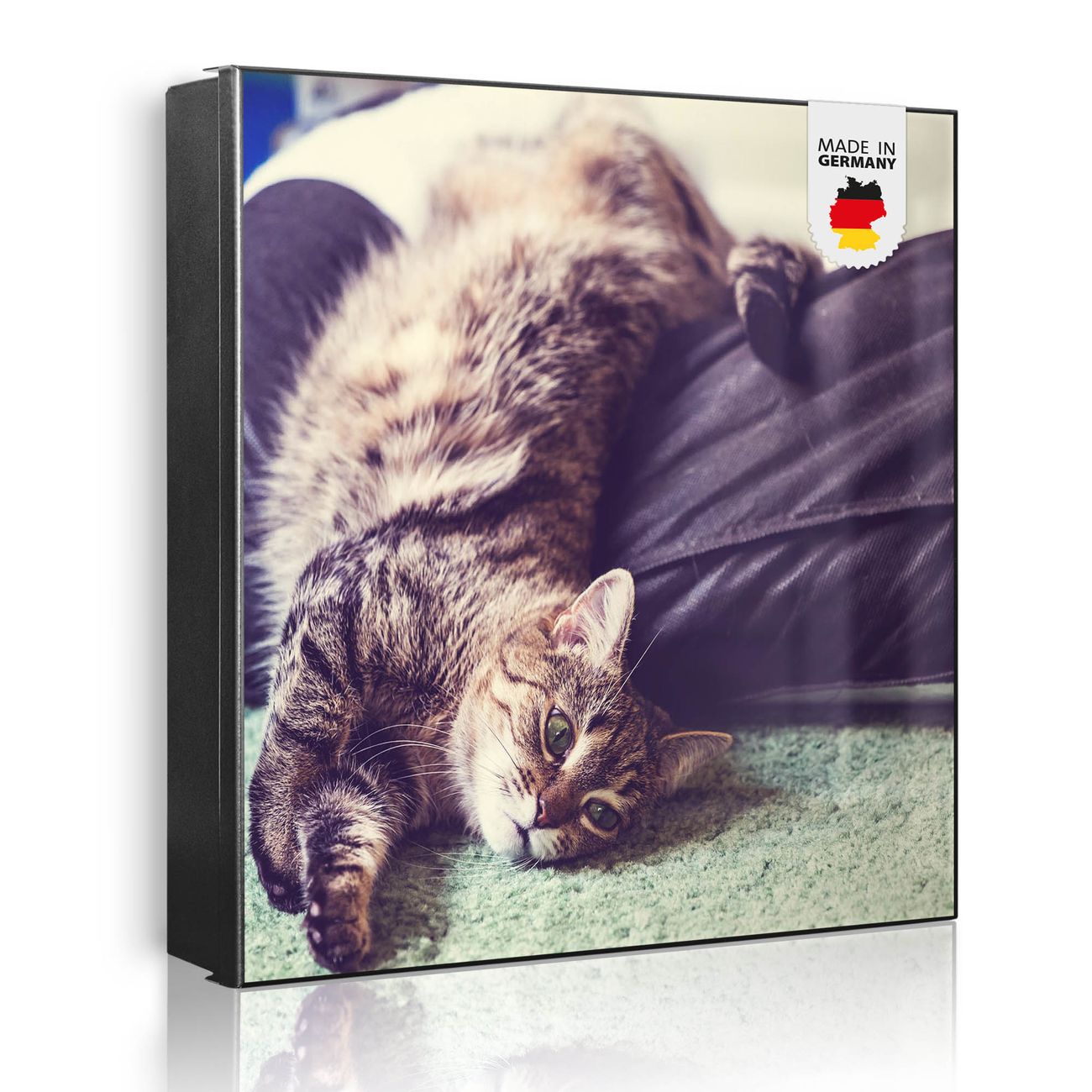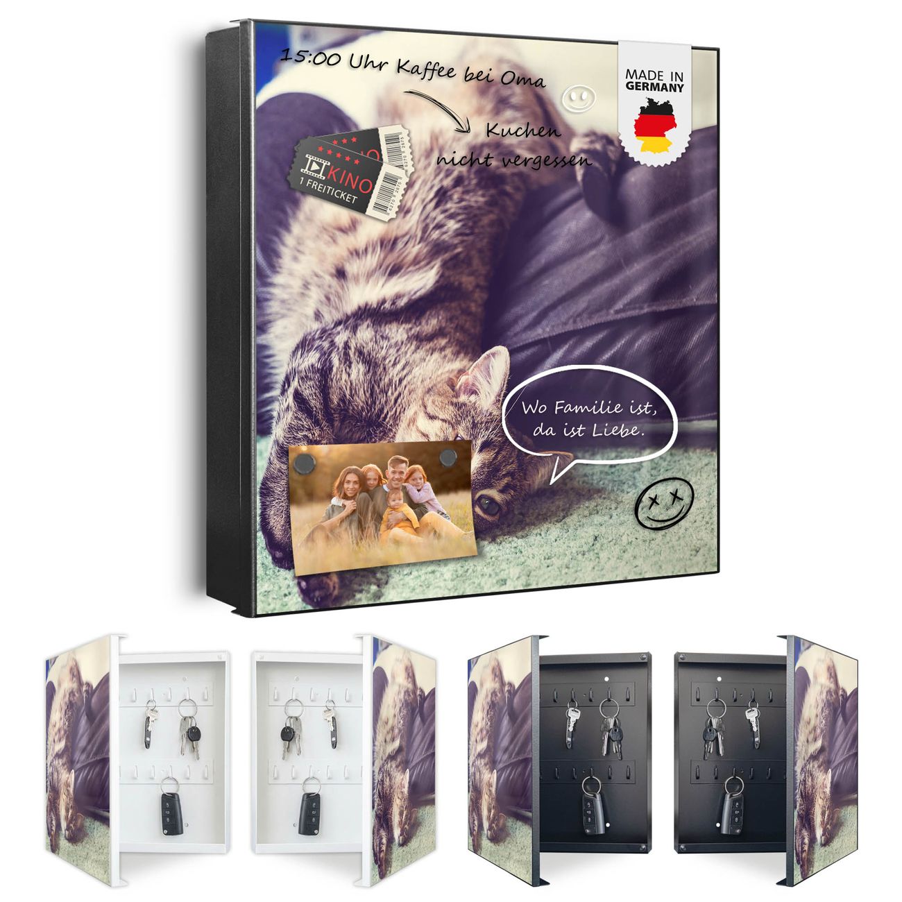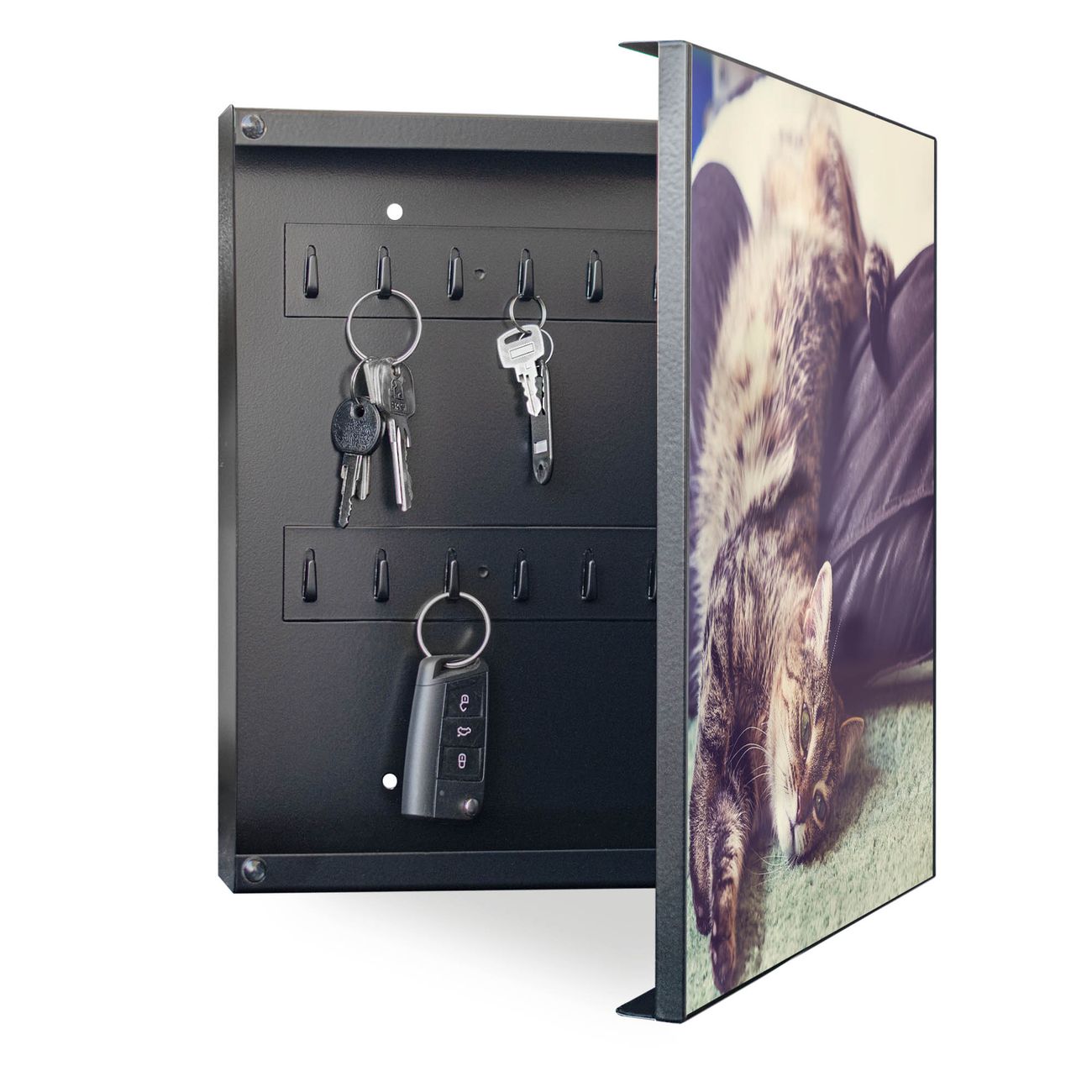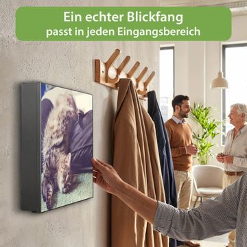 Bringe Ordnung und Eleganz in deinen Eingangsbereich mit dem banjado Schlüsselkasten Motiv Motiv Florian. Die moderne Schlüsselbox kombiniert funktionales Design mit hochwertiger Verarbeitung und wird so zu einem echten Hingucker in Flur, Büro oder Ferienwohnung. ✅ Stilvolle Schlüsselaufbewahrung mit Motiv Motiv Florian Der Design-Schlüsselkasten Motiv Motiv Florian bietet Platz für bis zu 32 Schlüssel, die auf 4 stabilen Reihen mit je 8 Haken übersichtlich verstaut werden. Mit seinen kompakten Maßen von 30 x 30 x 5 cm passt die Schlüsselbox perfekt auch in kleinere Räume. Der schwarz lackierte Stahlkorpus mit rechts angeschlagenem Türscharnier harmoniert mit gedruckten Folie auf der Front und fügt sich nahtlos in jedes Wohnambiente ein. Ob als Schlüsselorganizer für Zuhause oder als praktische Lösung für Büros, Praxen und Gewerbe, der banjado Schlüsselkasten sorgt für Ordnung und Übersicht. Dank der magnetischen, mit Kreidestiften beschreibbaren Folie auf der Front kannst du Notizen anheften oder Termine direkt auf der Oberfläche festhalten. Die Schlüsselbox Motiv Motiv Florian zur Wandmontage wird inklusive Befestigungsmaterial geliefert und ist schnell angebracht. So hast du deine Schlüssel jederzeit griffbereit und zugleich stilvoll verstaut. Mit diesem banjado Schlüsselkasten Motiv Motiv Florian kombinierst du praktische Aufbewahrung mit stilvollem Wohndesign. Ob privat oder geschäftlich, die Schlüsselbox sorgt für mehr Ordnung, Übersicht und ein wohnliches Ambiente.Vorteile im Überblick