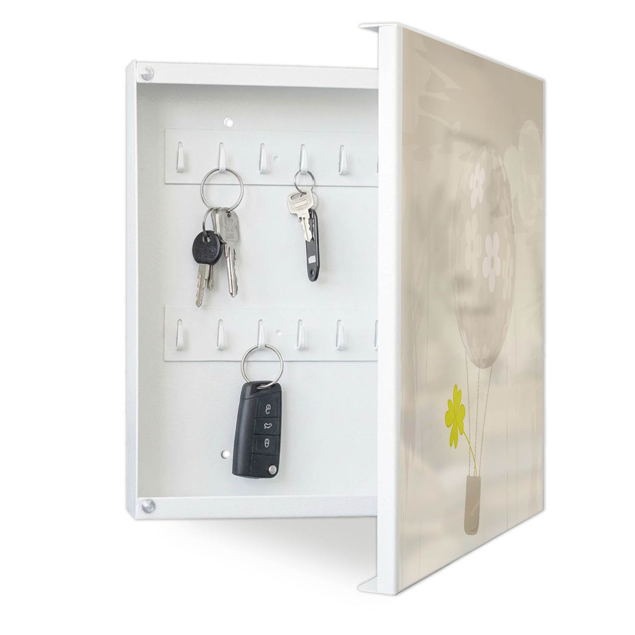 Bringe Ordnung und Eleganz in deinen Eingangsbereich mit dem banjado Schlüsselkasten Motiv Motiv Flüchtiges Glück. Die moderne Schlüsselbox kombiniert funktionales Design mit hochwertiger Verarbeitung und wird so zu einem echten Hingucker in Flur, Büro oder Ferienwohnung. ✅ Stilvolle Schlüsselaufbewahrung mit Motiv Motiv Flüchtiges Glück Der Design-Schlüsselkasten Motiv Motiv Flüchtiges Glück bietet Platz für bis zu 32 Schlüssel, die auf 4 stabilen Reihen mit je 8 Haken übersichtlich verstaut werden. Mit seinen kompakten Maßen von 30 x 30 x 5 cm passt die Schlüsselbox perfekt auch in kleinere Räume. Der weiß lackierte Stahlkorpus mit rechts angeschlagenem Türscharnier harmoniert mit gedruckten Folie auf der Front und fügt sich nahtlos in jedes Wohnambiente ein. Ob als Schlüsselorganizer für Zuhause oder als praktische Lösung für Büros, Praxen und Gewerbe, der banjado Schlüsselkasten sorgt für Ordnung und Übersicht. Dank der magnetischen, mit Kreidestiften beschreibbaren Folie auf der Front kannst du Notizen anheften oder Termine direkt auf der Oberfläche festhalten. Die Schlüsselbox Motiv Motiv Flüchtiges Glück zur Wandmontage wird inklusive Befestigungsmaterial geliefert und ist schnell angebracht. So hast du deine Schlüssel jederzeit griffbereit und zugleich stilvoll verstaut. Mit diesem banjado Schlüsselkasten Motiv Motiv Flüchtiges Glück kombinierst du praktische Aufbewahrung mit stilvollem Wohndesign. Ob privat oder geschäftlich, die Schlüsselbox sorgt für mehr Ordnung, Übersicht und ein wohnliches Ambiente.Vorteile im Überblick