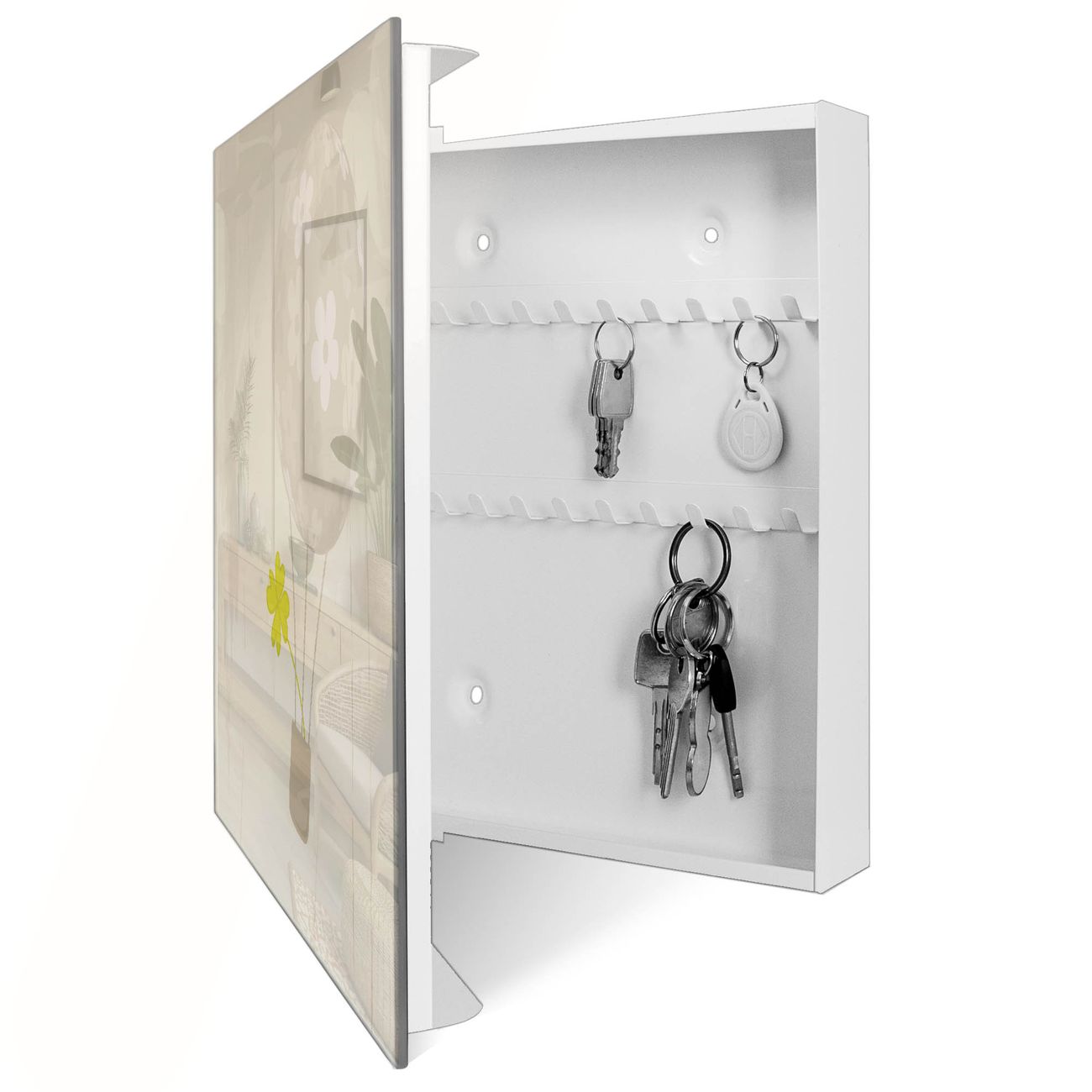 Bringe Ordnung und Eleganz in deinen Eingangsbereich mit dem banjado Schlüsselkasten Motiv Motiv Flüchtiges Glück. Die moderne Schlüsselbox kombiniert funktionales Design mit hochwertiger Verarbeitung und wird so zu einem echten Hingucker in Flur, Büro oder Ferienwohnung. ✅ Stilvolle Schlüsselaufbewahrung mit Glasfront im Motiv Motiv Flüchtiges Glück Der Design-Schlüsselkasten Motiv Motiv Flüchtiges Glück bietet Platz für bis zu 50 Schlüssel, die auf 5 stabilen Reihen mit je 10 Haken übersichtlich verstaut werden. Mit seinen kompakten Maßen von 30 x 30 x 5 cm passt die Schlüsselbox perfekt auch in kleinere Räume. Der weiß lackierte Stahlkorpus mit rechts angeschlagenem Türscharnier harmoniert mit der Glasfront und fügt sich nahtlos in jedes Wohnambiente ein. Ob als Schlüsselorganizer für Zuhause oder als praktische Lösung für Büros, Praxen und Gewerbe, der banjado Schlüsselkasten sorgt für Ordnung und Übersicht. Dank der magnetischen, mit Kreidestiften beschreibbaren Glasfront kannst du Notizen anheften oder Termine direkt auf der Oberfläche festhalten. Die Schlüsselbox Motiv Motiv Flüchtiges Glück zur Wandmontage wird inklusive Befestigungsmaterial geliefert und ist schnell angebracht. So hast du deine Schlüssel jederzeit griffbereit und zugleich stilvoll verstaut. Mit diesem banjado Schlüsselkasten Motiv Motiv Flüchtiges Glück kombinierst du praktische Aufbewahrung mit stilvollem Wohndesign. Ob privat oder geschäftlich, die Schlüsselbox sorgt für mehr Ordnung, Übersicht und ein wohnliches Ambiente.Vorteile im Überblick