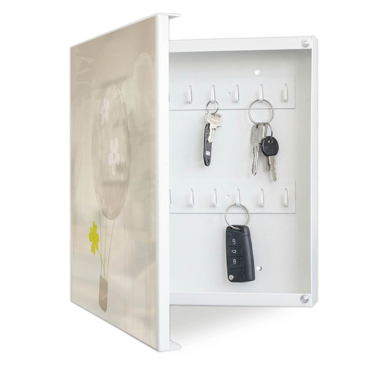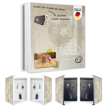 Bringe Ordnung und Eleganz in deinen Eingangsbereich mit dem banjado Schlüsselkasten Motiv Motiv Flüchtiges Glück. Die moderne Schlüsselbox kombiniert funktionales Design mit hochwertiger Verarbeitung und wird so zu einem echten Hingucker in Flur, Büro oder Ferienwohnung. ✅ Stilvolle Schlüsselaufbewahrung mit Motiv Motiv Flüchtiges Glück Der Design-Schlüsselkasten Motiv Motiv Flüchtiges Glück bietet Platz für bis zu 32 Schlüssel, die auf 4 stabilen Reihen mit je 8 Haken übersichtlich verstaut werden. Mit seinen kompakten Maßen von 30 x 30 x 5 cm passt die Schlüsselbox perfekt auch in kleinere Räume. Der weiß lackierte Stahlkorpus mit links angeschlagenem Türscharnier harmoniert mit gedruckten Folie auf der Front und fügt sich nahtlos in jedes Wohnambiente ein. Ob als Schlüsselorganizer für Zuhause oder als praktische Lösung für Büros, Praxen und Gewerbe, der banjado Schlüsselkasten sorgt für Ordnung und Übersicht. Dank der magnetischen, mit Kreidestiften beschreibbaren Folie auf der Front kannst du Notizen anheften oder Termine direkt auf der Oberfläche festhalten. Die Schlüsselbox Motiv Motiv Flüchtiges Glück zur Wandmontage wird inklusive Befestigungsmaterial geliefert und ist schnell angebracht. So hast du deine Schlüssel jederzeit griffbereit und zugleich stilvoll verstaut. Mit diesem banjado Schlüsselkasten Motiv Motiv Flüchtiges Glück kombinierst du praktische Aufbewahrung mit stilvollem Wohndesign. Ob privat oder geschäftlich, die Schlüsselbox sorgt für mehr Ordnung, Übersicht und ein wohnliches Ambiente.Vorteile im Überblick