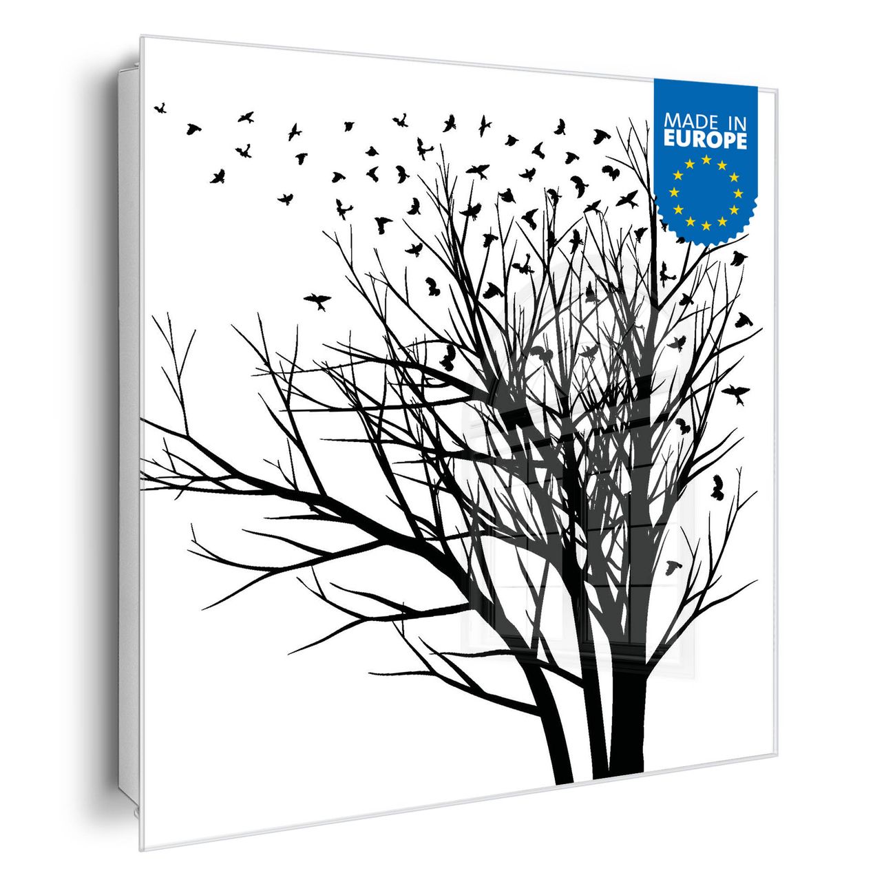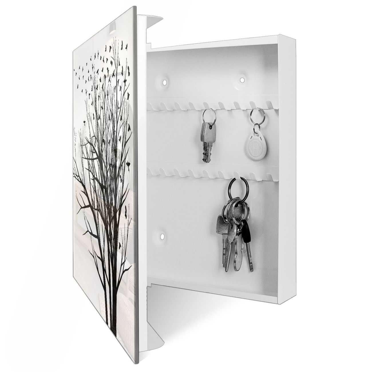 Bringe Ordnung und Eleganz in deinen Eingangsbereich mit dem banjado Schlüsselkasten Motiv Motiv Fortfliegen. Die moderne Schlüsselbox kombiniert funktionales Design mit hochwertiger Verarbeitung und wird so zu einem echten Hingucker in Flur, Büro oder Ferienwohnung. ✅ Stilvolle Schlüsselaufbewahrung mit Glasfront im Motiv Motiv Fortfliegen Der Design-Schlüsselkasten Motiv Motiv Fortfliegen bietet Platz für bis zu 50 Schlüssel, die auf 5 stabilen Reihen mit je 10 Haken übersichtlich verstaut werden. Mit seinen kompakten Maßen von 30 x 30 x 5 cm passt die Schlüsselbox perfekt auch in kleinere Räume. Der weiß lackierte Stahlkorpus mit rechts angeschlagenem Türscharnier harmoniert mit der Glasfront und fügt sich nahtlos in jedes Wohnambiente ein. Ob als Schlüsselorganizer für Zuhause oder als praktische Lösung für Büros, Praxen und Gewerbe, der banjado Schlüsselkasten sorgt für Ordnung und Übersicht. Dank der magnetischen, mit Kreidestiften beschreibbaren Glasfront kannst du Notizen anheften oder Termine direkt auf der Oberfläche festhalten. Die Schlüsselbox Motiv Motiv Fortfliegen zur Wandmontage wird inklusive Befestigungsmaterial geliefert und ist schnell angebracht. So hast du deine Schlüssel jederzeit griffbereit und zugleich stilvoll verstaut. Mit diesem banjado Schlüsselkasten Motiv Motiv Fortfliegen kombinierst du praktische Aufbewahrung mit stilvollem Wohndesign. Ob privat oder geschäftlich, die Schlüsselbox sorgt für mehr Ordnung, Übersicht und ein wohnliches Ambiente.Vorteile im Überblick