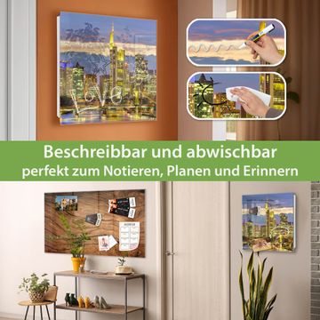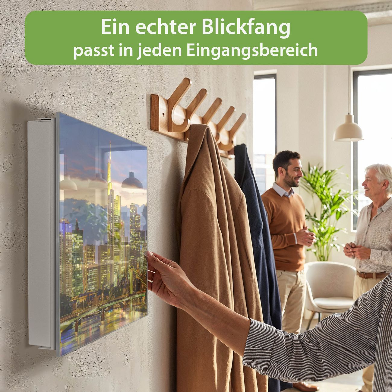 Bringe Ordnung und Eleganz in deinen Eingangsbereich mit dem banjado Schlüsselkasten Motiv Motiv Frankfurt Main. Die moderne Schlüsselbox kombiniert funktionales Design mit hochwertiger Verarbeitung und wird so zu einem echten Hingucker in Flur, Büro oder Ferienwohnung. ✅ Stilvolle Schlüsselaufbewahrung mit Glasfront im Motiv Motiv Frankfurt Main Der Design-Schlüsselkasten Motiv Motiv Frankfurt Main bietet Platz für bis zu 50 Schlüssel, die auf 5 stabilen Reihen mit je 10 Haken übersichtlich verstaut werden. Mit seinen kompakten Maßen von 30 x 30 x 5 cm passt die Schlüsselbox perfekt auch in kleinere Räume. Der weiß lackierte Stahlkorpus mit rechts angeschlagenem Türscharnier harmoniert mit der Glasfront und fügt sich nahtlos in jedes Wohnambiente ein. Ob als Schlüsselorganizer für Zuhause oder als praktische Lösung für Büros, Praxen und Gewerbe, der banjado Schlüsselkasten sorgt für Ordnung und Übersicht. Dank der magnetischen, mit Kreidestiften beschreibbaren Glasfront kannst du Notizen anheften oder Termine direkt auf der Oberfläche festhalten. Die Schlüsselbox Motiv Motiv Frankfurt Main zur Wandmontage wird inklusive Befestigungsmaterial geliefert und ist schnell angebracht. So hast du deine Schlüssel jederzeit griffbereit und zugleich stilvoll verstaut. Mit diesem banjado Schlüsselkasten Motiv Motiv Frankfurt Main kombinierst du praktische Aufbewahrung mit stilvollem Wohndesign. Ob privat oder geschäftlich, die Schlüsselbox sorgt für mehr Ordnung, Übersicht und ein wohnliches Ambiente.Vorteile im Überblick