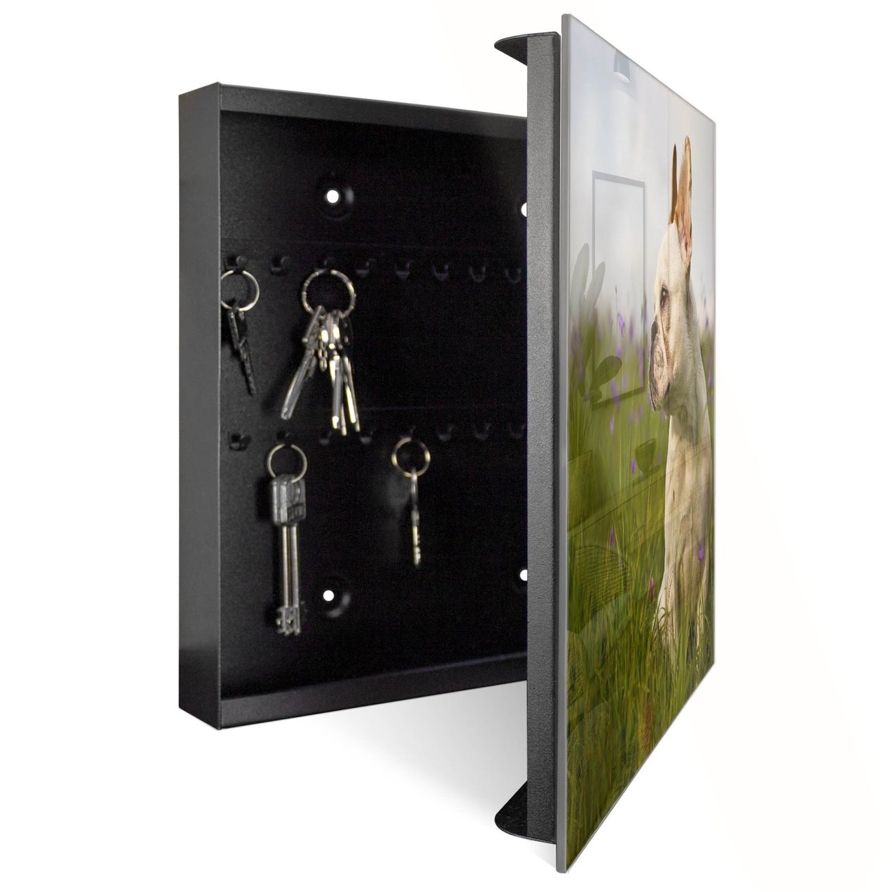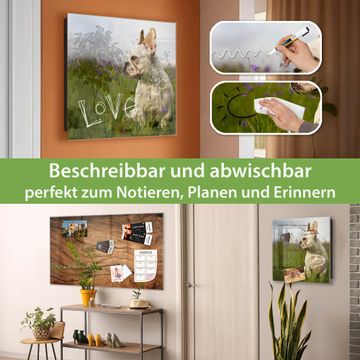 Bringe Ordnung und Eleganz in deinen Eingangsbereich mit dem banjado Schlüsselkasten Motiv Motiv Französische Bulldogge. Die moderne Schlüsselbox kombiniert funktionales Design mit hochwertiger Verarbeitung und wird so zu einem echten Hingucker in Flur, Büro oder Ferienwohnung. ✅ Stilvolle Schlüsselaufbewahrung mit Glasfront im Motiv Motiv Französische Bulldogge Der Design-Schlüsselkasten Motiv Motiv Französische Bulldogge bietet Platz für bis zu 50 Schlüssel, die auf 5 stabilen Reihen mit je 10 Haken übersichtlich verstaut werden. Mit seinen kompakten Maßen von 30 x 30 x 5 cm passt die Schlüsselbox perfekt auch in kleinere Räume. Der schwarz lackierte Stahlkorpus mit rechts angeschlagenem Türscharnier harmoniert mit der Glasfront und fügt sich nahtlos in jedes Wohnambiente ein. Ob als Schlüsselorganizer für Zuhause oder als praktische Lösung für Büros, Praxen und Gewerbe, der banjado Schlüsselkasten sorgt für Ordnung und Übersicht. Dank der magnetischen, mit Kreidestiften beschreibbaren Glasfront kannst du Notizen anheften oder Termine direkt auf der Oberfläche festhalten. Die Schlüsselbox Motiv Motiv Französische Bulldogge zur Wandmontage wird inklusive Befestigungsmaterial geliefert und ist schnell angebracht. So hast du deine Schlüssel jederzeit griffbereit und zugleich stilvoll verstaut. Mit diesem banjado Schlüsselkasten Motiv Motiv Französische Bulldogge kombinierst du praktische Aufbewahrung mit stilvollem Wohndesign. Ob privat oder geschäftlich, die Schlüsselbox sorgt für mehr Ordnung, Übersicht und ein wohnliches Ambiente.Vorteile im Überblick