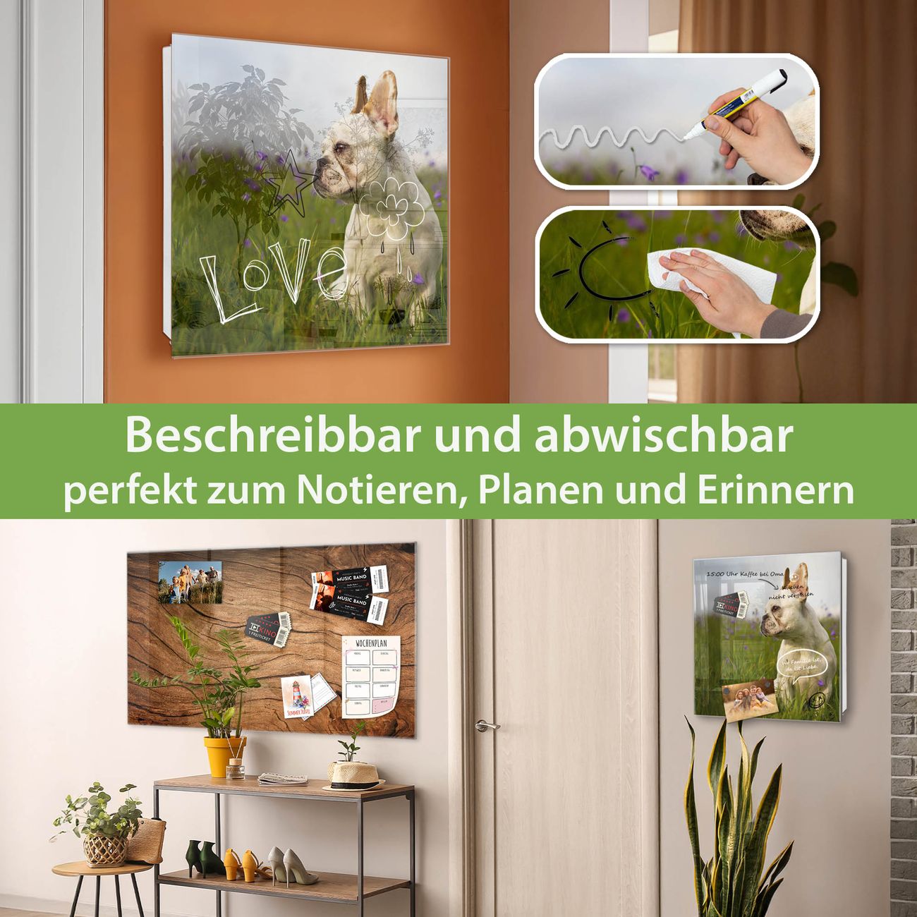 Bringe Ordnung und Eleganz in deinen Eingangsbereich mit dem banjado Schlüsselkasten Motiv Motiv Französische Bulldogge. Die moderne Schlüsselbox kombiniert funktionales Design mit hochwertiger Verarbeitung und wird so zu einem echten Hingucker in Flur, Büro oder Ferienwohnung. ✅ Stilvolle Schlüsselaufbewahrung mit Glasfront im Motiv Motiv Französische Bulldogge Der Design-Schlüsselkasten Motiv Motiv Französische Bulldogge bietet Platz für bis zu 50 Schlüssel, die auf 5 stabilen Reihen mit je 10 Haken übersichtlich verstaut werden. Mit seinen kompakten Maßen von 30 x 30 x 5 cm passt die Schlüsselbox perfekt auch in kleinere Räume. Der weiß lackierte Stahlkorpus mit rechts angeschlagenem Türscharnier harmoniert mit der Glasfront und fügt sich nahtlos in jedes Wohnambiente ein. Ob als Schlüsselorganizer für Zuhause oder als praktische Lösung für Büros, Praxen und Gewerbe, der banjado Schlüsselkasten sorgt für Ordnung und Übersicht. Dank der magnetischen, mit Kreidestiften beschreibbaren Glasfront kannst du Notizen anheften oder Termine direkt auf der Oberfläche festhalten. Die Schlüsselbox Motiv Motiv Französische Bulldogge zur Wandmontage wird inklusive Befestigungsmaterial geliefert und ist schnell angebracht. So hast du deine Schlüssel jederzeit griffbereit und zugleich stilvoll verstaut. Mit diesem banjado Schlüsselkasten Motiv Motiv Französische Bulldogge kombinierst du praktische Aufbewahrung mit stilvollem Wohndesign. Ob privat oder geschäftlich, die Schlüsselbox sorgt für mehr Ordnung, Übersicht und ein wohnliches Ambiente.Vorteile im Überblick