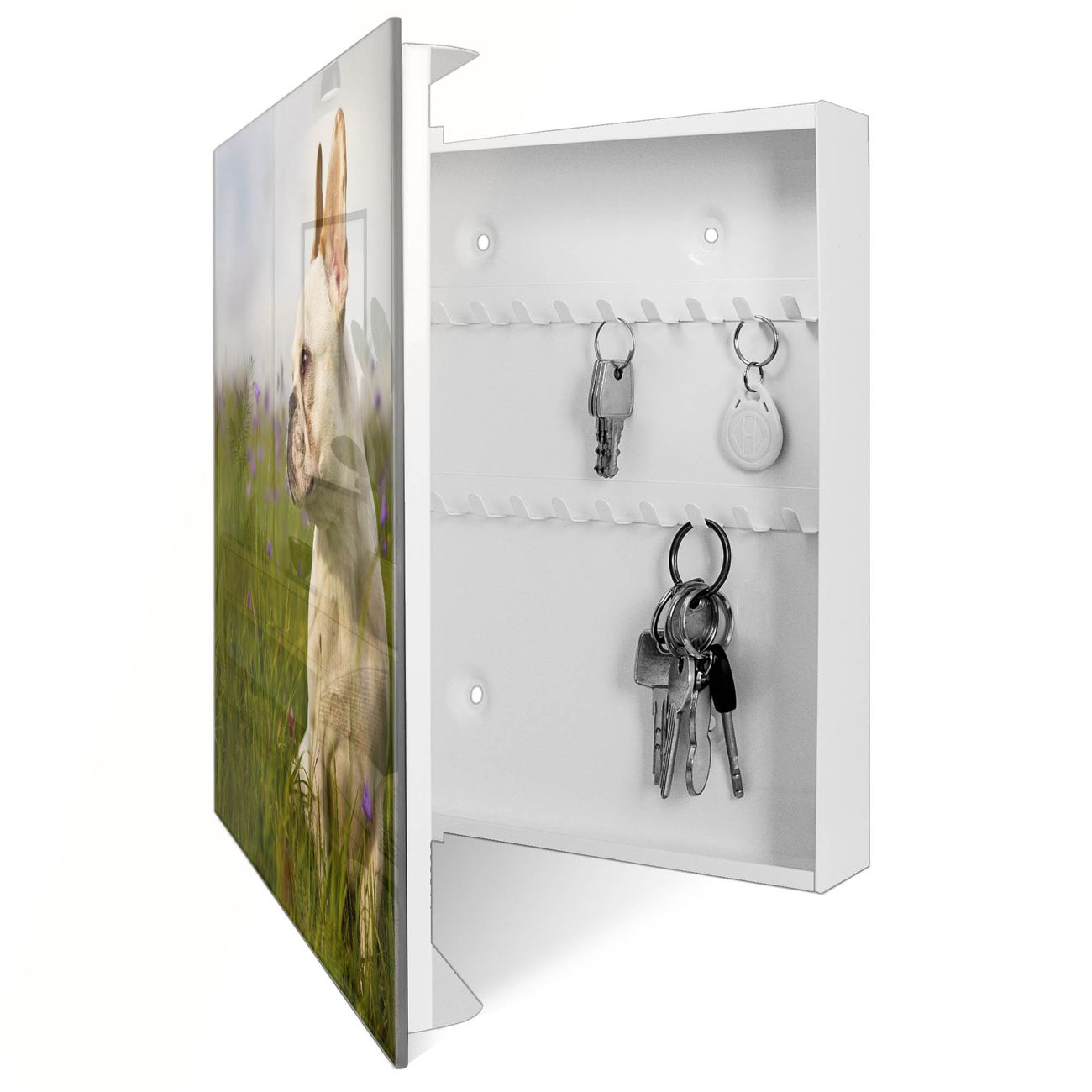 Bringe Ordnung und Eleganz in deinen Eingangsbereich mit dem banjado Schlüsselkasten Motiv Motiv Französische Bulldogge. Die moderne Schlüsselbox kombiniert funktionales Design mit hochwertiger Verarbeitung und wird so zu einem echten Hingucker in Flur, Büro oder Ferienwohnung. ✅ Stilvolle Schlüsselaufbewahrung mit Glasfront im Motiv Motiv Französische Bulldogge Der Design-Schlüsselkasten Motiv Motiv Französische Bulldogge bietet Platz für bis zu 50 Schlüssel, die auf 5 stabilen Reihen mit je 10 Haken übersichtlich verstaut werden. Mit seinen kompakten Maßen von 30 x 30 x 5 cm passt die Schlüsselbox perfekt auch in kleinere Räume. Der weiß lackierte Stahlkorpus mit rechts angeschlagenem Türscharnier harmoniert mit der Glasfront und fügt sich nahtlos in jedes Wohnambiente ein. Ob als Schlüsselorganizer für Zuhause oder als praktische Lösung für Büros, Praxen und Gewerbe, der banjado Schlüsselkasten sorgt für Ordnung und Übersicht. Dank der magnetischen, mit Kreidestiften beschreibbaren Glasfront kannst du Notizen anheften oder Termine direkt auf der Oberfläche festhalten. Die Schlüsselbox Motiv Motiv Französische Bulldogge zur Wandmontage wird inklusive Befestigungsmaterial geliefert und ist schnell angebracht. So hast du deine Schlüssel jederzeit griffbereit und zugleich stilvoll verstaut. Mit diesem banjado Schlüsselkasten Motiv Motiv Französische Bulldogge kombinierst du praktische Aufbewahrung mit stilvollem Wohndesign. Ob privat oder geschäftlich, die Schlüsselbox sorgt für mehr Ordnung, Übersicht und ein wohnliches Ambiente.Vorteile im Überblick