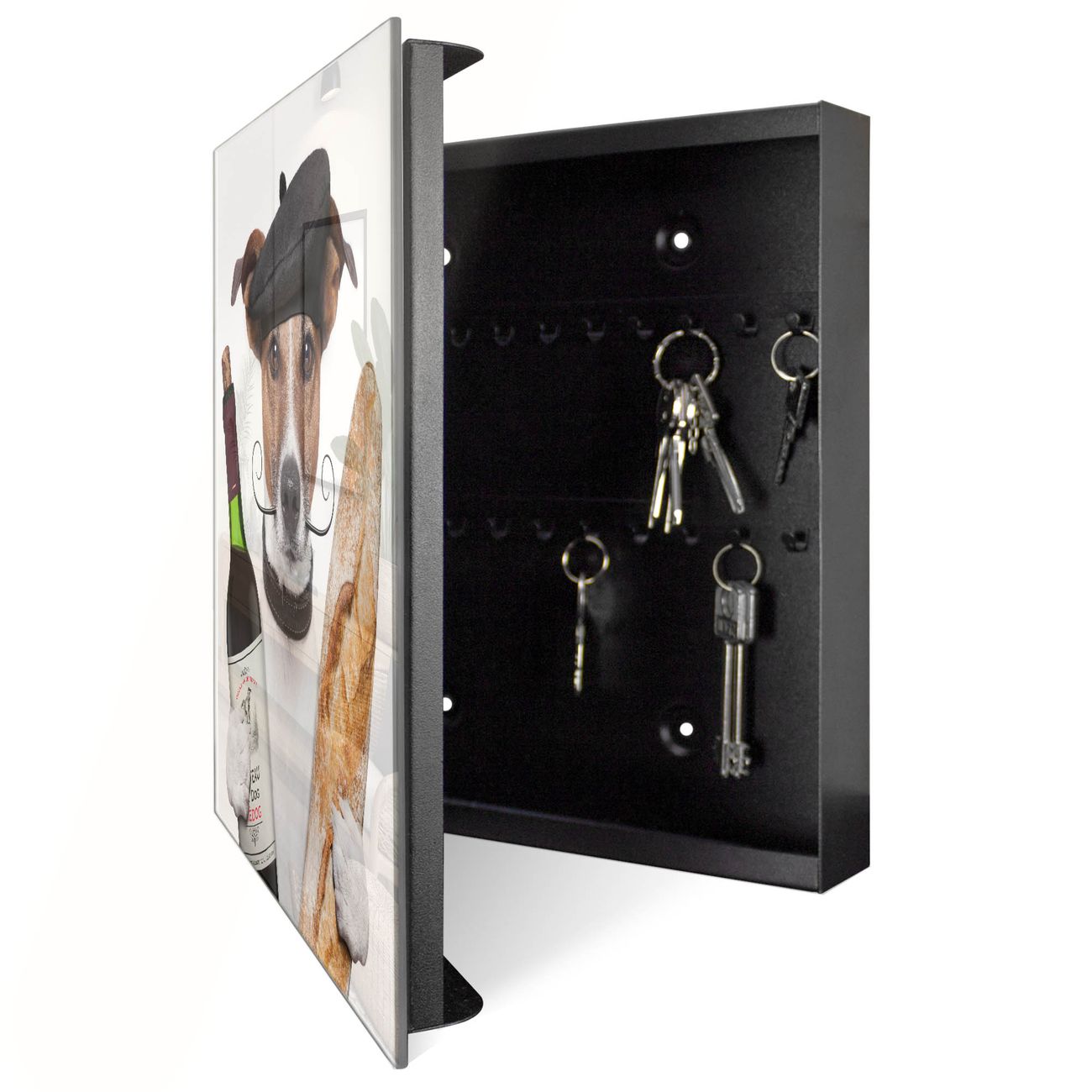 Bringe Ordnung und Eleganz in deinen Eingangsbereich mit dem banjado Schlüsselkasten Motiv Motiv Franzose Jack Russel. Die moderne Schlüsselbox kombiniert funktionales Design mit hochwertiger Verarbeitung und wird so zu einem echten Hingucker in Flur, Büro oder Ferienwohnung. ✅ Stilvolle Schlüsselaufbewahrung mit Glasfront im Motiv Motiv Franzose Jack Russel Der Design-Schlüsselkasten Motiv Motiv Franzose Jack Russel bietet Platz für bis zu 50 Schlüssel, die auf 5 stabilen Reihen mit je 10 Haken übersichtlich verstaut werden. Mit seinen kompakten Maßen von 30 x 30 x 5 cm passt die Schlüsselbox perfekt auch in kleinere Räume. Der schwarz lackierte Stahlkorpus mit rechts angeschlagenem Türscharnier harmoniert mit der Glasfront und fügt sich nahtlos in jedes Wohnambiente ein. Ob als Schlüsselorganizer für Zuhause oder als praktische Lösung für Büros, Praxen und Gewerbe, der banjado Schlüsselkasten sorgt für Ordnung und Übersicht. Dank der magnetischen, mit Kreidestiften beschreibbaren Glasfront kannst du Notizen anheften oder Termine direkt auf der Oberfläche festhalten. Die Schlüsselbox Motiv Motiv Franzose Jack Russel zur Wandmontage wird inklusive Befestigungsmaterial geliefert und ist schnell angebracht. So hast du deine Schlüssel jederzeit griffbereit und zugleich stilvoll verstaut. Mit diesem banjado Schlüsselkasten Motiv Motiv Franzose Jack Russel kombinierst du praktische Aufbewahrung mit stilvollem Wohndesign. Ob privat oder geschäftlich, die Schlüsselbox sorgt für mehr Ordnung, Übersicht und ein wohnliches Ambiente.Vorteile im Überblick