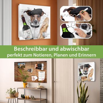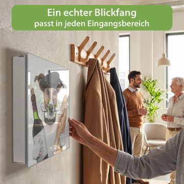 Bringe Ordnung und Eleganz in deinen Eingangsbereich mit dem banjado Schlüsselkasten Motiv Motiv Franzose Jack Russel. Die moderne Schlüsselbox kombiniert funktionales Design mit hochwertiger Verarbeitung und wird so zu einem echten Hingucker in Flur, Büro oder Ferienwohnung. ✅ Stilvolle Schlüsselaufbewahrung mit Glasfront im Motiv Motiv Franzose Jack Russel Der Design-Schlüsselkasten Motiv Motiv Franzose Jack Russel bietet Platz für bis zu 50 Schlüssel, die auf 5 stabilen Reihen mit je 10 Haken übersichtlich verstaut werden. Mit seinen kompakten Maßen von 30 x 30 x 5 cm passt die Schlüsselbox perfekt auch in kleinere Räume. Der weiß lackierte Stahlkorpus mit rechts angeschlagenem Türscharnier harmoniert mit der Glasfront und fügt sich nahtlos in jedes Wohnambiente ein. Ob als Schlüsselorganizer für Zuhause oder als praktische Lösung für Büros, Praxen und Gewerbe, der banjado Schlüsselkasten sorgt für Ordnung und Übersicht. Dank der magnetischen, mit Kreidestiften beschreibbaren Glasfront kannst du Notizen anheften oder Termine direkt auf der Oberfläche festhalten. Die Schlüsselbox Motiv Motiv Franzose Jack Russel zur Wandmontage wird inklusive Befestigungsmaterial geliefert und ist schnell angebracht. So hast du deine Schlüssel jederzeit griffbereit und zugleich stilvoll verstaut. Mit diesem banjado Schlüsselkasten Motiv Motiv Franzose Jack Russel kombinierst du praktische Aufbewahrung mit stilvollem Wohndesign. Ob privat oder geschäftlich, die Schlüsselbox sorgt für mehr Ordnung, Übersicht und ein wohnliches Ambiente.Vorteile im Überblick