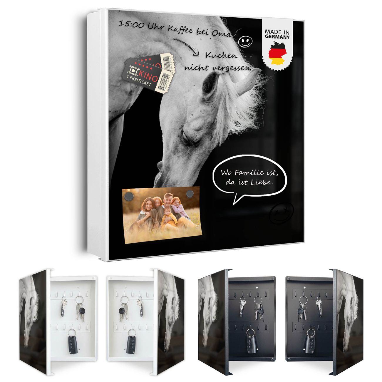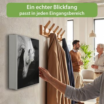 Bringe Ordnung und Eleganz in deinen Eingangsbereich mit dem banjado Schlüsselkasten Motiv Motiv Frederik. Die moderne Schlüsselbox kombiniert funktionales Design mit hochwertiger Verarbeitung und wird so zu einem echten Hingucker in Flur, Büro oder Ferienwohnung. ✅ Stilvolle Schlüsselaufbewahrung mit Motiv Motiv Frederik Der Design-Schlüsselkasten Motiv Motiv Frederik bietet Platz für bis zu 32 Schlüssel, die auf 4 stabilen Reihen mit je 8 Haken übersichtlich verstaut werden. Mit seinen kompakten Maßen von 30 x 30 x 5 cm passt die Schlüsselbox perfekt auch in kleinere Räume. Der weiß lackierte Stahlkorpus mit links angeschlagenem Türscharnier harmoniert mit gedruckten Folie auf der Front und fügt sich nahtlos in jedes Wohnambiente ein. Ob als Schlüsselorganizer für Zuhause oder als praktische Lösung für Büros, Praxen und Gewerbe, der banjado Schlüsselkasten sorgt für Ordnung und Übersicht. Dank der magnetischen, mit Kreidestiften beschreibbaren Folie auf der Front kannst du Notizen anheften oder Termine direkt auf der Oberfläche festhalten. Die Schlüsselbox Motiv Motiv Frederik zur Wandmontage wird inklusive Befestigungsmaterial geliefert und ist schnell angebracht. So hast du deine Schlüssel jederzeit griffbereit und zugleich stilvoll verstaut. Mit diesem banjado Schlüsselkasten Motiv Motiv Frederik kombinierst du praktische Aufbewahrung mit stilvollem Wohndesign. Ob privat oder geschäftlich, die Schlüsselbox sorgt für mehr Ordnung, Übersicht und ein wohnliches Ambiente.Vorteile im Überblick