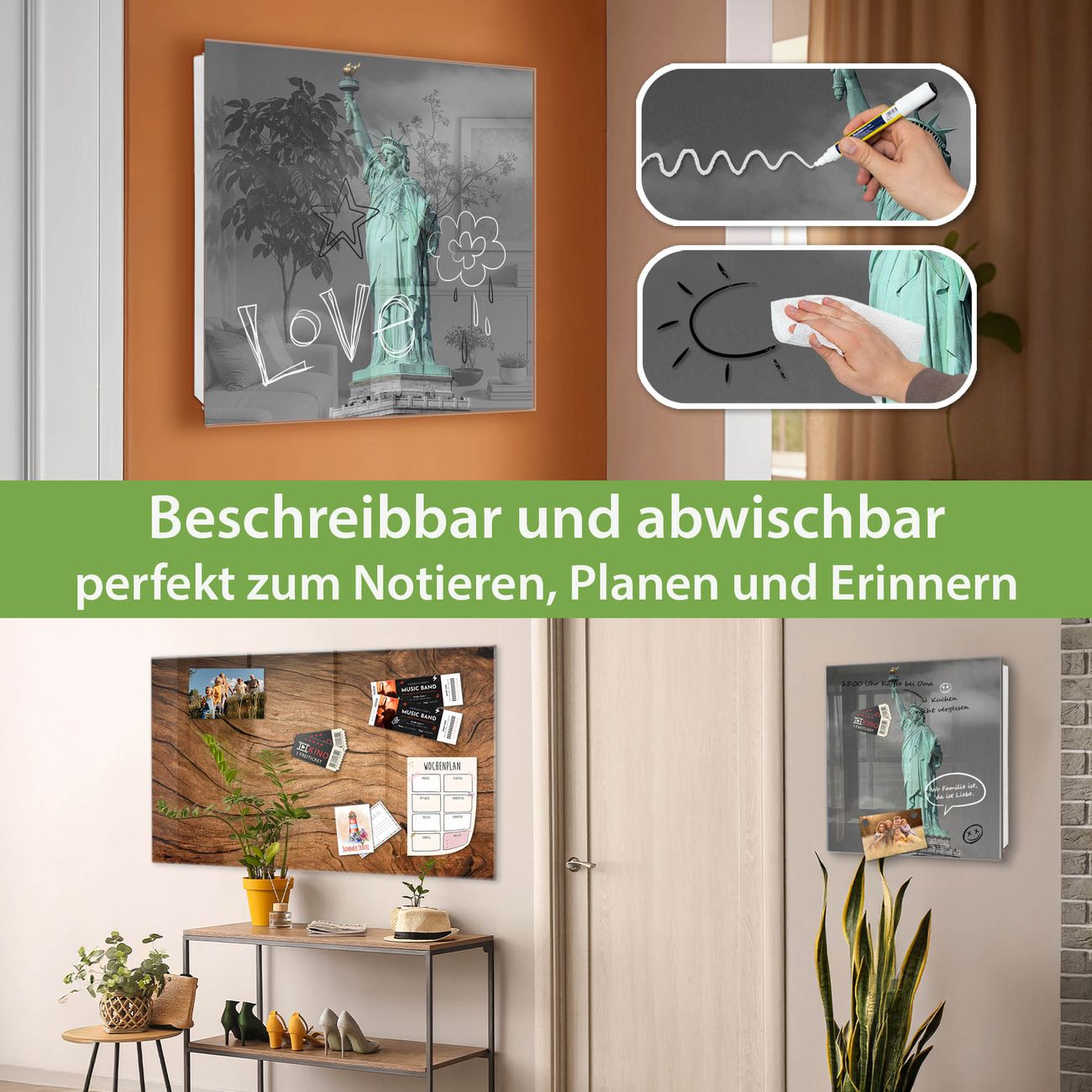 ✅ Magnetisch und mit Kreidestift beschreibbar, gehärtetes Glas, links angeschlagene TürOrdnung und Design in einem