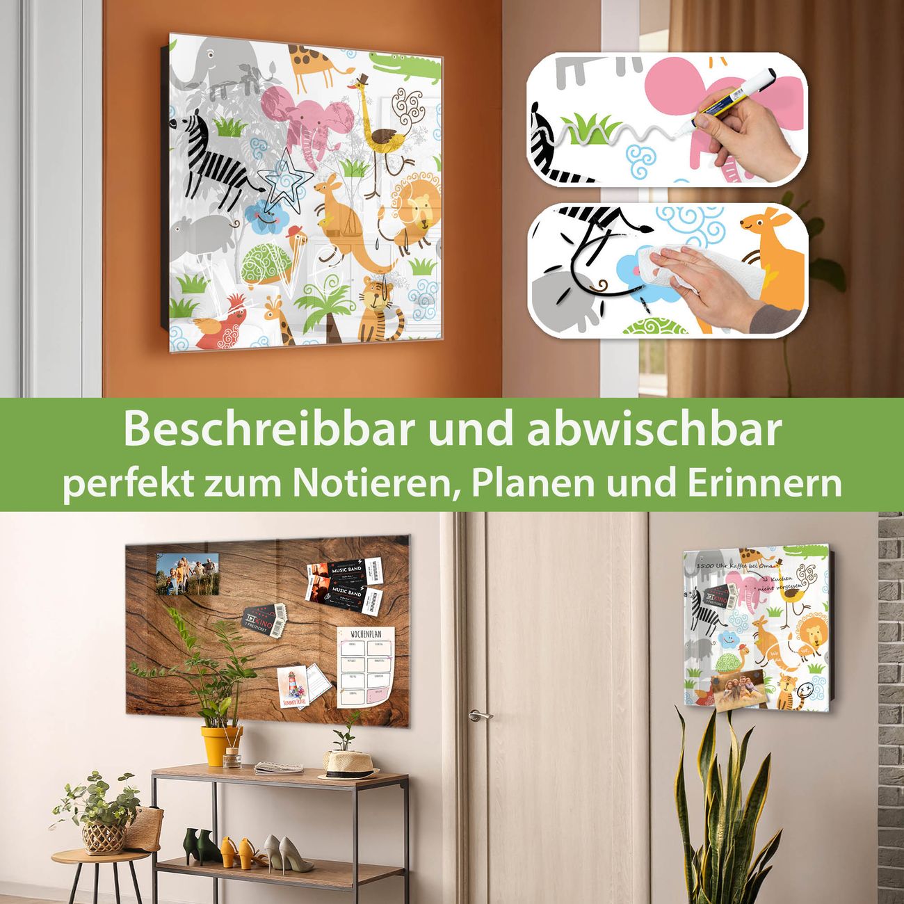 Bringe Ordnung und Eleganz in deinen Eingangsbereich mit dem banjado Schlüsselkasten Motiv Motiv Fröhliche Tiere. Die moderne Schlüsselbox kombiniert funktionales Design mit hochwertiger Verarbeitung und wird so zu einem echten Hingucker in Flur, Büro oder Ferienwohnung. ✅ Stilvolle Schlüsselaufbewahrung mit Glasfront im Motiv Motiv Fröhliche Tiere Der Design-Schlüsselkasten Motiv Motiv Fröhliche Tiere bietet Platz für bis zu 50 Schlüssel, die auf 5 stabilen Reihen mit je 10 Haken übersichtlich verstaut werden. Mit seinen kompakten Maßen von 30 x 30 x 5 cm passt die Schlüsselbox perfekt auch in kleinere Räume. Der schwarz lackierte Stahlkorpus mit rechts angeschlagenem Türscharnier harmoniert mit der Glasfront und fügt sich nahtlos in jedes Wohnambiente ein. Ob als Schlüsselorganizer für Zuhause oder als praktische Lösung für Büros, Praxen und Gewerbe, der banjado Schlüsselkasten sorgt für Ordnung und Übersicht. Dank der magnetischen, mit Kreidestiften beschreibbaren Glasfront kannst du Notizen anheften oder Termine direkt auf der Oberfläche festhalten. Die Schlüsselbox Motiv Motiv Fröhliche Tiere zur Wandmontage wird inklusive Befestigungsmaterial geliefert und ist schnell angebracht. So hast du deine Schlüssel jederzeit griffbereit und zugleich stilvoll verstaut. Mit diesem banjado Schlüsselkasten Motiv Motiv Fröhliche Tiere kombinierst du praktische Aufbewahrung mit stilvollem Wohndesign. Ob privat oder geschäftlich, die Schlüsselbox sorgt für mehr Ordnung, Übersicht und ein wohnliches Ambiente.Vorteile im Überblick