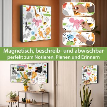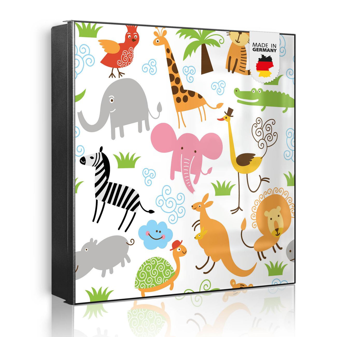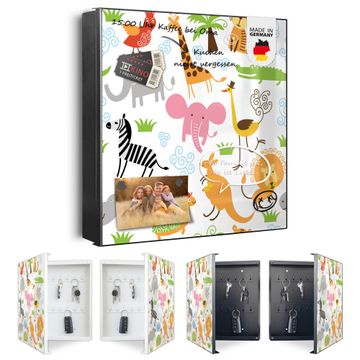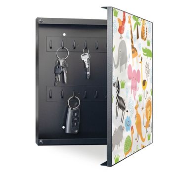 Bringe Ordnung und Eleganz in deinen Eingangsbereich mit dem banjado Schlüsselkasten Motiv Motiv Fröhliche Tiere. Die moderne Schlüsselbox kombiniert funktionales Design mit hochwertiger Verarbeitung und wird so zu einem echten Hingucker in Flur, Büro oder Ferienwohnung. ✅ Stilvolle Schlüsselaufbewahrung mit Motiv Motiv Fröhliche Tiere Der Design-Schlüsselkasten Motiv Motiv Fröhliche Tiere bietet Platz für bis zu 32 Schlüssel, die auf 4 stabilen Reihen mit je 8 Haken übersichtlich verstaut werden. Mit seinen kompakten Maßen von 30 x 30 x 5 cm passt die Schlüsselbox perfekt auch in kleinere Räume. Der schwarz lackierte Stahlkorpus mit rechts angeschlagenem Türscharnier harmoniert mit gedruckten Folie auf der Front und fügt sich nahtlos in jedes Wohnambiente ein. Ob als Schlüsselorganizer für Zuhause oder als praktische Lösung für Büros, Praxen und Gewerbe, der banjado Schlüsselkasten sorgt für Ordnung und Übersicht. Dank der magnetischen, mit Kreidestiften beschreibbaren Folie auf der Front kannst du Notizen anheften oder Termine direkt auf der Oberfläche festhalten. Die Schlüsselbox Motiv Motiv Fröhliche Tiere zur Wandmontage wird inklusive Befestigungsmaterial geliefert und ist schnell angebracht. So hast du deine Schlüssel jederzeit griffbereit und zugleich stilvoll verstaut. Mit diesem banjado Schlüsselkasten Motiv Motiv Fröhliche Tiere kombinierst du praktische Aufbewahrung mit stilvollem Wohndesign. Ob privat oder geschäftlich, die Schlüsselbox sorgt für mehr Ordnung, Übersicht und ein wohnliches Ambiente.Vorteile im Überblick