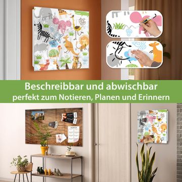 Bringe Ordnung und Eleganz in deinen Eingangsbereich mit dem banjado Schlüsselkasten Motiv Motiv Fröhliche Tiere. Die moderne Schlüsselbox kombiniert funktionales Design mit hochwertiger Verarbeitung und wird so zu einem echten Hingucker in Flur, Büro oder Ferienwohnung. ✅ Stilvolle Schlüsselaufbewahrung mit Glasfront im Motiv Motiv Fröhliche Tiere Der Design-Schlüsselkasten Motiv Motiv Fröhliche Tiere bietet Platz für bis zu 50 Schlüssel, die auf 5 stabilen Reihen mit je 10 Haken übersichtlich verstaut werden. Mit seinen kompakten Maßen von 30 x 30 x 5 cm passt die Schlüsselbox perfekt auch in kleinere Räume. Der weiß lackierte Stahlkorpus mit rechts angeschlagenem Türscharnier harmoniert mit der Glasfront und fügt sich nahtlos in jedes Wohnambiente ein. Ob als Schlüsselorganizer für Zuhause oder als praktische Lösung für Büros, Praxen und Gewerbe, der banjado Schlüsselkasten sorgt für Ordnung und Übersicht. Dank der magnetischen, mit Kreidestiften beschreibbaren Glasfront kannst du Notizen anheften oder Termine direkt auf der Oberfläche festhalten. Die Schlüsselbox Motiv Motiv Fröhliche Tiere zur Wandmontage wird inklusive Befestigungsmaterial geliefert und ist schnell angebracht. So hast du deine Schlüssel jederzeit griffbereit und zugleich stilvoll verstaut. Mit diesem banjado Schlüsselkasten Motiv Motiv Fröhliche Tiere kombinierst du praktische Aufbewahrung mit stilvollem Wohndesign. Ob privat oder geschäftlich, die Schlüsselbox sorgt für mehr Ordnung, Übersicht und ein wohnliches Ambiente.Vorteile im Überblick