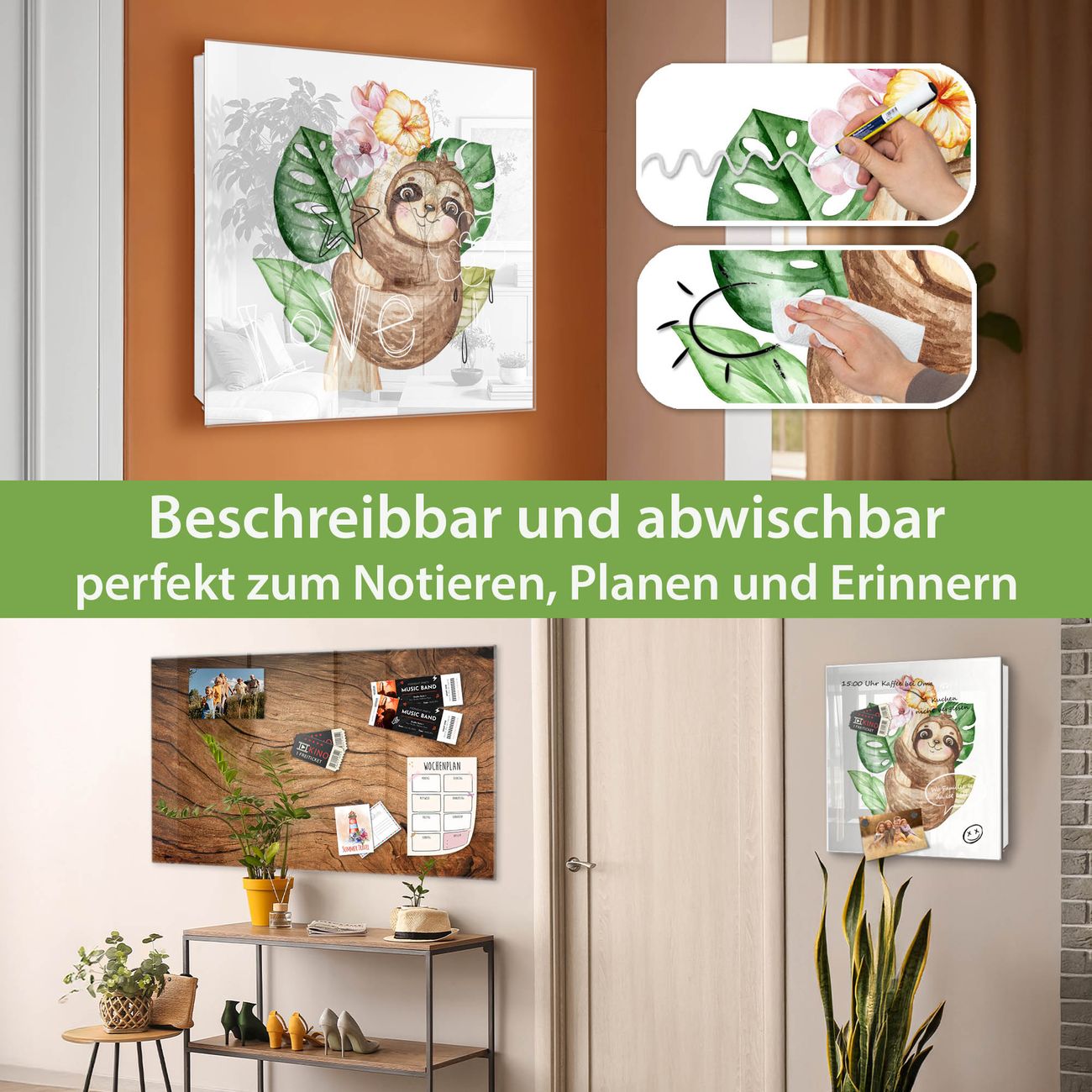 Bringe Ordnung und Eleganz in deinen Eingangsbereich mit dem banjado Schlüsselkasten Motiv Motiv Fröhliches Faultier. Die moderne Schlüsselbox kombiniert funktionales Design mit hochwertiger Verarbeitung und wird so zu einem echten Hingucker in Flur, Büro oder Ferienwohnung. ✅ Stilvolle Schlüsselaufbewahrung mit Glasfront im Motiv Motiv Fröhliches Faultier Der Design-Schlüsselkasten Motiv Motiv Fröhliches Faultier bietet Platz für bis zu 50 Schlüssel, die auf 5 stabilen Reihen mit je 10 Haken übersichtlich verstaut werden. Mit seinen kompakten Maßen von 30 x 30 x 5 cm passt die Schlüsselbox perfekt auch in kleinere Räume. Der weiß lackierte Stahlkorpus mit rechts angeschlagenem Türscharnier harmoniert mit der Glasfront und fügt sich nahtlos in jedes Wohnambiente ein. Ob als Schlüsselorganizer für Zuhause oder als praktische Lösung für Büros, Praxen und Gewerbe, der banjado Schlüsselkasten sorgt für Ordnung und Übersicht. Dank der magnetischen, mit Kreidestiften beschreibbaren Glasfront kannst du Notizen anheften oder Termine direkt auf der Oberfläche festhalten. Die Schlüsselbox Motiv Motiv Fröhliches Faultier zur Wandmontage wird inklusive Befestigungsmaterial geliefert und ist schnell angebracht. So hast du deine Schlüssel jederzeit griffbereit und zugleich stilvoll verstaut. Mit diesem banjado Schlüsselkasten Motiv Motiv Fröhliches Faultier kombinierst du praktische Aufbewahrung mit stilvollem Wohndesign. Ob privat oder geschäftlich, die Schlüsselbox sorgt für mehr Ordnung, Übersicht und ein wohnliches Ambiente.Vorteile im Überblick