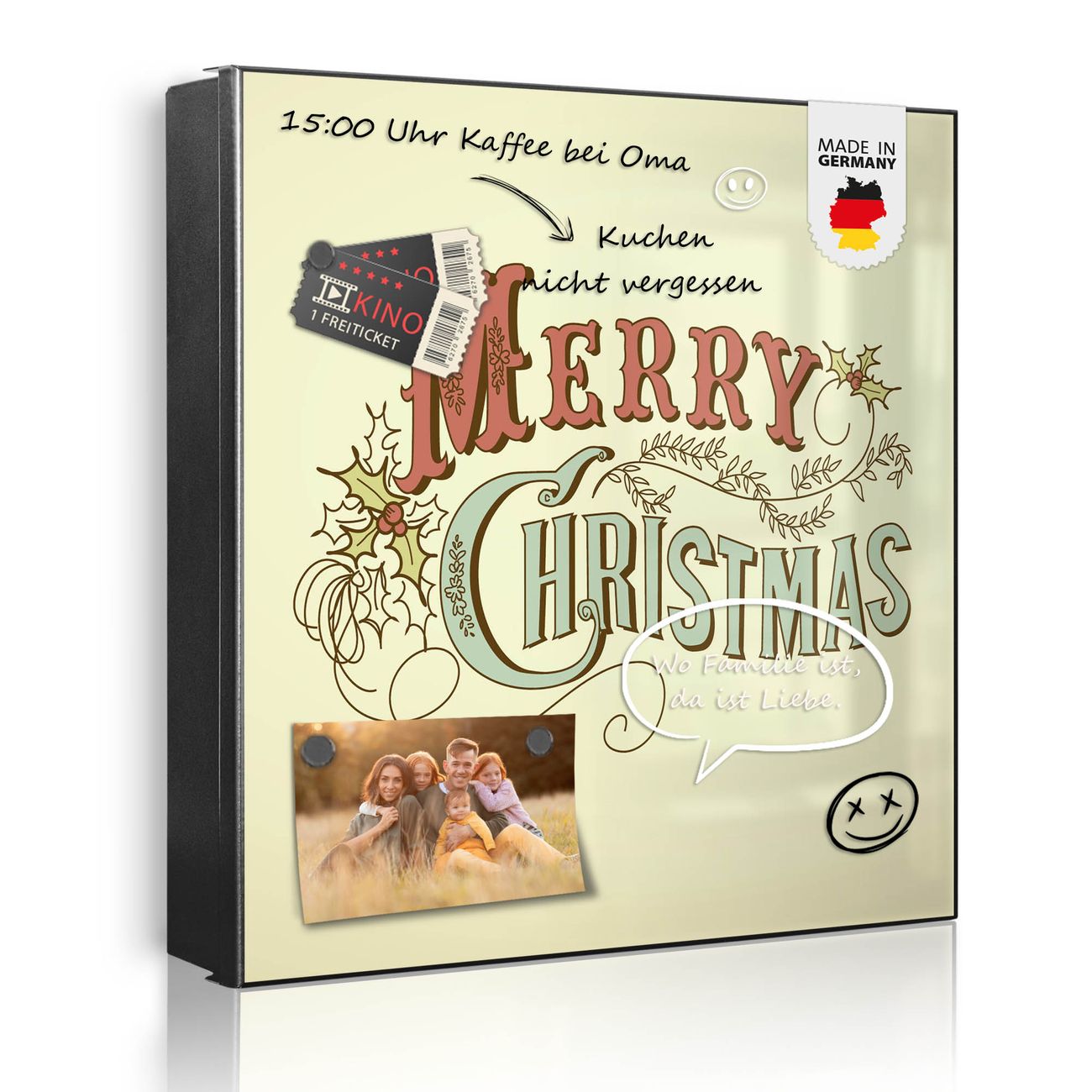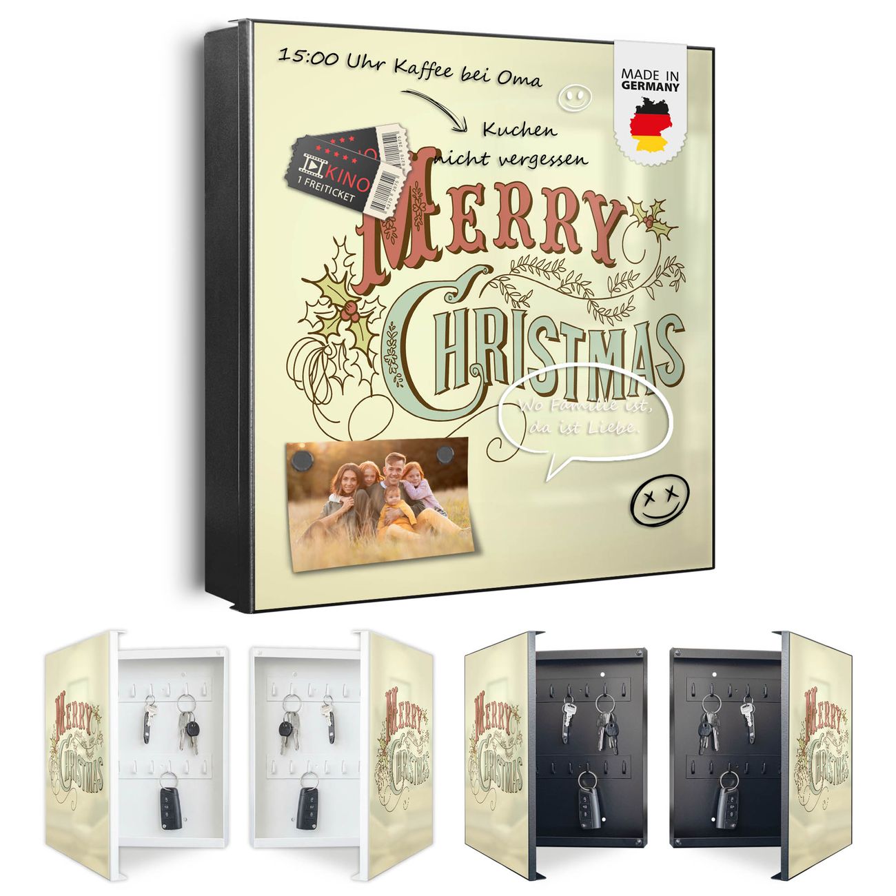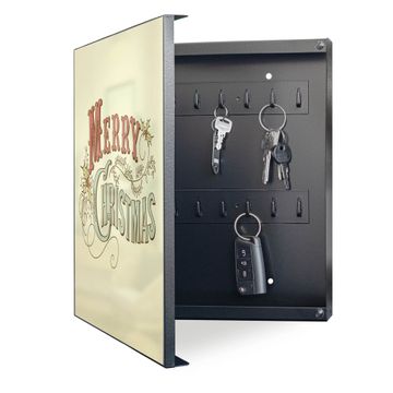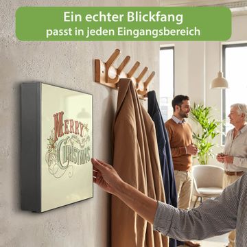 Bringe Ordnung und Eleganz in deinen Eingangsbereich mit dem banjado Schlüsselkasten Motiv Motiv Frohes Fest. Die moderne Schlüsselbox kombiniert funktionales Design mit hochwertiger Verarbeitung und wird so zu einem echten Hingucker in Flur, Büro oder Ferienwohnung. ✅ Stilvolle Schlüsselaufbewahrung mit Motiv Motiv Frohes Fest Der Design-Schlüsselkasten Motiv Motiv Frohes Fest bietet Platz für bis zu 32 Schlüssel, die auf 4 stabilen Reihen mit je 8 Haken übersichtlich verstaut werden. Mit seinen kompakten Maßen von 30 x 30 x 5 cm passt die Schlüsselbox perfekt auch in kleinere Räume. Der schwarz lackierte Stahlkorpus mit links angeschlagenem Türscharnier harmoniert mit gedruckten Folie auf der Front und fügt sich nahtlos in jedes Wohnambiente ein. Ob als Schlüsselorganizer für Zuhause oder als praktische Lösung für Büros, Praxen und Gewerbe, der banjado Schlüsselkasten sorgt für Ordnung und Übersicht. Dank der magnetischen, mit Kreidestiften beschreibbaren Folie auf der Front kannst du Notizen anheften oder Termine direkt auf der Oberfläche festhalten. Die Schlüsselbox Motiv Motiv Frohes Fest zur Wandmontage wird inklusive Befestigungsmaterial geliefert und ist schnell angebracht. So hast du deine Schlüssel jederzeit griffbereit und zugleich stilvoll verstaut. Mit diesem banjado Schlüsselkasten Motiv Motiv Frohes Fest kombinierst du praktische Aufbewahrung mit stilvollem Wohndesign. Ob privat oder geschäftlich, die Schlüsselbox sorgt für mehr Ordnung, Übersicht und ein wohnliches Ambiente.Vorteile im Überblick