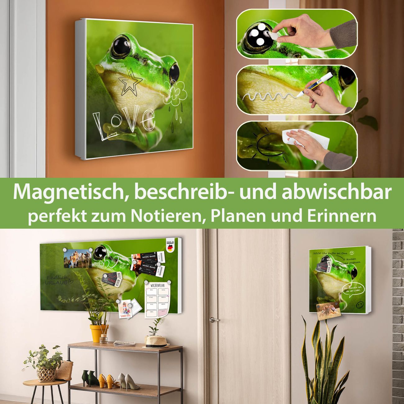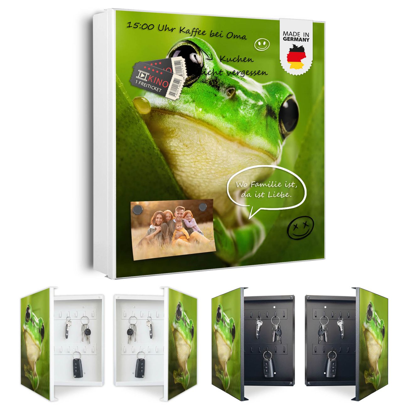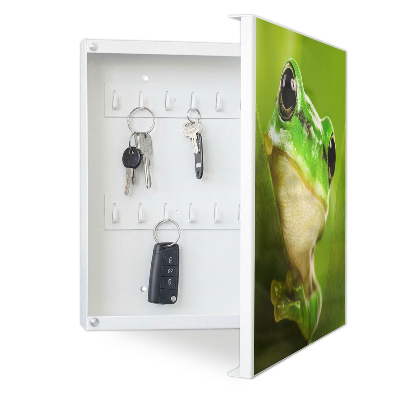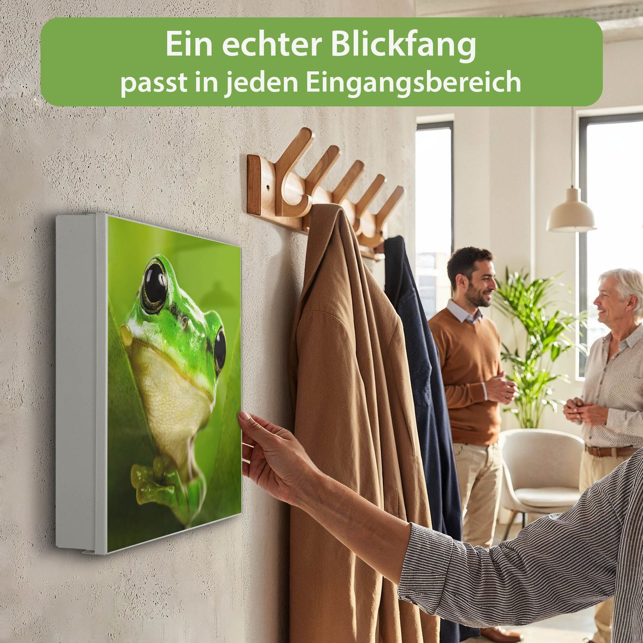 Bringe Ordnung und Eleganz in deinen Eingangsbereich mit dem banjado Schlüsselkasten Motiv Motiv Frosch. Die moderne Schlüsselbox kombiniert funktionales Design mit hochwertiger Verarbeitung und wird so zu einem echten Hingucker in Flur, Büro oder Ferienwohnung. ✅ Stilvolle Schlüsselaufbewahrung mit Motiv Motiv Frosch Der Design-Schlüsselkasten Motiv Motiv Frosch bietet Platz für bis zu 32 Schlüssel, die auf 4 stabilen Reihen mit je 8 Haken übersichtlich verstaut werden. Mit seinen kompakten Maßen von 30 x 30 x 5 cm passt die Schlüsselbox perfekt auch in kleinere Räume. Der weiß lackierte Stahlkorpus mit rechts angeschlagenem Türscharnier harmoniert mit gedruckten Folie auf der Front und fügt sich nahtlos in jedes Wohnambiente ein. Ob als Schlüsselorganizer für Zuhause oder als praktische Lösung für Büros, Praxen und Gewerbe, der banjado Schlüsselkasten sorgt für Ordnung und Übersicht. Dank der magnetischen, mit Kreidestiften beschreibbaren Folie auf der Front kannst du Notizen anheften oder Termine direkt auf der Oberfläche festhalten. Die Schlüsselbox Motiv Motiv Frosch zur Wandmontage wird inklusive Befestigungsmaterial geliefert und ist schnell angebracht. So hast du deine Schlüssel jederzeit griffbereit und zugleich stilvoll verstaut. Mit diesem banjado Schlüsselkasten Motiv Motiv Frosch kombinierst du praktische Aufbewahrung mit stilvollem Wohndesign. Ob privat oder geschäftlich, die Schlüsselbox sorgt für mehr Ordnung, Übersicht und ein wohnliches Ambiente.Vorteile im Überblick
