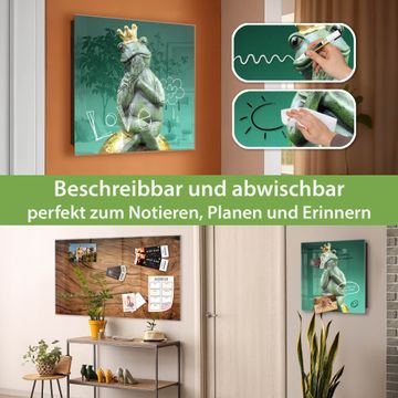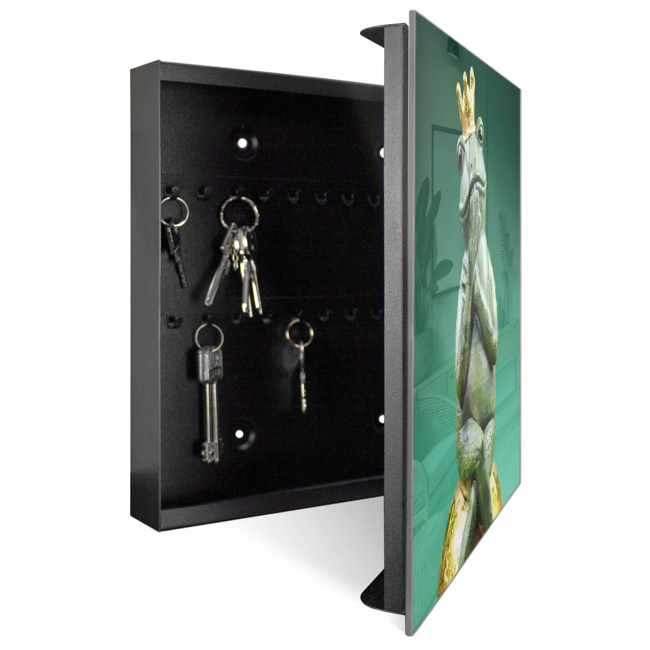 Bringe Ordnung und Eleganz in deinen Eingangsbereich mit dem banjado Schlüsselkasten Motiv Motiv Froschkönig. Die moderne Schlüsselbox kombiniert funktionales Design mit hochwertiger Verarbeitung und wird so zu einem echten Hingucker in Flur, Büro oder Ferienwohnung. ✅ Stilvolle Schlüsselaufbewahrung mit Glasfront im Motiv Motiv Froschkönig Der Design-Schlüsselkasten Motiv Motiv Froschkönig bietet Platz für bis zu 50 Schlüssel, die auf 5 stabilen Reihen mit je 10 Haken übersichtlich verstaut werden. Mit seinen kompakten Maßen von 30 x 30 x 5 cm passt die Schlüsselbox perfekt auch in kleinere Räume. Der schwarz lackierte Stahlkorpus mit rechts angeschlagenem Türscharnier harmoniert mit der Glasfront und fügt sich nahtlos in jedes Wohnambiente ein. Ob als Schlüsselorganizer für Zuhause oder als praktische Lösung für Büros, Praxen und Gewerbe, der banjado Schlüsselkasten sorgt für Ordnung und Übersicht. Dank der magnetischen, mit Kreidestiften beschreibbaren Glasfront kannst du Notizen anheften oder Termine direkt auf der Oberfläche festhalten. Die Schlüsselbox Motiv Motiv Froschkönig zur Wandmontage wird inklusive Befestigungsmaterial geliefert und ist schnell angebracht. So hast du deine Schlüssel jederzeit griffbereit und zugleich stilvoll verstaut. Mit diesem banjado Schlüsselkasten Motiv Motiv Froschkönig kombinierst du praktische Aufbewahrung mit stilvollem Wohndesign. Ob privat oder geschäftlich, die Schlüsselbox sorgt für mehr Ordnung, Übersicht und ein wohnliches Ambiente.Vorteile im Überblick